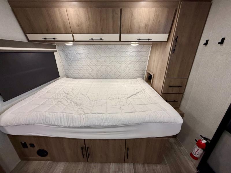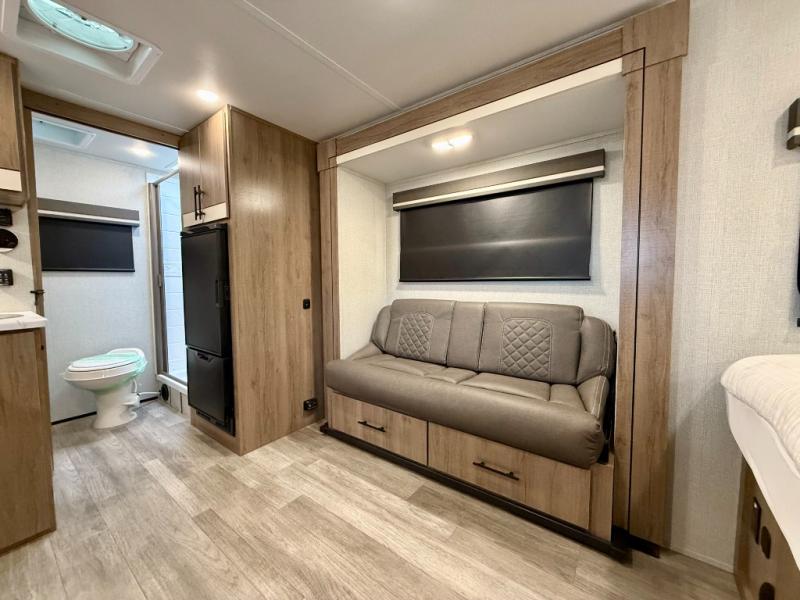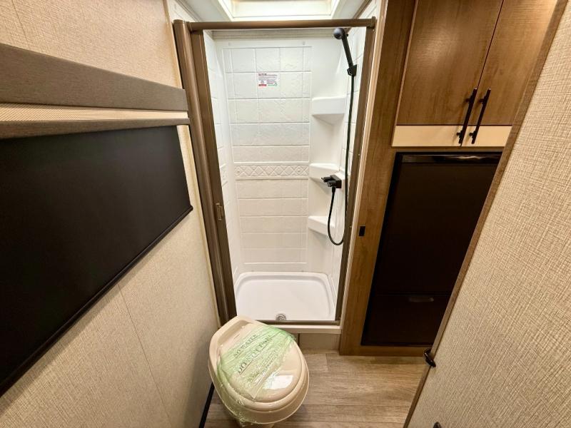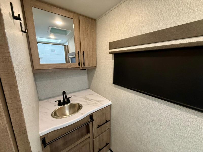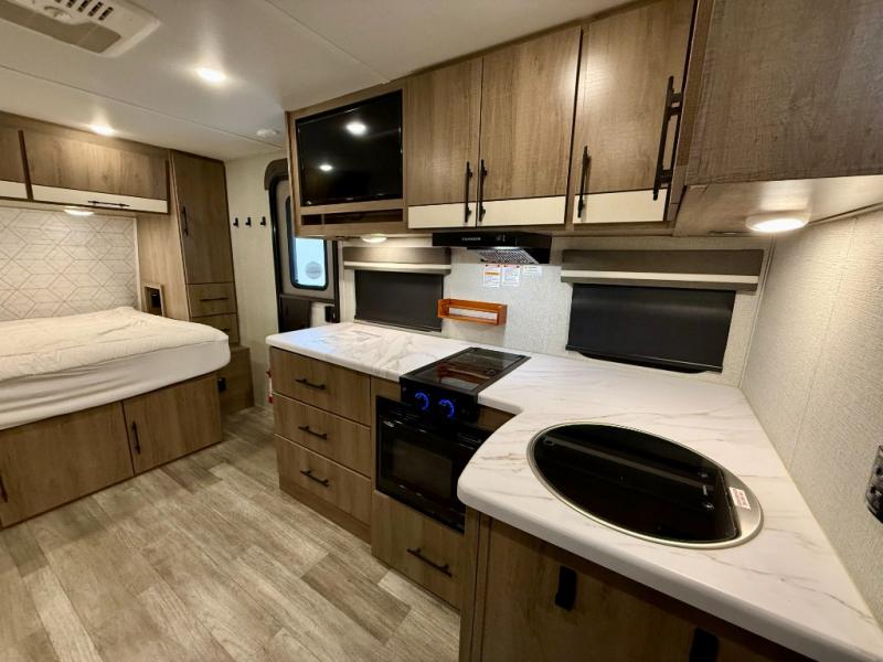 Pack your bags and head out on a fun camping trip in this travel trailer! The front queen bed offers a comfortable place to sleep at night, as well as the roll-over sleeper sofa slide. You can hang your jacket up on one of the coat hooks when you enter, and then start preparing a delicious meal on the two burner cooktop. You even have an outside griddle to fry up the catch of the day. The full rear bathroom has a walk-in shower with skylight to freshen up in and overhead cabinets for your toiletries!