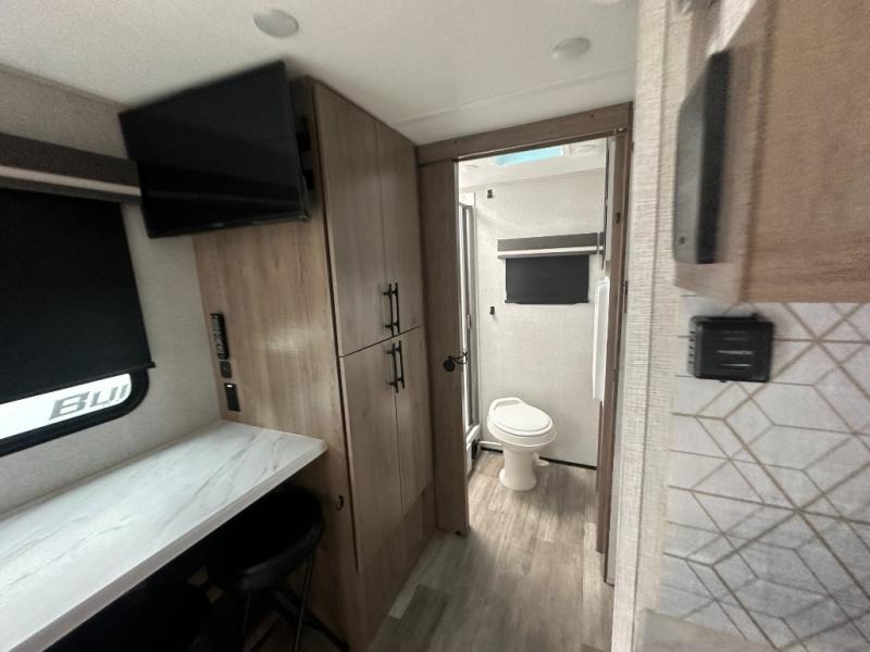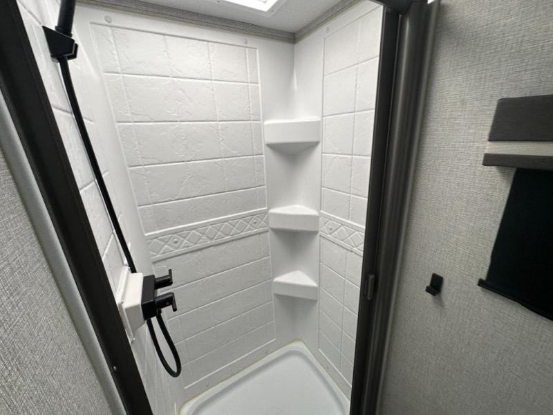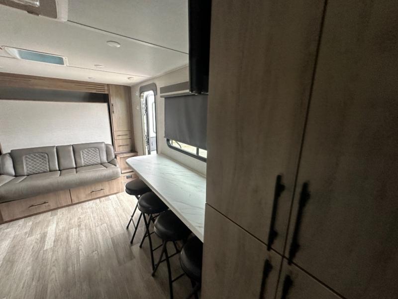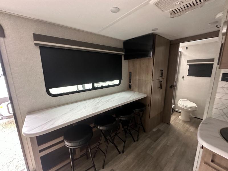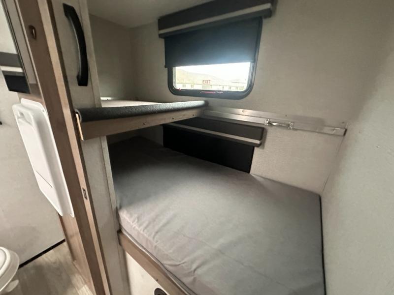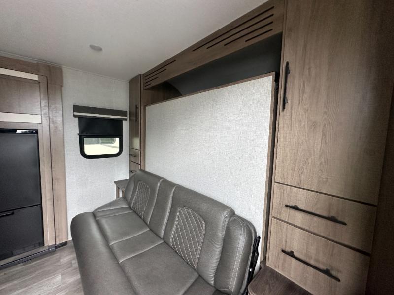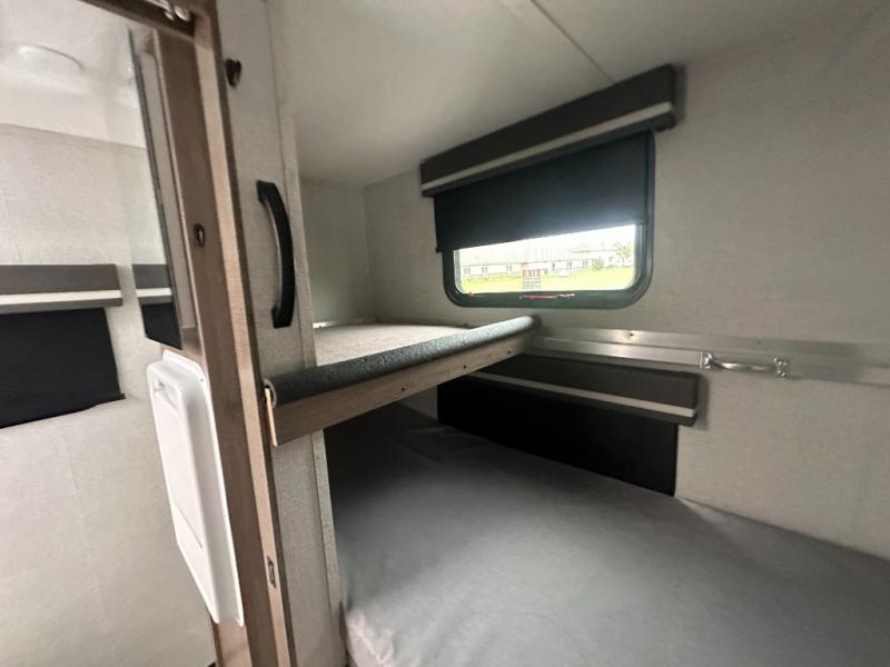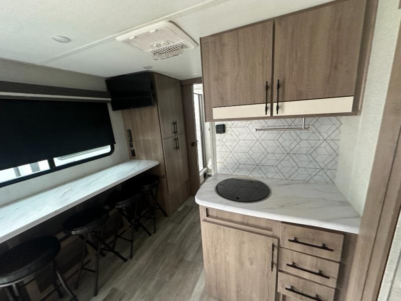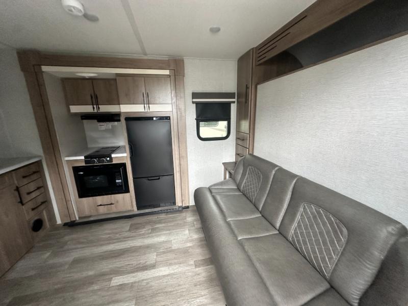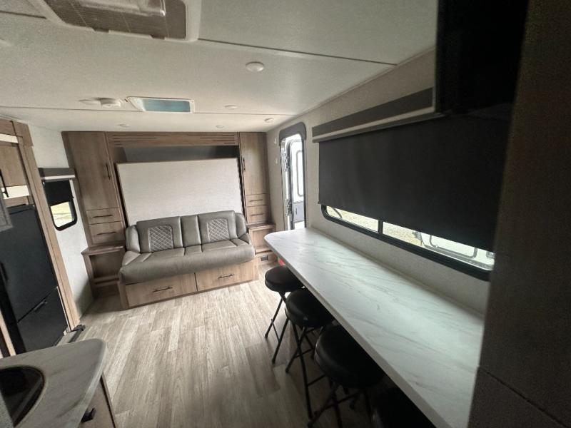 You will feel right at home in this travel trailer! Everyone will have a comfortable place to sleep between the front queen Murphy bed which can transform into a sofa and the 32" x 72" bunk beds. After you have prepared a delicious meal on the two burner cooktop or outside griddle, you can enjoy it at the bar tabletop dinette with four stools for seating. The full bathroom has a walk-in shower with skylight to let in natural lighting and a flip-up sink to save on space!