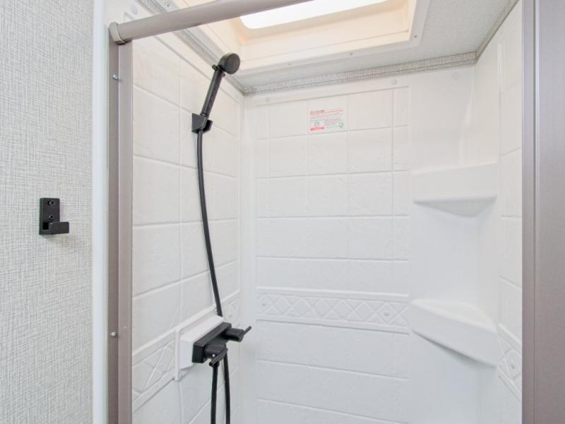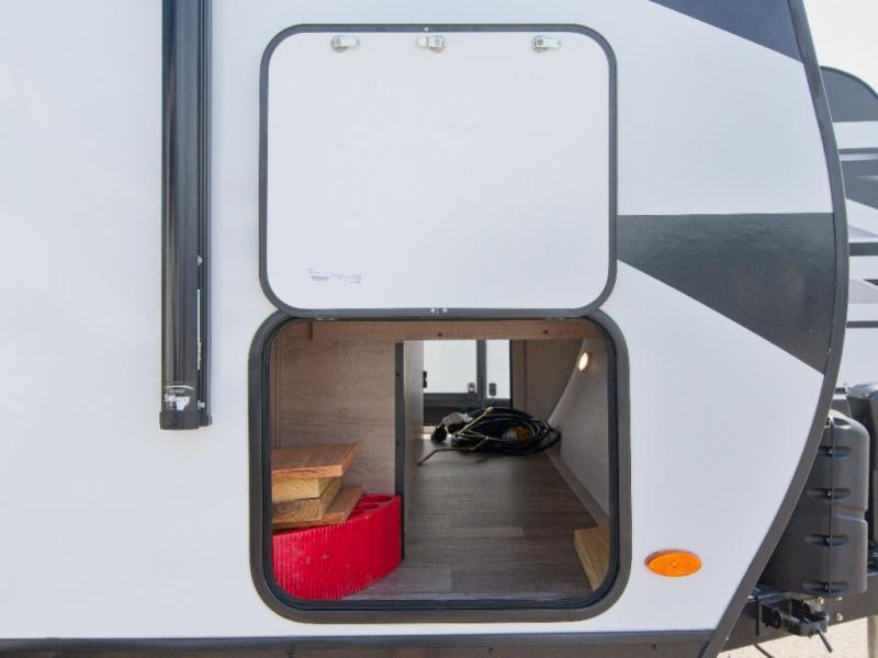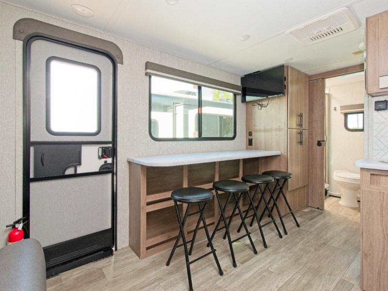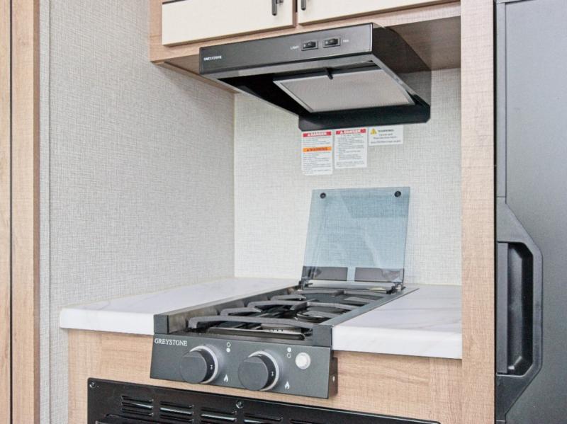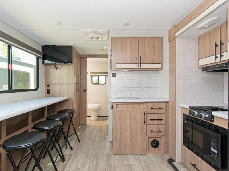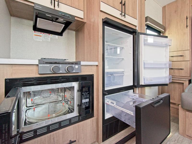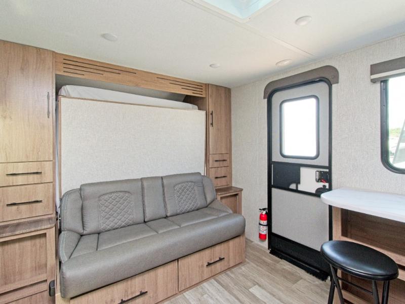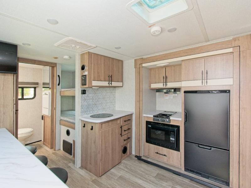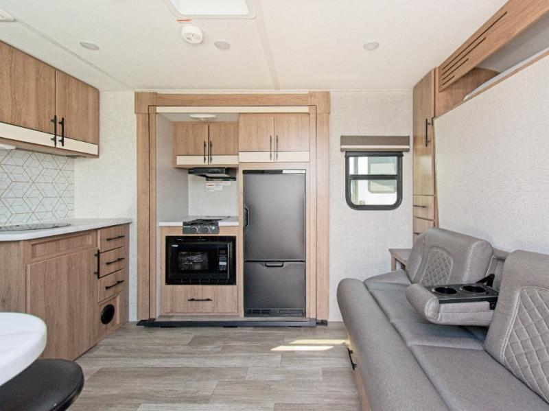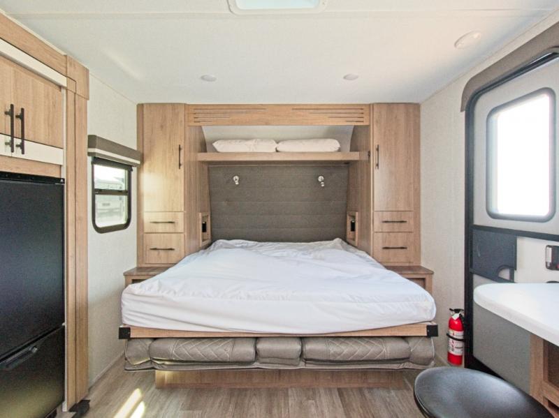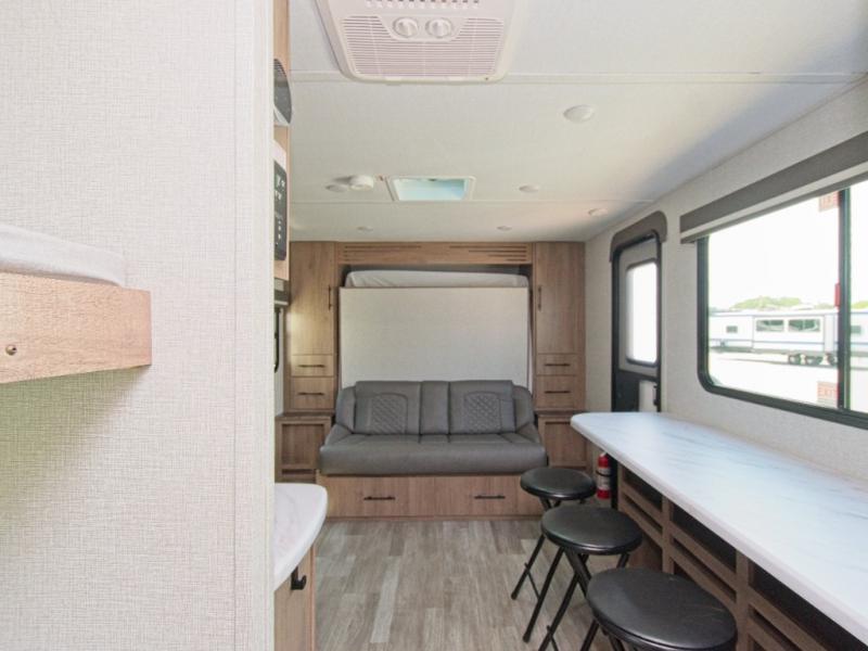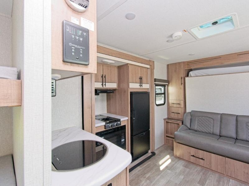 Inside, you’ll find a smart layout with rear bunk beds that are perfect for kids, friends, or extra storage. The queen Murphy bed at the front maximizes space, providing a comfortable night’s sleep while converting into a sofa during the day. The kitchen is fully equipped with modern appliances, including a two-burner cooktop, microwave, refrigerator, and stainless steel sink—ideal for cooking meals on the go. The spacious bathroom with shower adds extra convenience, making this trailer a true home away from home.