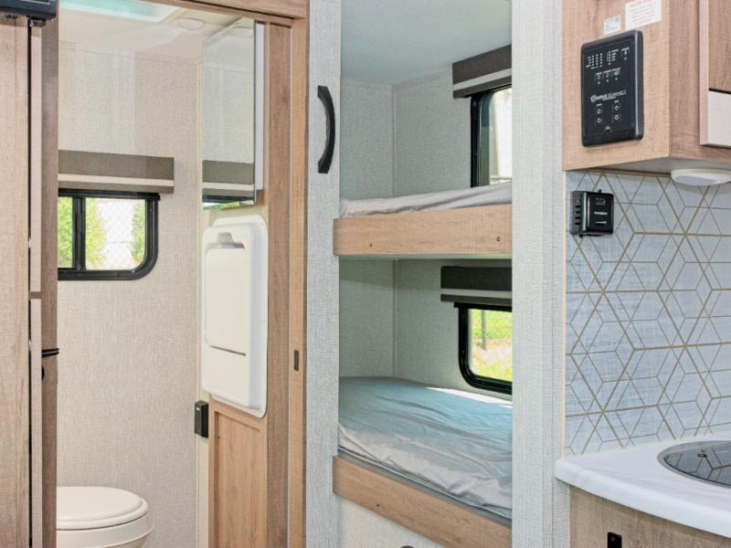 The 2023 Grand Design Imagine AIM 18BH is the perfect lightweight travel trailer for families or adventurers looking to enjoy comfort, style, and durability in a compact package. Designed to be easily towed by many midsize SUVs and small trucks, this bunkhouse model proves that you don’t have to sacrifice features when choosing a smaller RV.