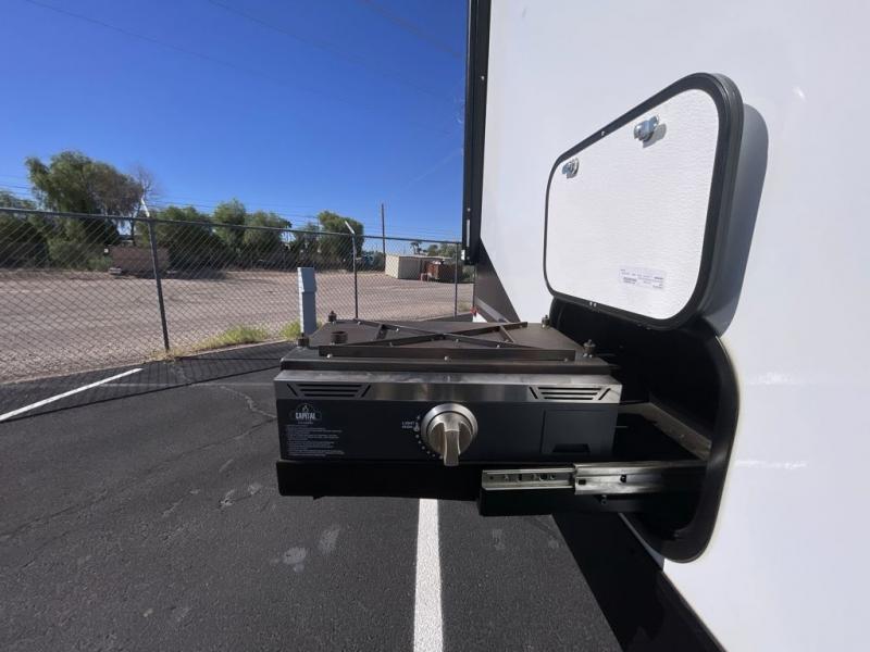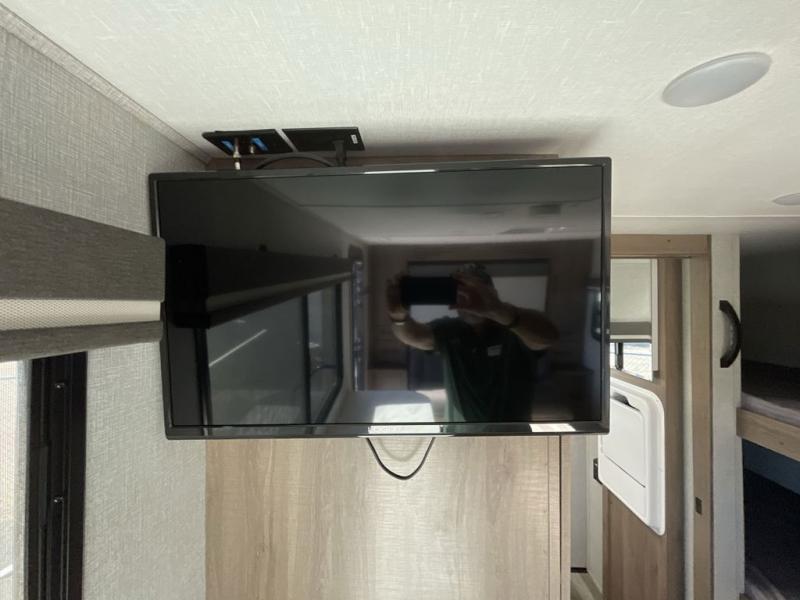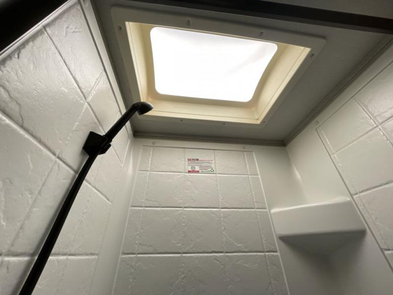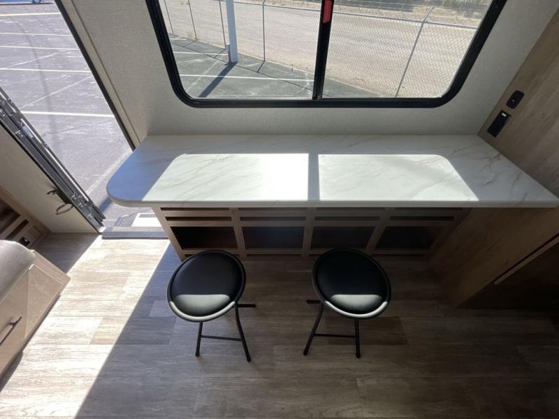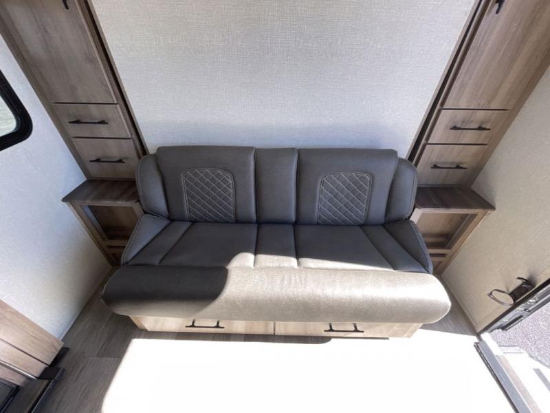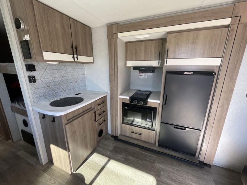 You will feel right at home in this travel trailer! Everyone will have a comfortable place to sleep between the front queen Murphy bed which can transform into a sofa and the 32" x 72" bunk beds. After you have prepared a delicious meal on the two burner cooktop or outside griddle, you can enjoy it at the bar tabletop dinette with four stools for seating. The full bathroom has a walk-in shower with skylight to let in natural lighting and a flip-up sink to save on space!