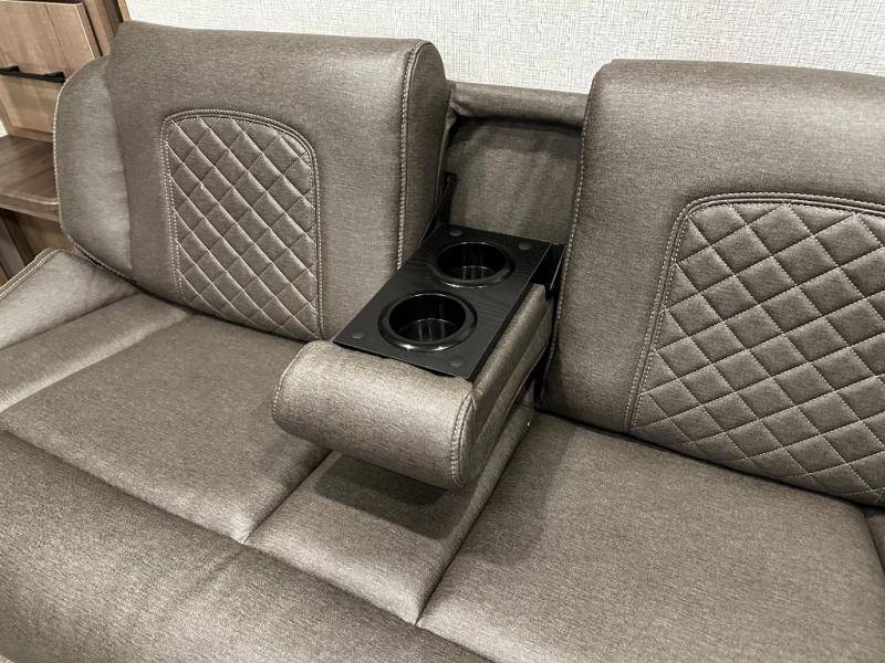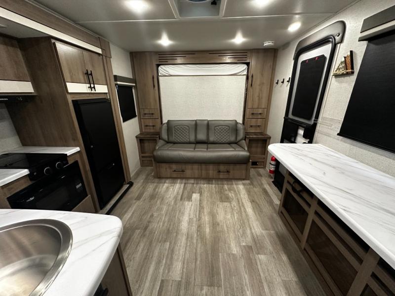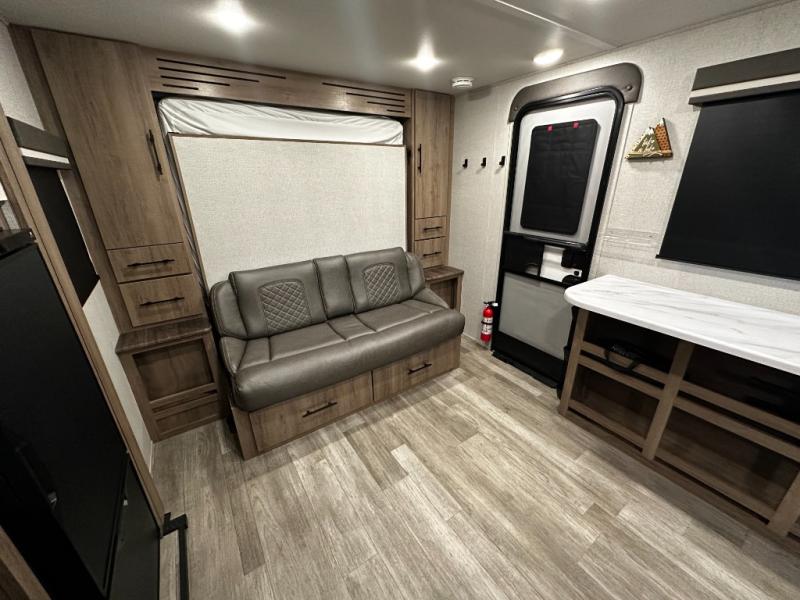 Step inside and you’ll immediately notice the thoughtful layout that maximizes space and livability. The bright, open interior features comfortable seating, a versatile dinette, and large panoramic windows that fill the space with natural light and scenic views. From morning coffee to evening relaxation, this living area provides the perfect backdrop for all your RV adventures.
