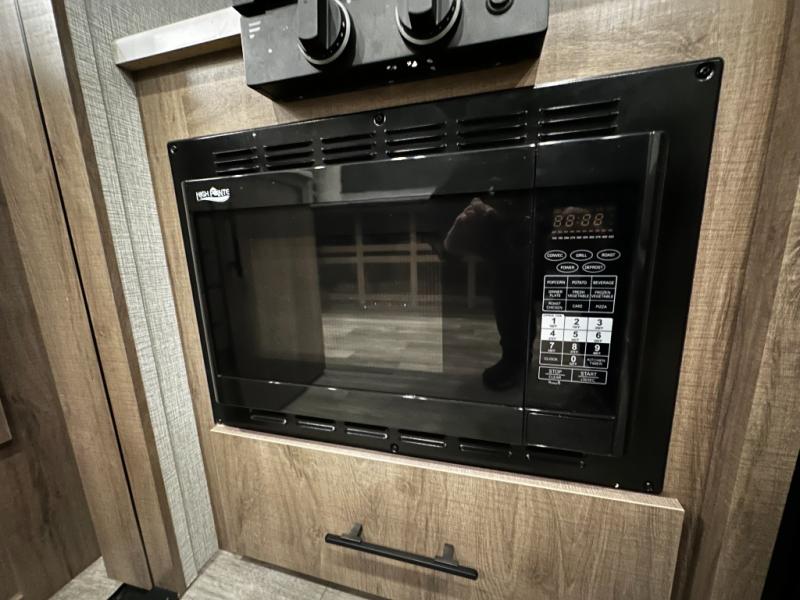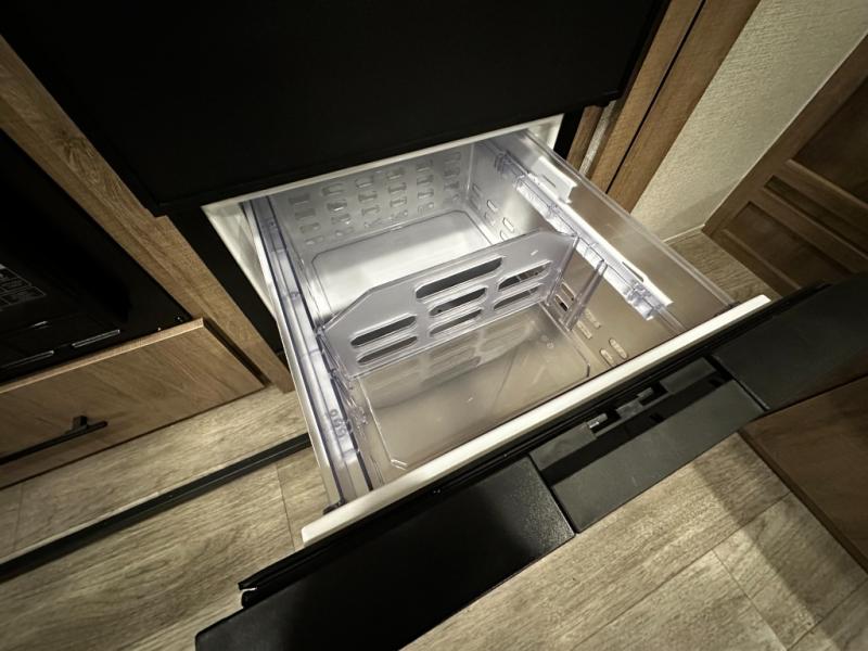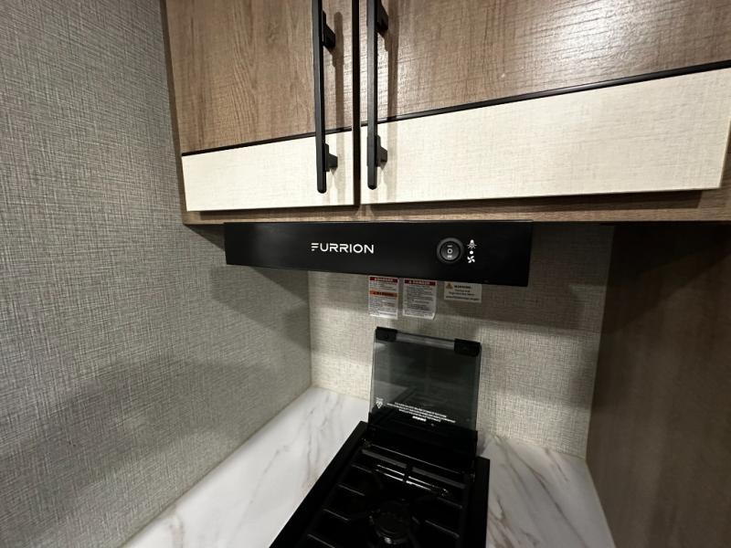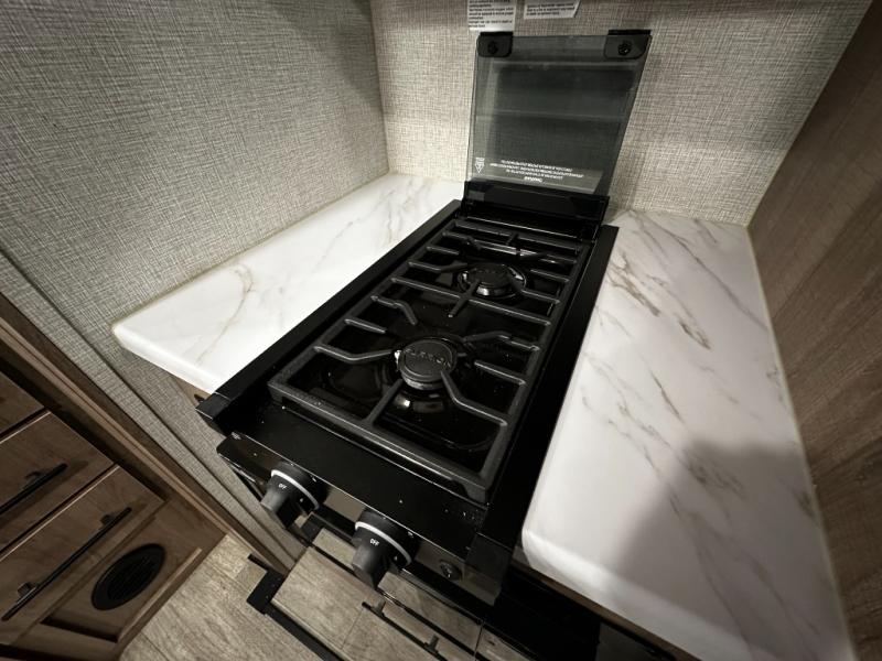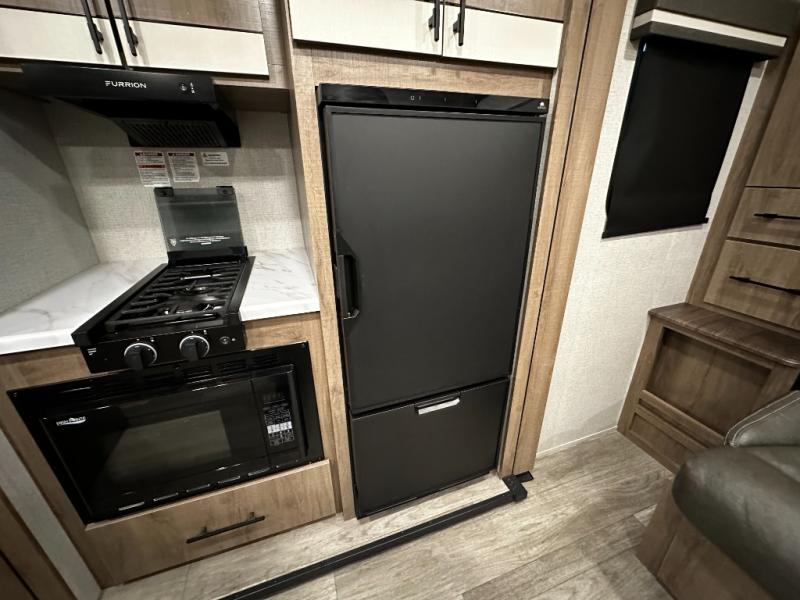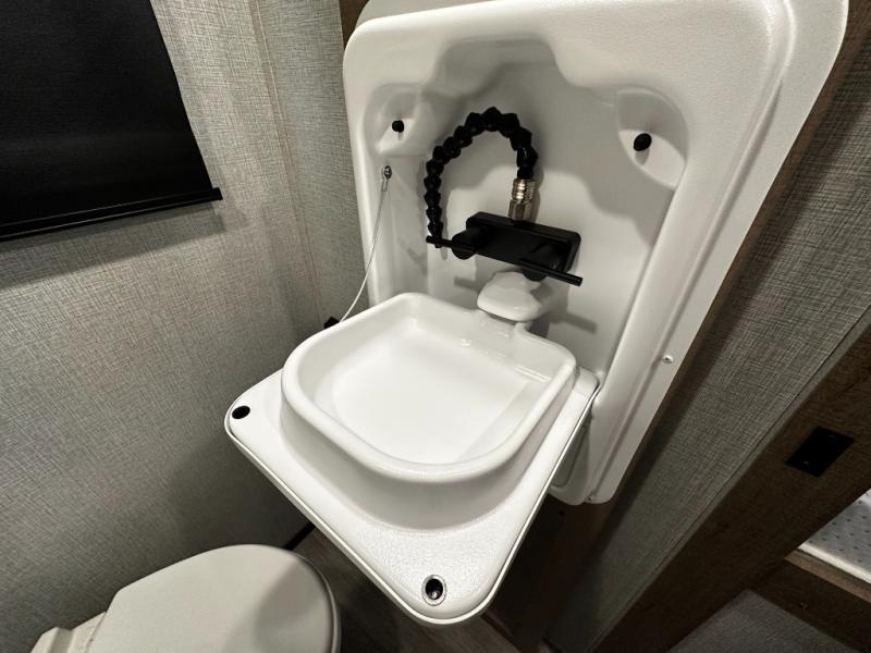 The well-equipped kitchen puts everything you need within reach. With generous countertop space, a reliable range, microwave, and ample storage for cookware and provisions, meal prep on the road is easy and enjoyable. The adjacent dinette makes mealtime comfortable and inviting, whether you’re sharing breakfast before a day of hiking or dinner after exploring local sights.
