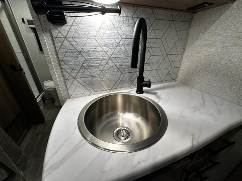 The full bathroom features modern fixtures and thoughtful design, keeping your everyday routines simple and stress-free while on the road. Additional storage throughout the coach—including overhead cabinets, wardrobes, and exterior compartments—ensures that gear, clothing, and essentials stay organized and accessible.