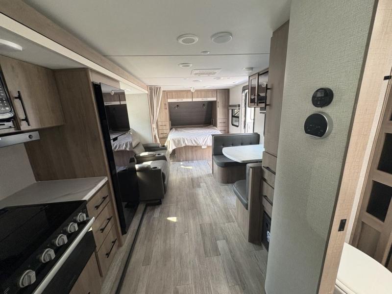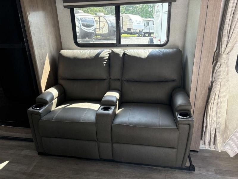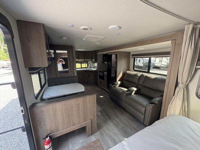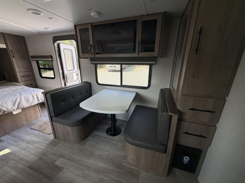 This Imagine XLS travel trailer has theater seating and a booth dinette that you can use any time you need a little break from the outdoors. If you want to come in and grab a coffee, put together a puzzle, or work on your itinerary for the week, just put up your feet and relax. You could even switch on the LED HDTV if you want a little entertainment. The front queen-size bed has a privacy curtain that you can draw to create a semi-private bedroom, and in the back of the trailer you will find the rest of your amenities, like the kitchen and the bathroom. The large slide makes it easy to enjoy spending your time indoors, but if you do want to get back outside, you can sit underneath the 18' electric awning for some shade.