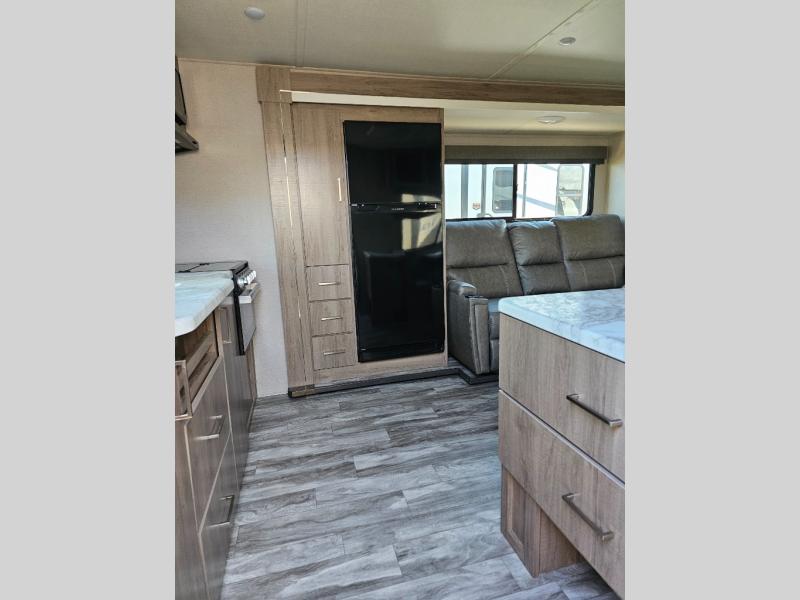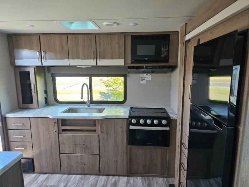 Treat yourself to a weekend of fun in this Imagine XLS travel trailer! Whether it's just you and your spouse, or you've chosen to bring along a group of friends, this trailer will meet the need. The front bedroom can sleep two people on the walk-around queen-size bed. The bedroom is quite functional because it not only contains the second exterior entry door, but it also has a private entrance into the walk-through bathroom since it is located on the other side of the bathroom. The booth dinette is functional too because it can transform from a dining location into a sleeping location, and the theater seating is directly across from the 32" LED TV for easy viewing. When you enter through the entry door that is right next to the rear kitchen, you'll be able to take off your shoes and put them in the shoe storage below the dinette.