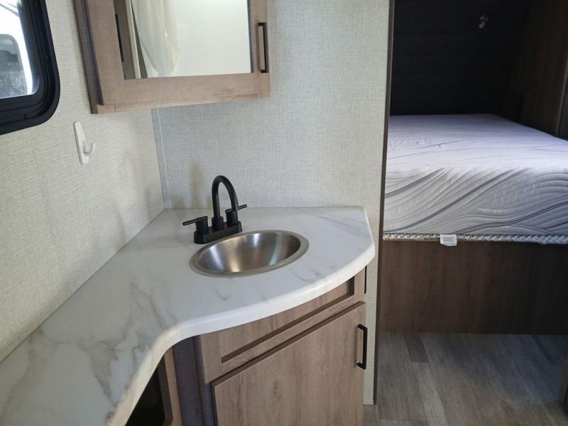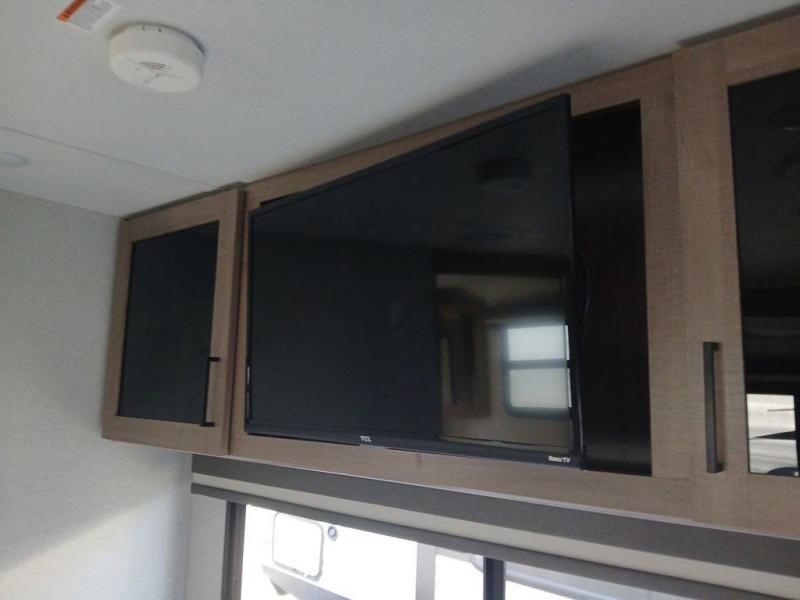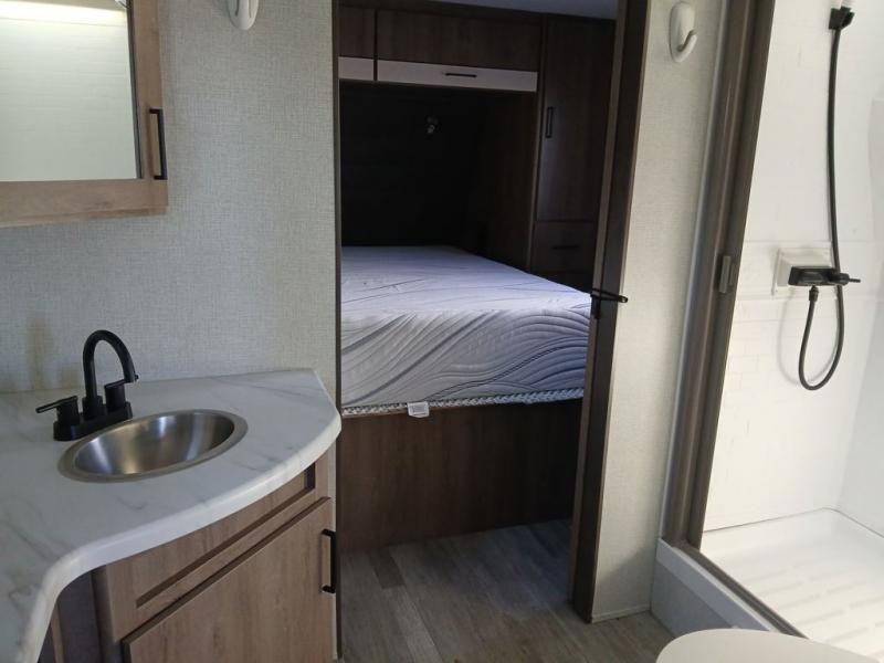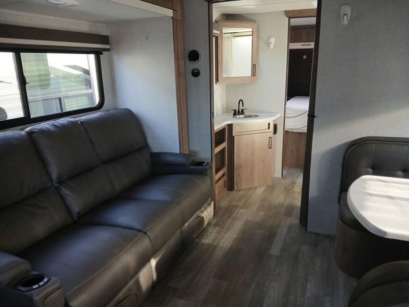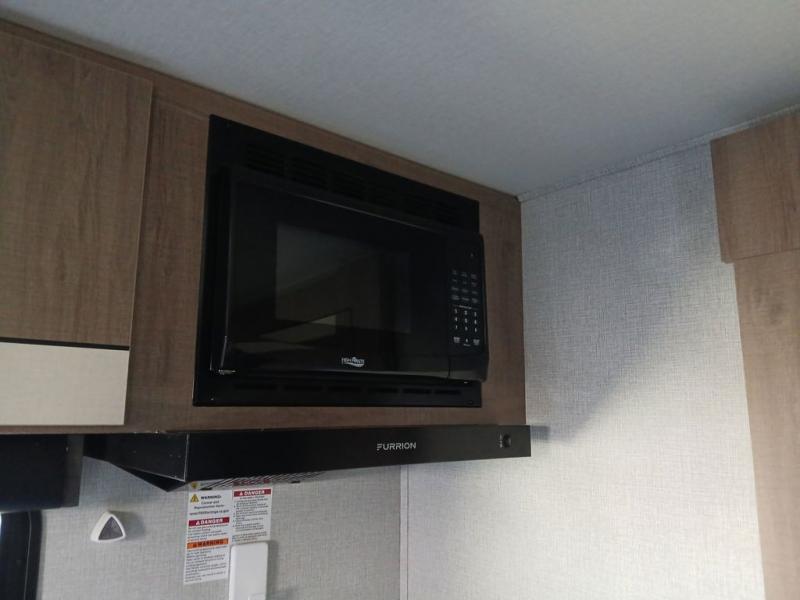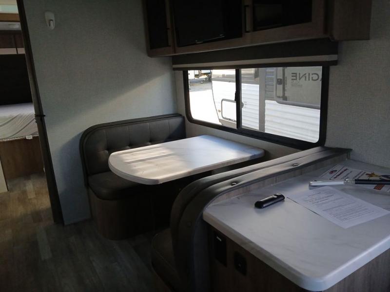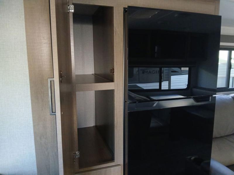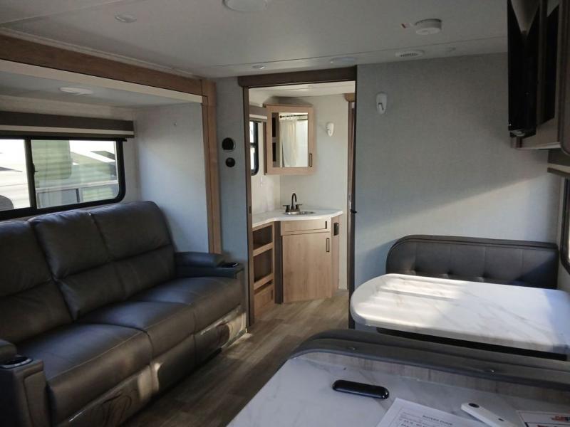 Treat yourself to a weekend of fun in this Imagine XLS travel trailer! Whether it's just you and your spouse, or you've chosen to bring along a group of friends, this trailer will meet the need. The front bedroom can sleep two people on the walk-around queen-size bed. The bedroom is quite functional because it not only contains the second exterior entry door, but it also has a private entrance into the walk-through bathroom since it is located on the other side of the bathroom. The booth dinette is functional too because it can transform from a dining location into a sleeping location, and the theater seating is directly across from the 32" LED TV for easy viewing. When you enter through the entry door that is right next to the rear kitchen, you'll be able to take off your shoes and put them in the shoe storage below the dinette.