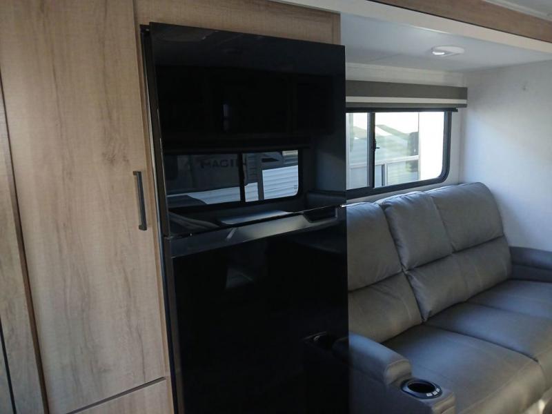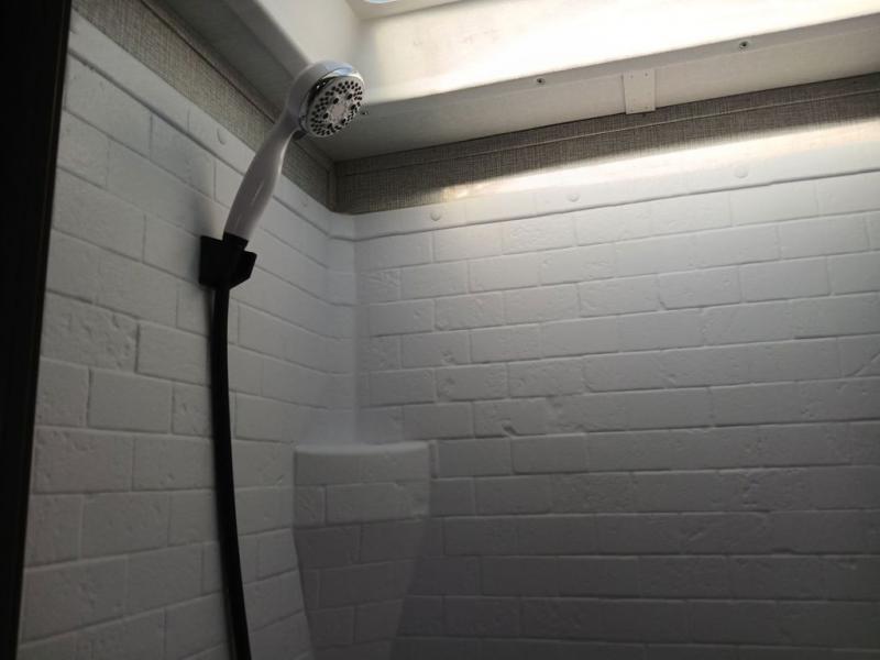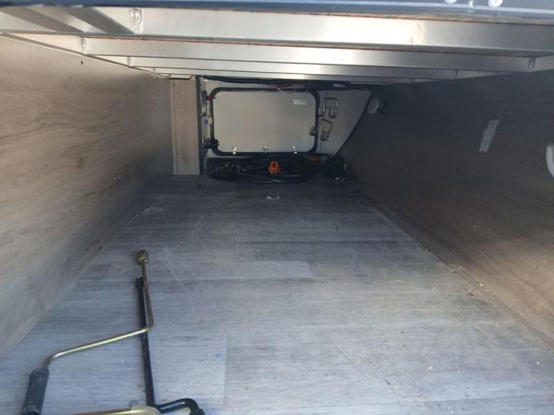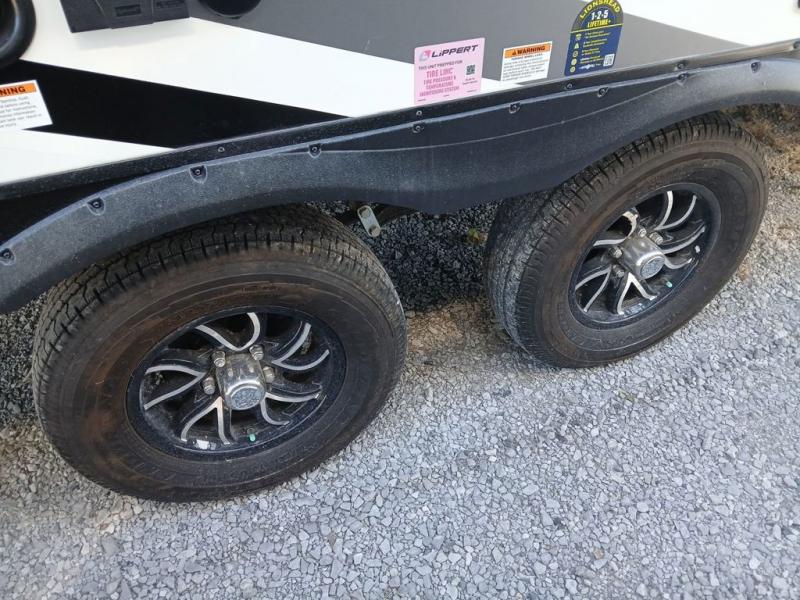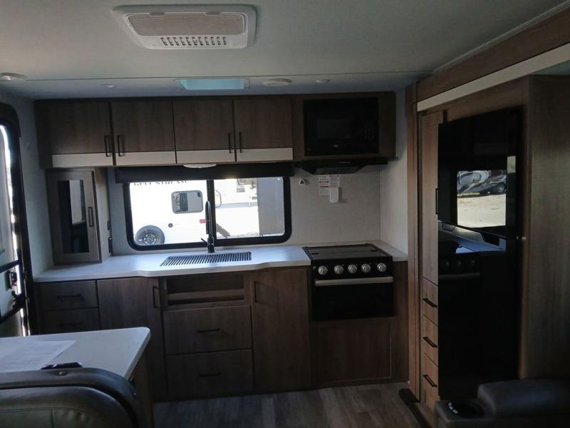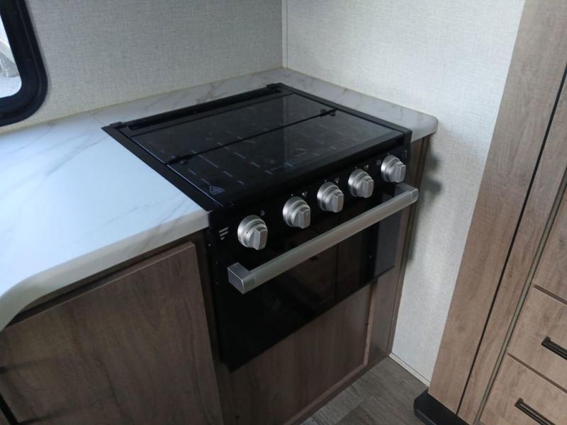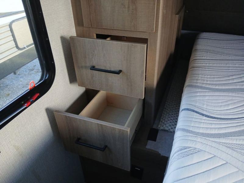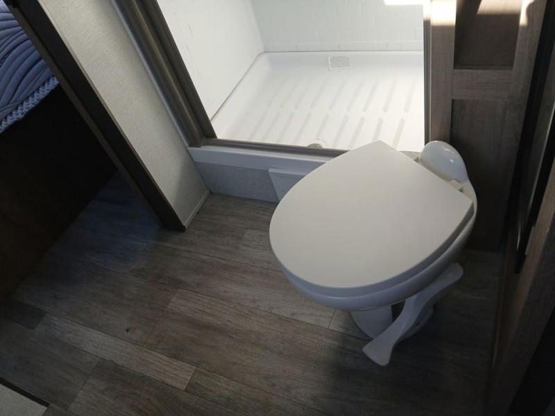Treat yourself to a weekend of fun in this Imagine XLS travel trailer! Whether it's just you and your spouse, or you've chosen to bring along a group of friends, this trailer will meet the need. The front bedroom can sleep two people on the walk-around queen-size bed. The bedroom is quite functional because it not only contains the second exterior entry door, but it also has a private entrance into the walk-through bathroom since it is located on the other side of the bathroom. The booth dinette is functional too because it can transform from a dining location into a sleeping location, and the theater seating is directly across from the 32" LED TV for easy viewing. When you enter through the entry door that is right next to the rear kitchen, you'll be able to take off your shoes and put them in the shoe storage below the dinette.