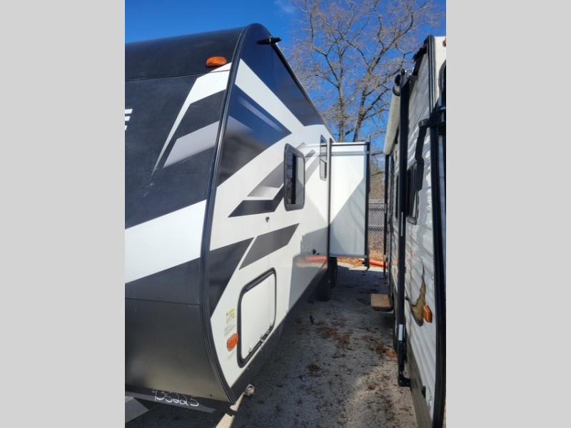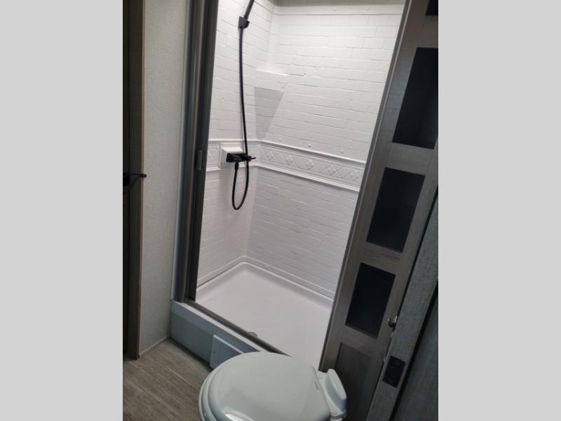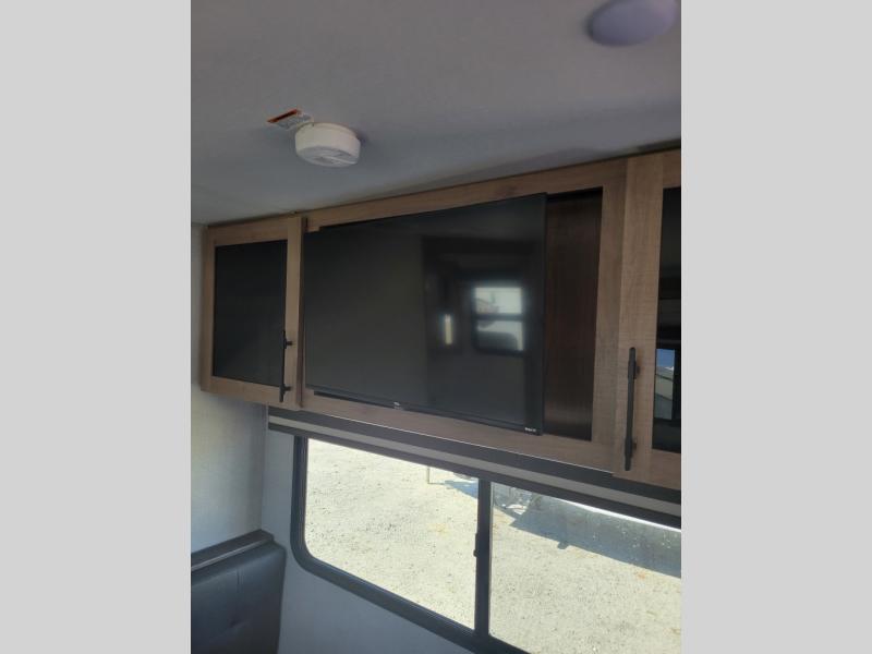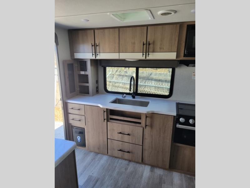 Treat yourself to a weekend of fun in this Imagine XLS travel trailer! Whether it's just you and your spouse, or you've chosen to bring along a group of friends, this trailer will meet the need. The front bedroom can sleep two people on the walk-around queen-size bed. The bedroom is quite functional because it not only contains the second exterior entry door, but it also has a private entrance into the walk-through bathroom since it is located on the other side of the bathroom. The booth dinette is functional too because it can transform from a dining location into a sleeping location, and the theater seating is directly across from the 32" LED TV for easy viewing. When you enter through the entry door that is right next to the rear kitchen, you'll be able to take off your shoes and put them in the shoe storage below the dinette.
