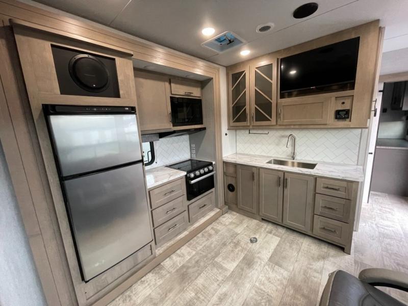 Are you looking for adventure and fun? The Momentum G-Class toy hauler by Grand Design will help you find it! You can explore during any season you choose with the Insulation Package that includes a heated and enclosed underbelly with suspended tanks, a high-capacity furnace, a moisture barrier floor enclosure, and cabinet-mounted heat ducts. Each model includes a 30-gallon fuel station with an interior and exterior gauge, a dovetail rear rend, and 2,500-LB tie-downs anchored into the chassis. Throughout the Momentum G-Class interior, you'll enjoy many comfortable features like large panoramic windows, a shower skylight, USB chargers in the bedroom, and residential cabinetry.