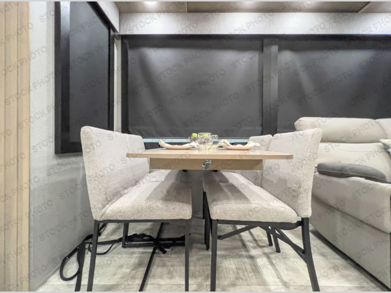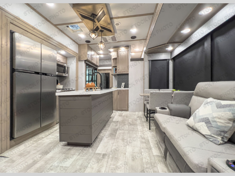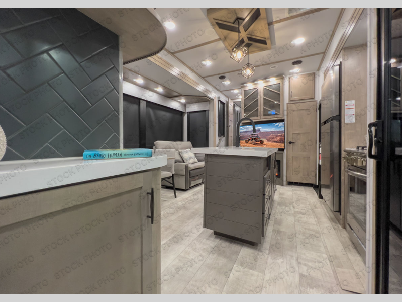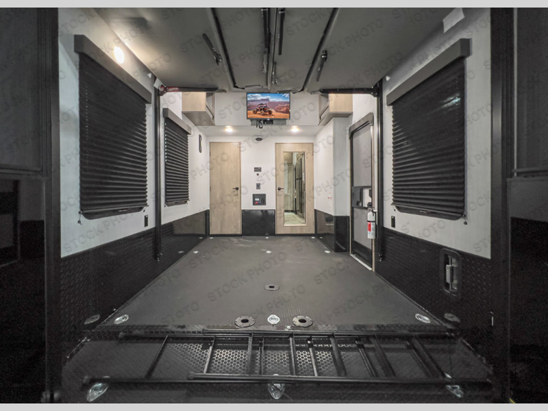 Get ready for a lot of fun when you head out to the off-road park, a special event, or a long trip with your toys! You will love the garage with the Fast Ramp rear ramp door, the Ram-Air garage vents on both sides, the 2,500 lb. rated flush-mount tie-downs and the protective diamond plate on the garage sidewalls. This area can become a bedroom or an extra living area if you want to add Happi-Jac rollover sofas/table with a top bed option, plus you will already have a half bath for convenience, an LED TV and storage for your gear. The living and kitchen area is spacious with dual slides and a kitchen island with bar stools, a free standing table and theatre seating or choose the super sofa option, and everything you need to feed everyone. The fold-down side patio offers an LED TV, storage and a great place to relax outdoors above ground. There are many more features to enjoy, and several options to customize your fifth wheel.