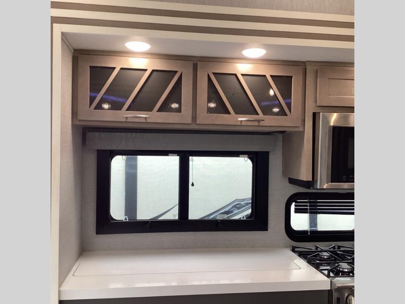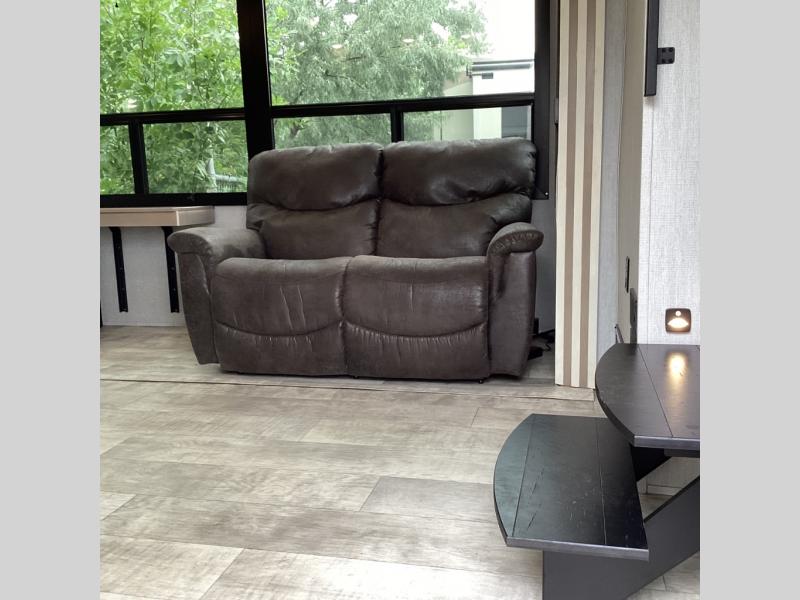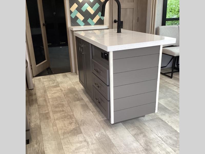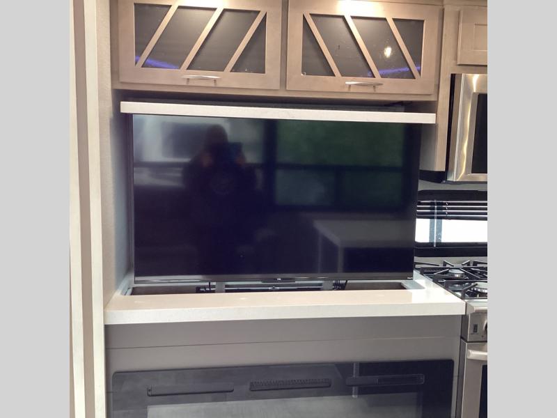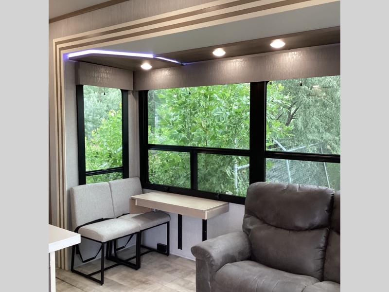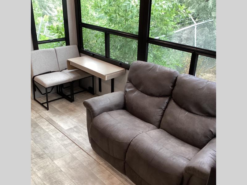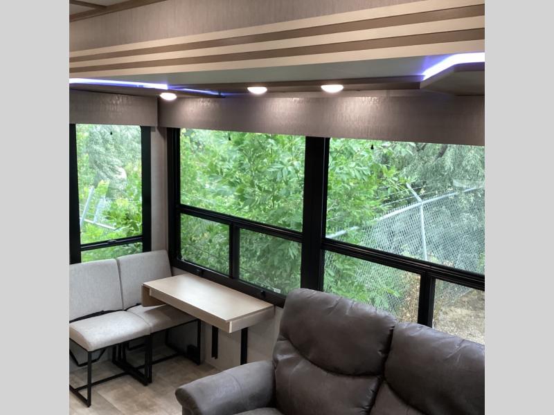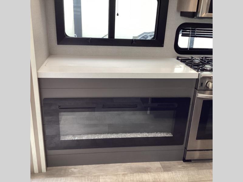 Full kitchen with center island, free-standing dinette, theater seating, electric fireplace, and 3 slide-outs for maximum space. -