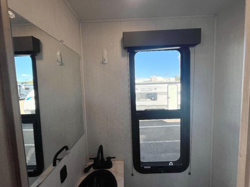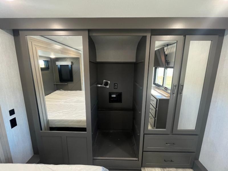 There is much to love about this fifth wheel toy hauler! Starting with the 13' 6" garage that comes with Happi-jac rollover sofas with table and an optional top bed above them, an overhead bed, an LED TV, one of the dual entry doors, and an optional half bath to add. You will also love the ramp door/patio for entertainment at night. The chef will love cooking in the kitchen with a hutch, three burner cooktop, and an island with a flip-up countertop and two bar stools for extra helpers. The rest of the group can socialize together at either the free standing dinette or at the chaise lounge with pull-out sofa across from the entertainment center with an LED TV and fireplace. As you head to the front of the unit, you will pass through the separated bathroom with a private toilet and a shower with a flip-up teak seat. It enters directly into the front private bedroom where there is a queen bed slide to lay your head on at night, a front wardrobe prepped to add an optional washer and dryer, and a flip-up dresser with TV prep above it!
