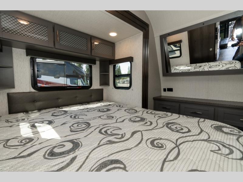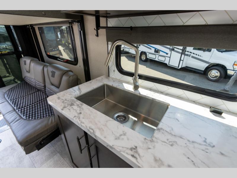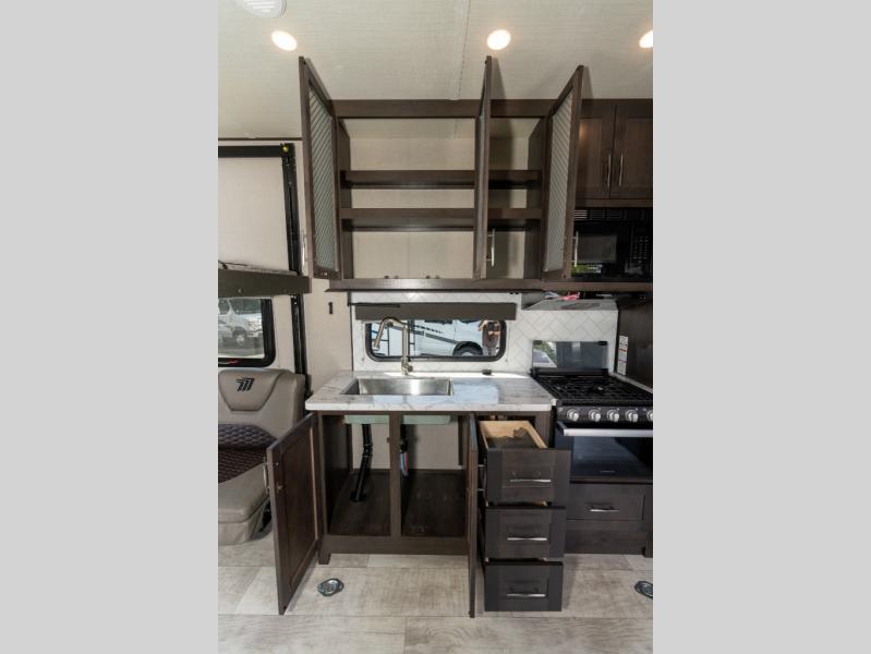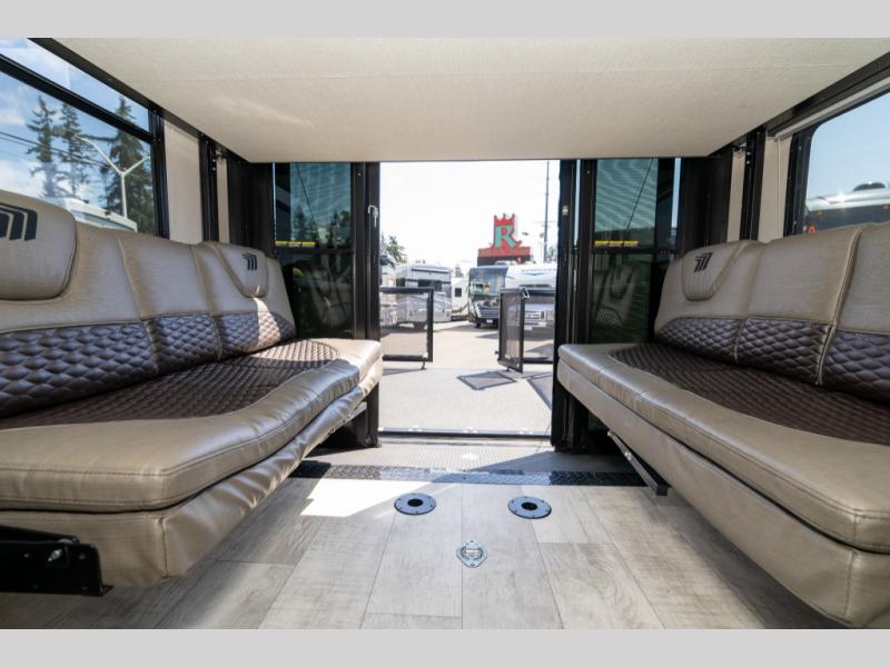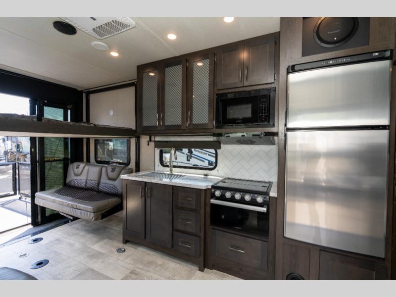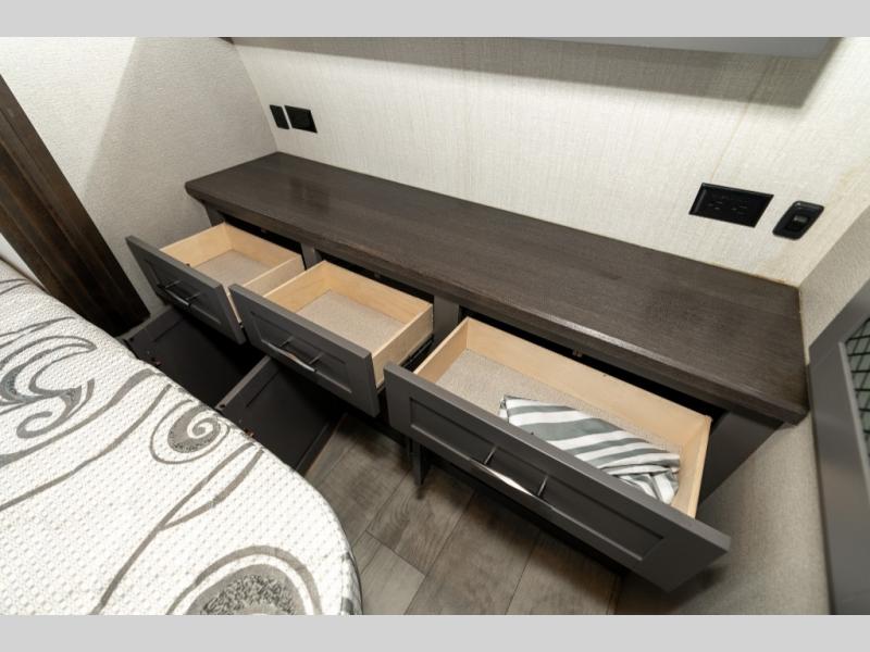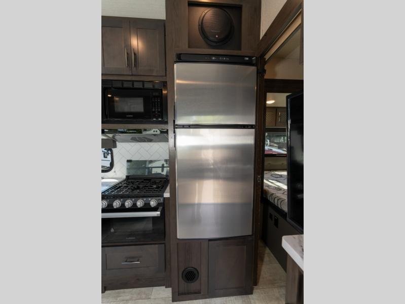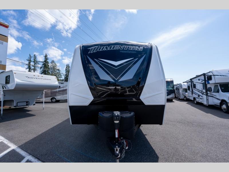 Are you looking for adventure and fun? The Momentum G-Class toy hauler by Grand Design will help you find it! You can explore during any season you choose with the Insulation Package that includes a heated and enclosed underbelly with suspended tanks, a high-capacity furnace, a moisture barrier floor enclosure, and cabinet-mounted heat ducts. Each model includes a 30-gallon fuel station with an interior and exterior gauge, a dovetail rear rend, and 2,500-LB tie-downs anchored into the chassis. Throughout the Momentum G-Class interior, you'll enjoy many comfortable features like large panoramic windows, a shower skylight, USB chargers in the bedroom, and residential cabinetry.