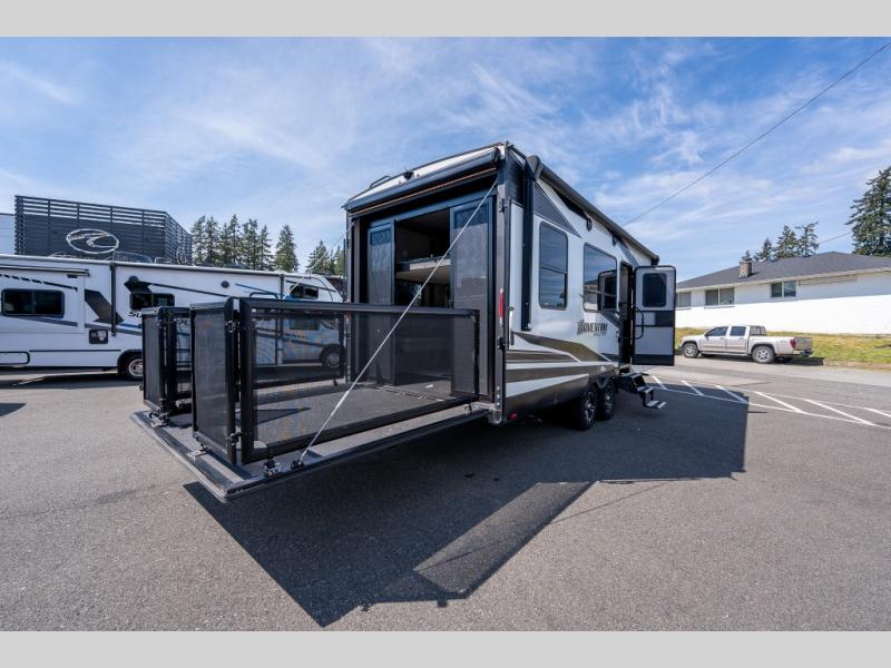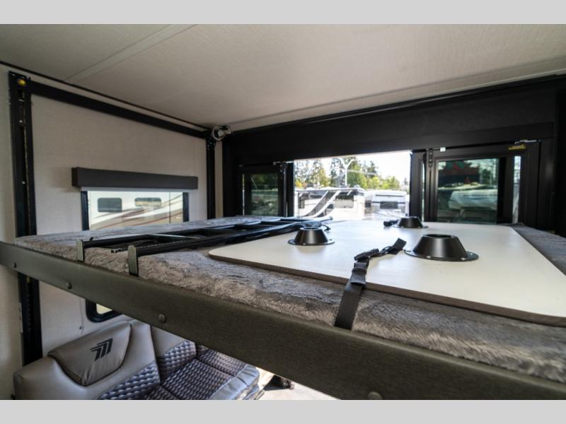 You don't have to rough it with all the amenities found in this Momentum G-Class toy hauler including your own master suite with a walk-around queen bed slide and private access into the dual-entry bathroom. The kids or your friends can sleep on the Happi-Jac power bunk above the rollover sofas with a table, and the Euro chairs can become the waiting area for the next rider. Keep the party going all weekend long with your very own fuel station and the exterior speakers. Come see why this model will fit perfectly into your off-road lifestyle!