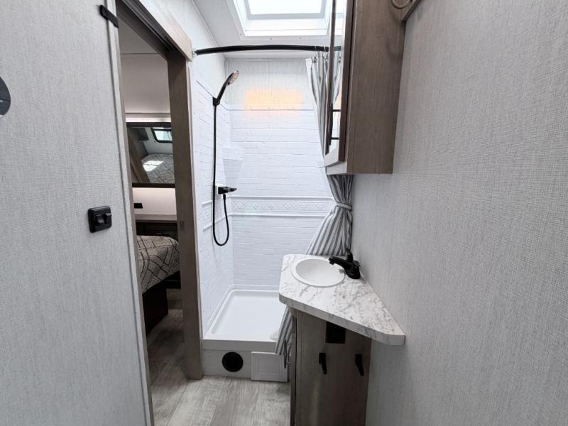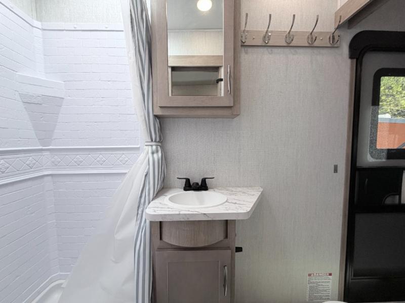 Inside, the Momentum G-Class includes large panoramic windows, a shower skylight, USB charging ports in the bedroom, and residential-style cabinetry. These features create a modern and functional interior perfect for extended trips or weekend adventures.