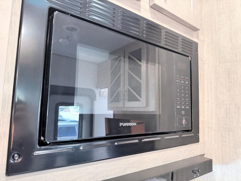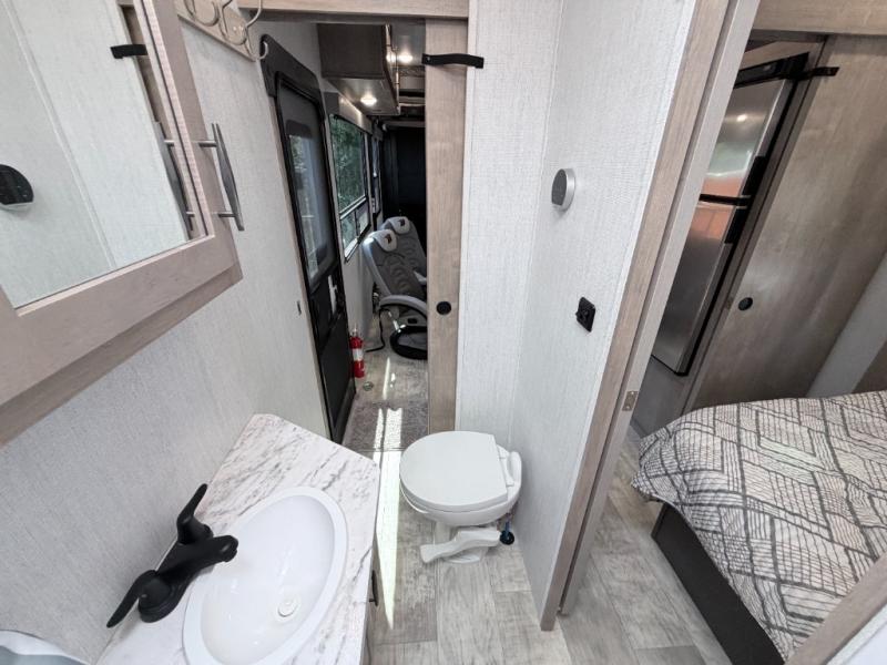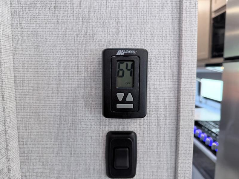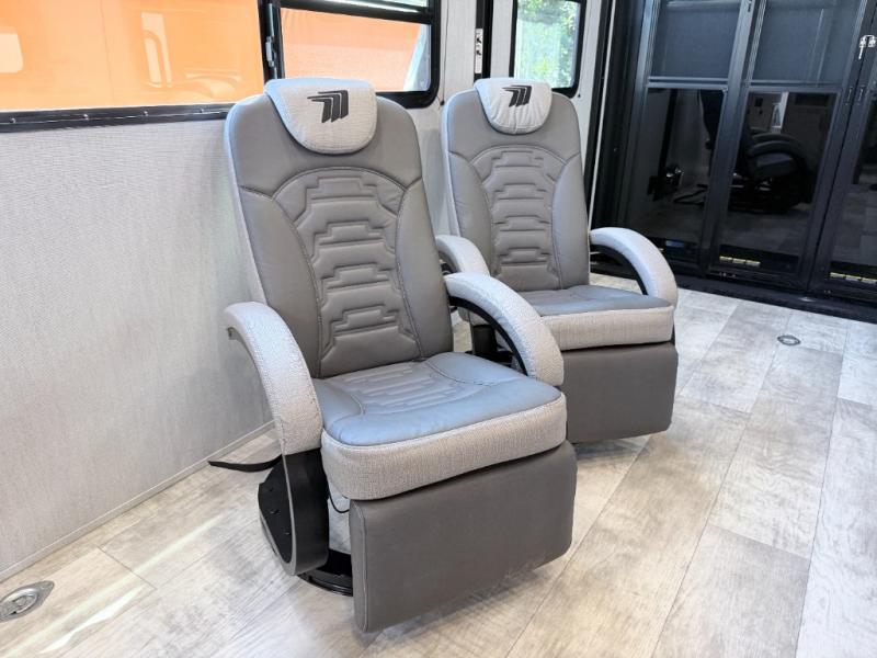 The Momentum G-Class 21G offers a master suite with a walk-around queen bed slide and private dual-entry bathroom for comfort and convenience. Guests or kids can rest on the Happi-Jac power bunk above the rollover sofas with a table, while the Euro chairs provide a versatile waiting or relaxation area.