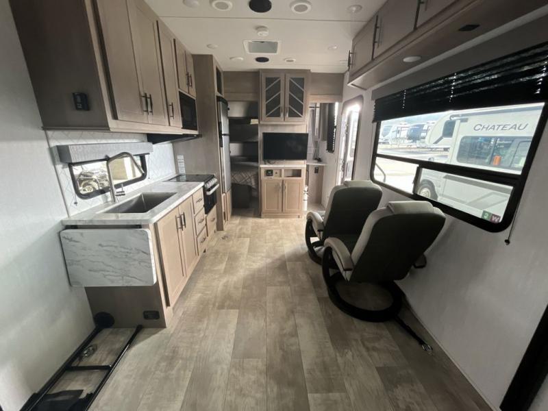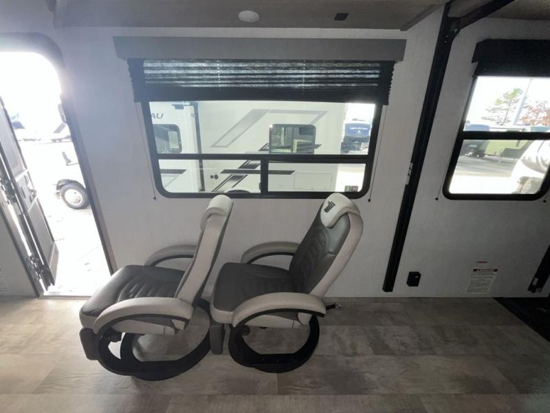 You'll be a force to reckon with in this Momentum G-Class toy hauler! The master suite provides great convenience since it contains extra space from the king bed slide, and the private entrance into the dual-entry bathroom allows you to discreetly clean up each morning. For those who like to start their morning off right with a hearty breakfast, you'll be able to use the flip-up table in the kitchen to get all of your ingredients together. As soon as those smells start wafting throughout, anyone who was sleeping on the rollover sofas or top bed will immediately come join you. The USB charging outlets in between the Euro chairs will allow you to charge your phone while you relax, and the exterior storage will hold extra gear for beach day.