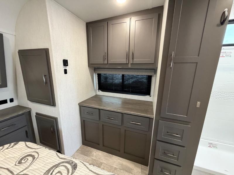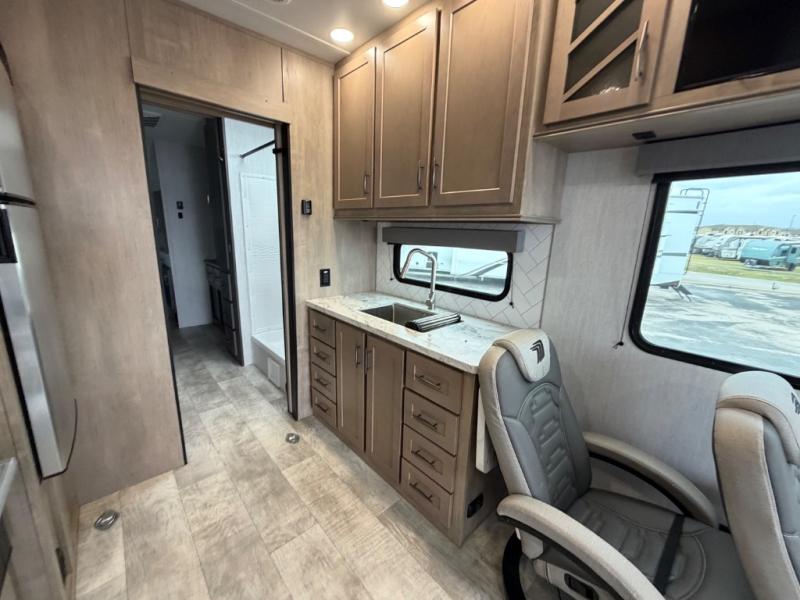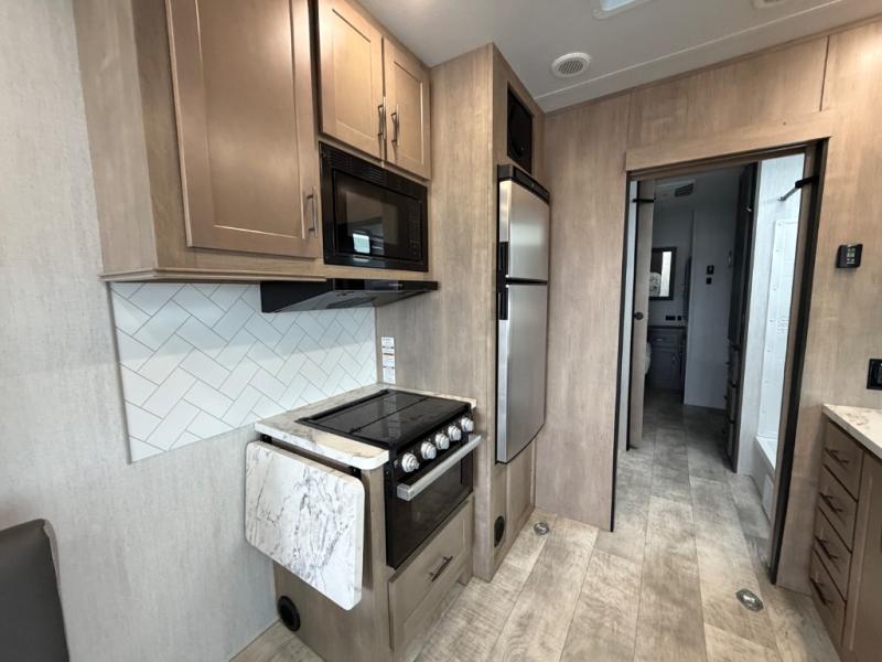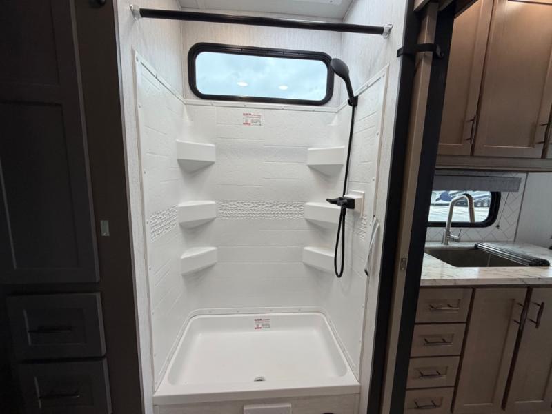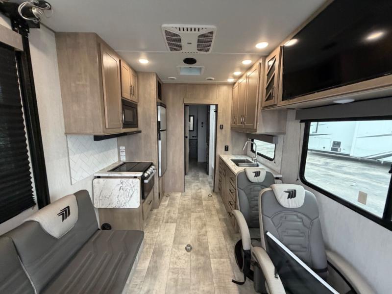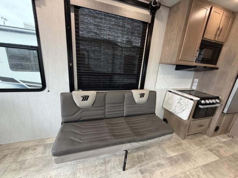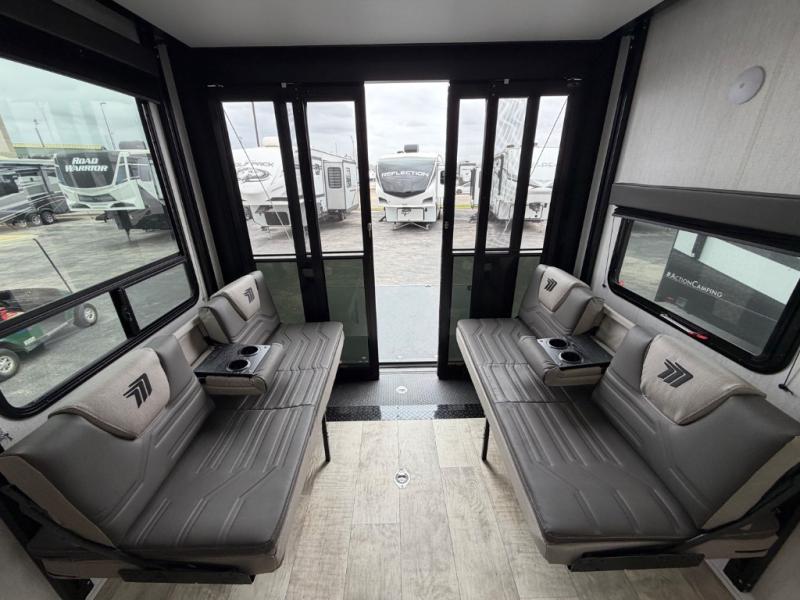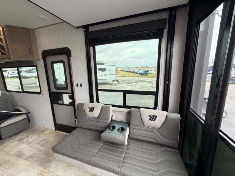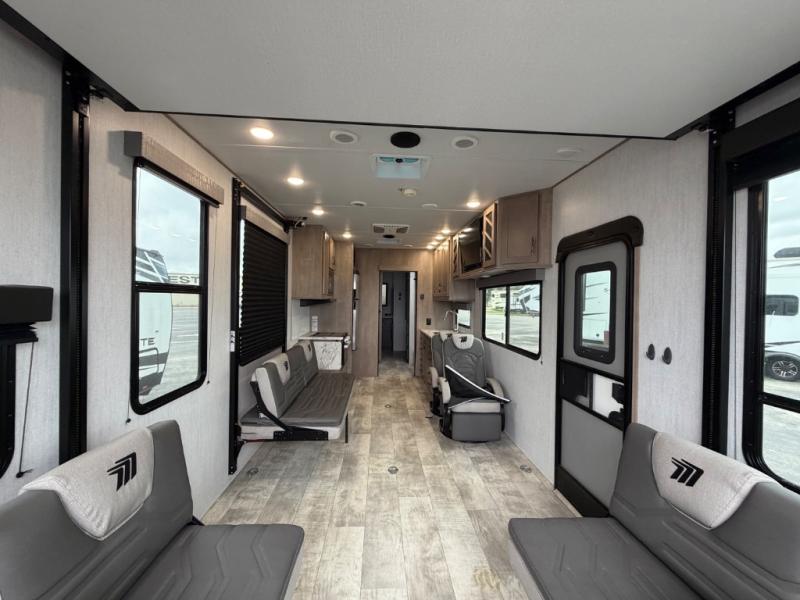 With any Momentum G-Class toy hauler you can explore during any season you choose with the Insulation Package that includes a heated and enclosed underbelly with suspended tanks, a high-capacity furnace, a moisture barrier floor enclosure, and cabinet-mounted heat ducts. Each model includes a 30-gallon fuel station with an interior and exterior gauge, a dovetail rear rend, and 2,500-LB tie-downs anchored into the chassis. Throughout the Momentum G-Class interior, you'll enjoy many comfortable features like large panoramic windows, a shower skylight, USB chargers in the bedroom, and residential cabinetry.