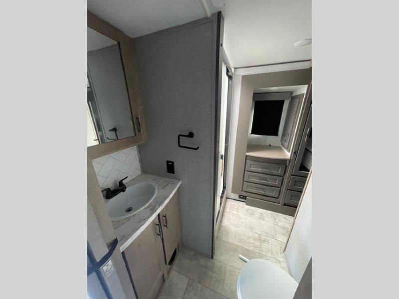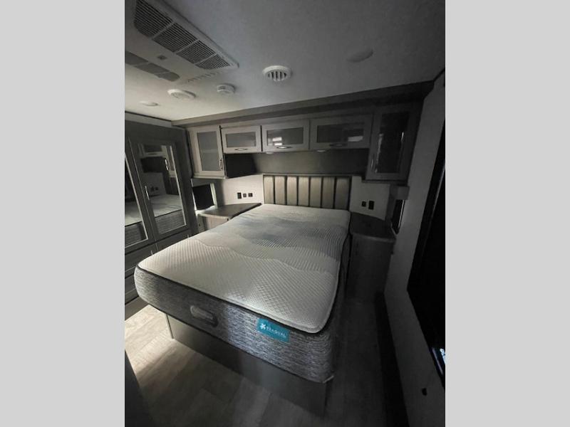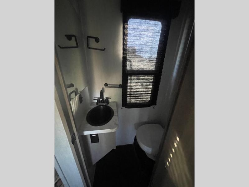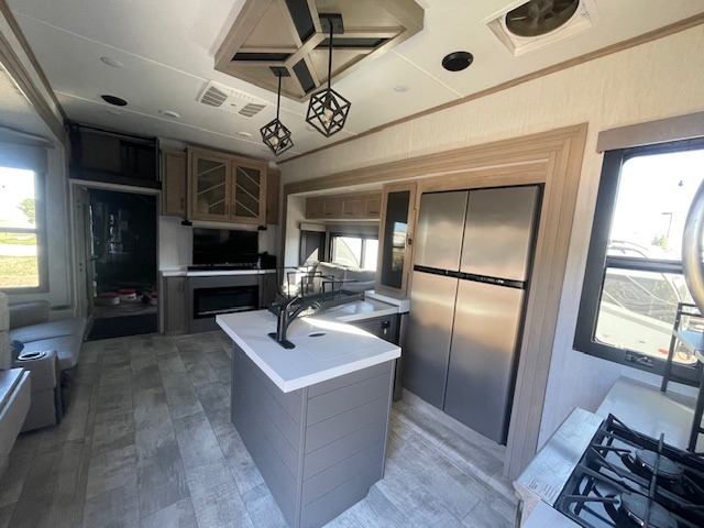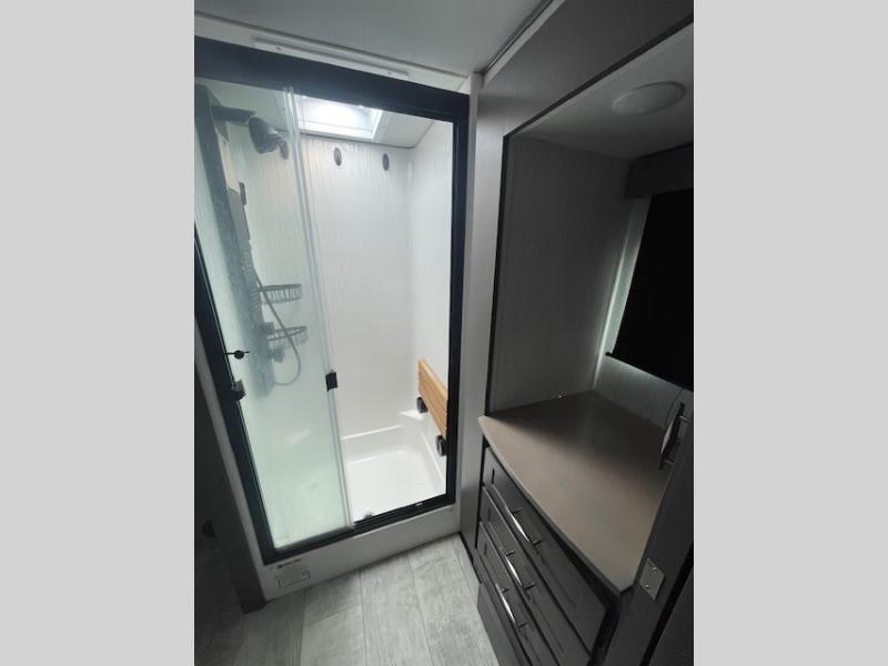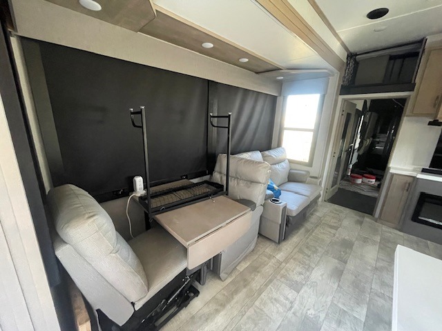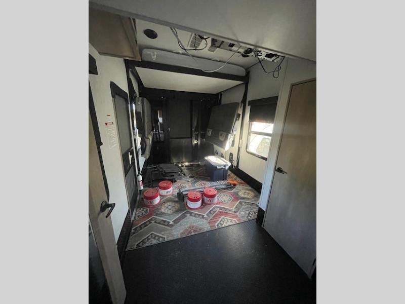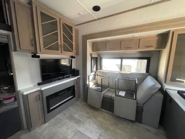 You want a toy hauler to carry your toys to the trails, and you can get an extra living room/bedroom out of this space once everything is unload when you add the Happi-Jac rollover sofas with a table with a top bed option. You might even like to add more optional features such a half bath and washer/dryer. There is an overhead loft bed and an L-shaped pull-out sofa in the main living area that offers sleeping space as well. Everyone can watch a movie on the LED TV with a fireplace below while sitting on the sofa, in the theatre seats, or while at the free standing dinette with four chairs. The chef will have upgraded appliances to make meals for everyone, an L-shaped countertop with a kitchen sink, and a USB charging outlet. You will love the sunken tub/shower with seat in the full bathroom with two space savings sliding doors that lead into the hallway, and into the front bedroom where you will have a walk-around queen bed, a slide out wardrobe and more USB charging outlets.