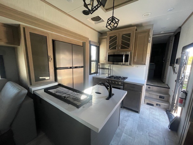 With any Momentum M-Class toy hauler by Grand Design, you will enjoy luxury at every turn! They have been constructed to a superior standard with a thermal roof design, triple insulated main floor and garage floor, and a Rail-Tite underbelly seal that will allow you to camp in all elements. Each model also features an 8' 5" wide body chassis with a wide rail design, no wheel wheels, and a dovetail entry for easier loading. The Stealth A/C system provides maximum cooling power, and the CRE3000 suspension system means you can enjoy a smooth tow each time. You will love the luxurious interior with a professional grade stainless steel cooktop, interior color changing LED accent lighting, a fiberglass shower with a glass door, and solid surface countertops.