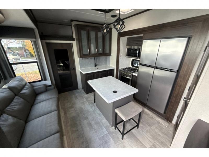 With any Momentum M-Class toy hauler by Grand Design, you will enjoy luxury at every turn! They have been constructed to a superior standard with a thermal roof design, triple insulated main floor and garage floor, and a Rail-Tite underbelly seal that will allow you to camp in all elements. Each model also features an 8' 5" wide body chassis with a wide rail design, no wheel wheels, and a dovetail entry for easier loading. The Stealth A/C system provides maximum cooling power, and the CRE3000 suspension system means you can enjoy a smooth tow each time. You will love the luxurious interior with a professional grade stainless steel cooktop, interior color changing LED accent lighting, a fiberglass shower with a glass door, and solid surface countertops.