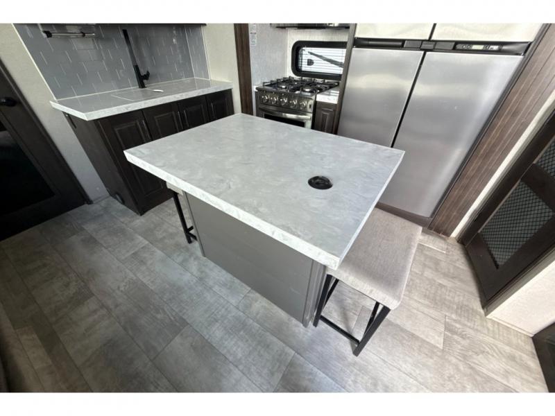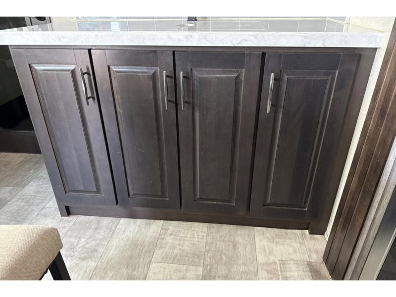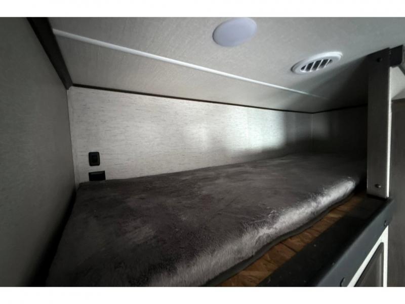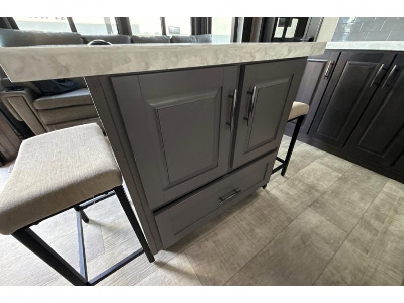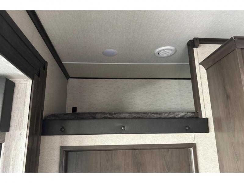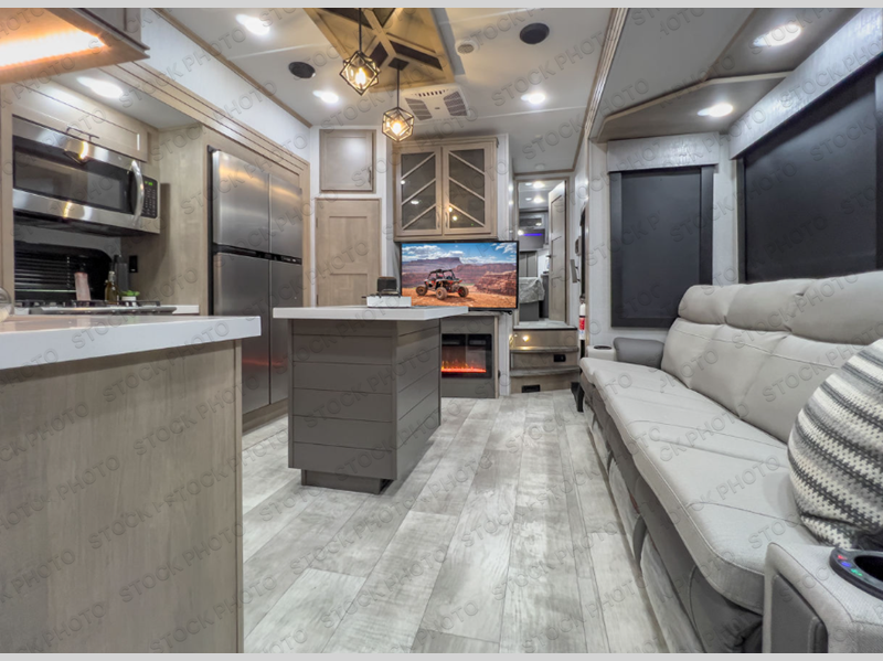 Load up your toys, gear, clothes and food to enjoy some off-road fun with your toys and friends! Once at the RV park, unload your toys and set up the three slide outs, the two awnings, and begin planning your trail rides! You might decide to make a meal or snack in the combined kitchen and main living area which offers all the appliances you need, plus a kitchen island with two bar stools, a pantry, an LED TV with a fireplace below, plus a slide out four-seat sofa. The garage even offers the option to add two Happi-Jac rollover sofas with tables with a top bed if you want seating and sleeping space. The overhead loft bed provides sleeping space as well. You will love the sunken tub/shower with a seat in the full bathroom with a space savings sliding door, and the front bedroom can be your escape. There is a queen bed, a slide out wardrobe and USB charging outlets.