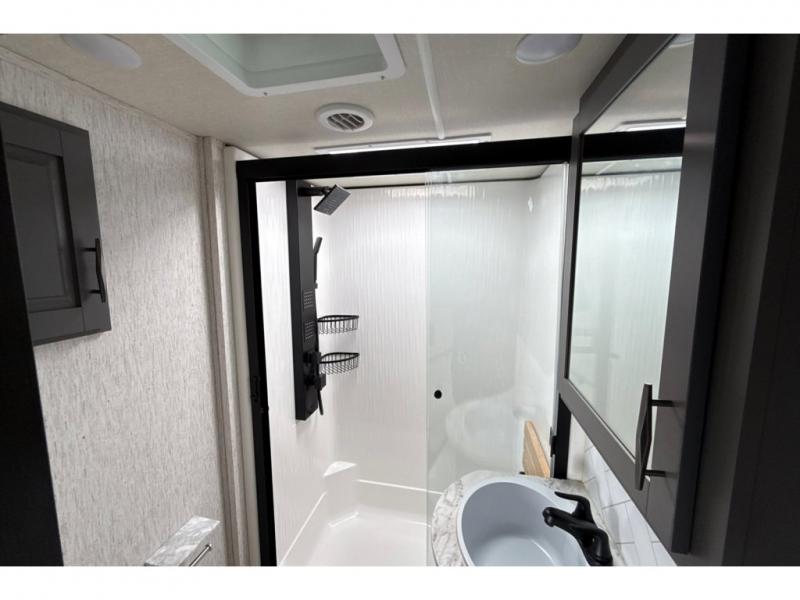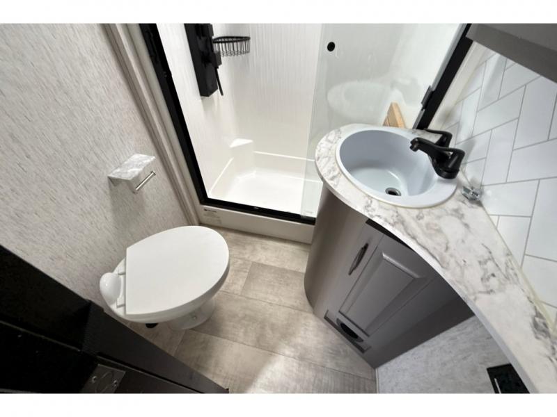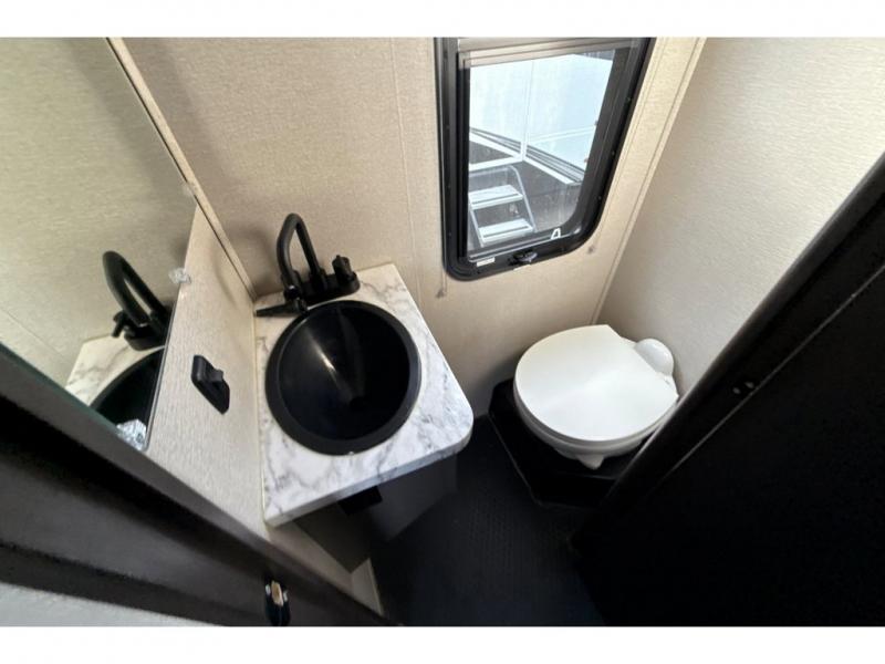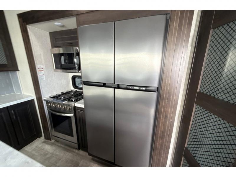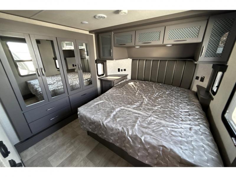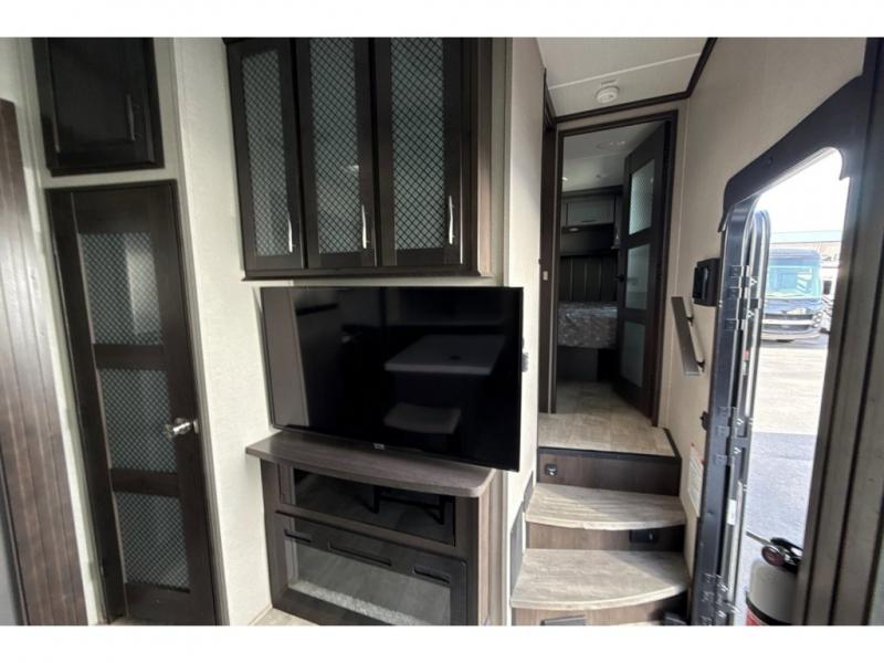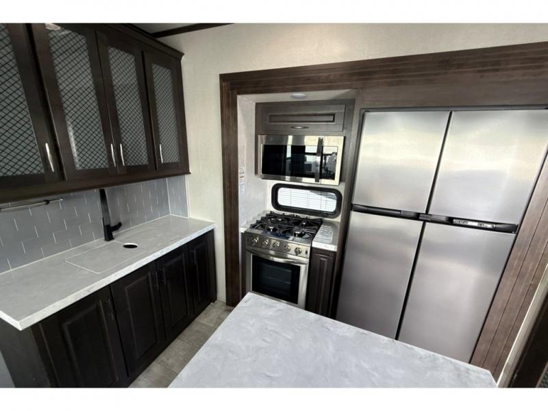 Load up your toys, gear, clothes and food to enjoy some off-road fun with your toys and friends! Once at the RV park, unload your toys and set up the three slide outs, the two awnings, and begin planning your trail rides! You might decide to make a meal or snack in the combined kitchen and main living area which offers all the appliances you need, plus a kitchen island with two bar stools, a pantry, an LED TV with a fireplace below, plus a slide out four-seat sofa. The garage even offers the option to add two Happi-Jac rollover sofas with tables with a top bed if you want seating and sleeping space. The overhead loft bed provides sleeping space as well. You will love the sunken tub/shower with a seat in the full bathroom with a space savings sliding door, and the front bedroom can be your escape. There is a queen bed, a slide out wardrobe and USB charging outlets.