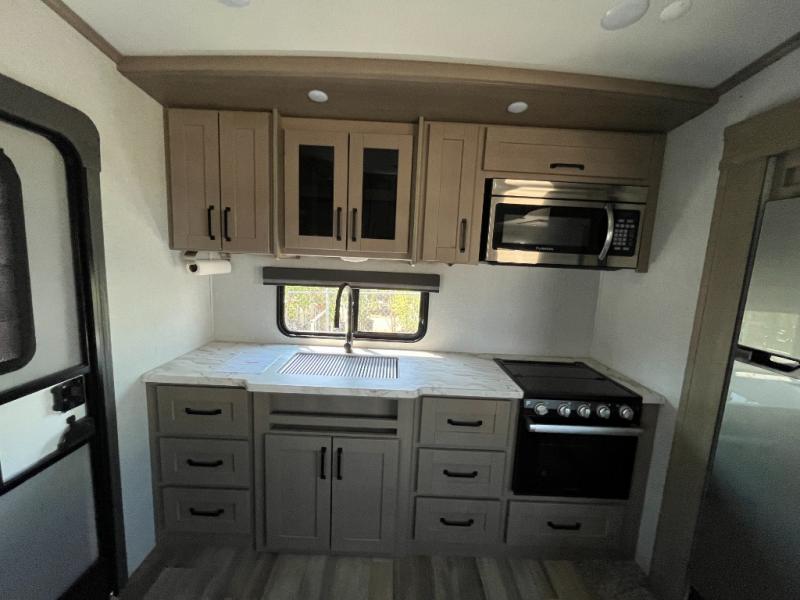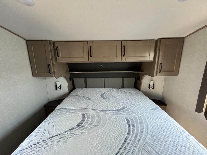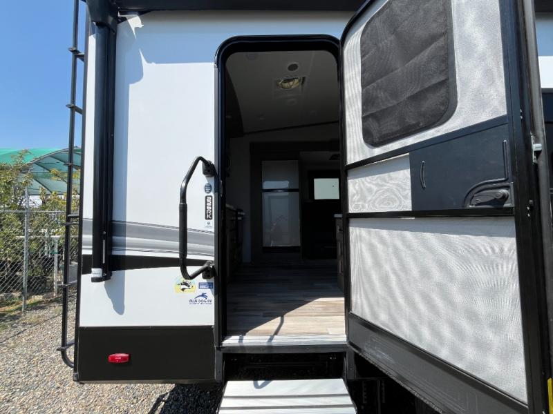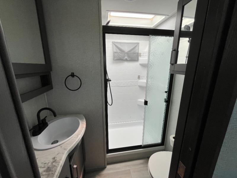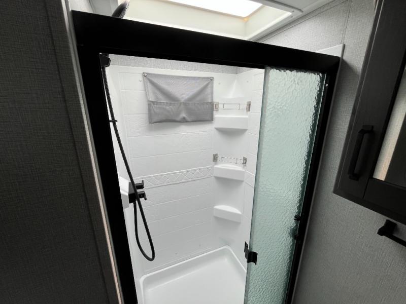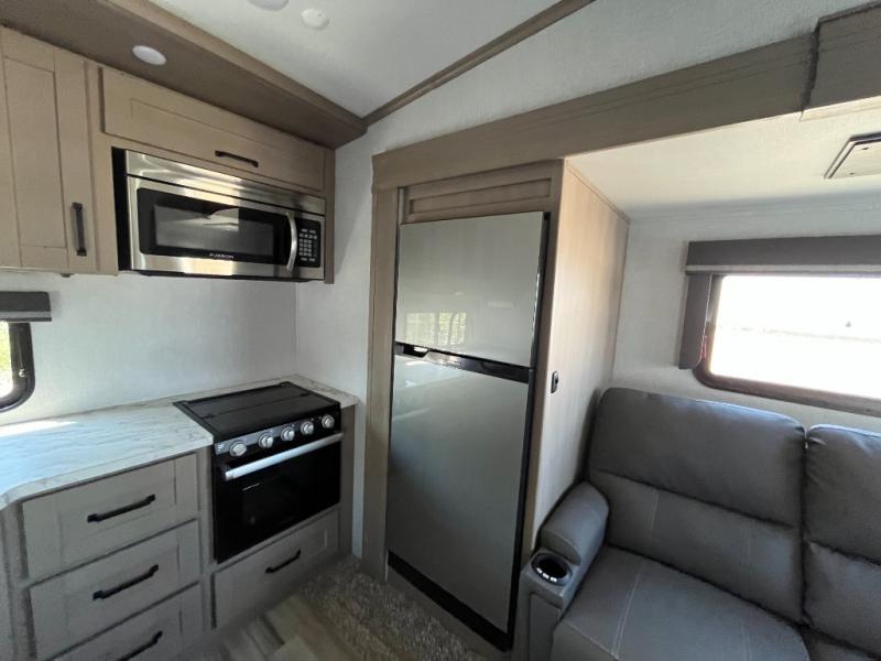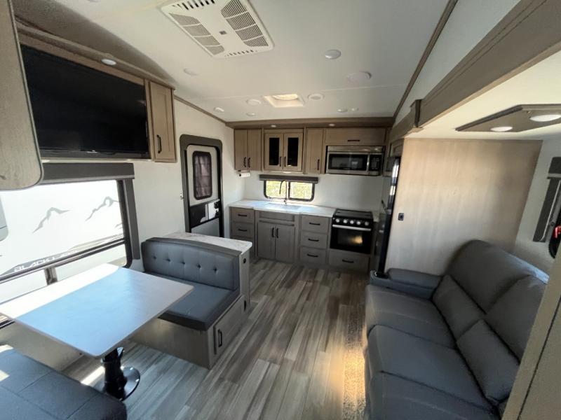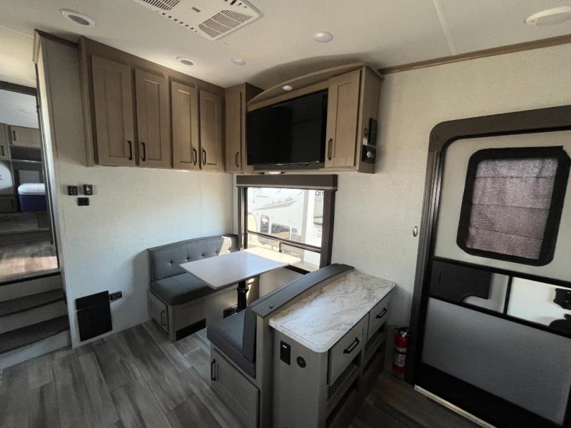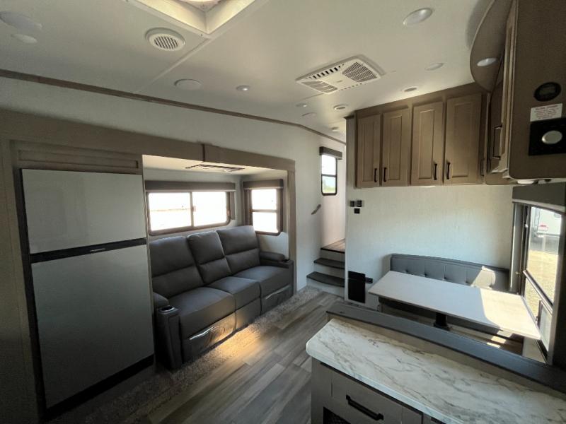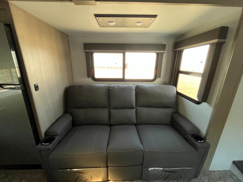 Enjoy a weekend getaway at a campground or off-grid in this fifth wheel! The front private bedroom has a queen bed for you to lay your head on at night and overhead cabinets to keep things out of the way. Inside the full bathroom there is a shower with a skylight for added natural lighting as you get ready each morning. Once you have prepared a delicious home cooked meal at the rear kitchen, head to the booth dinette for a comfortable place to enjoy it. What better way to wind down your nights than to relax on the 70" theatre seating and watch your favorite movie on the 40" LED HDTV. The theatre seats can also be switched out for an optional tri-fold seating if you would prefer that type of seating.
