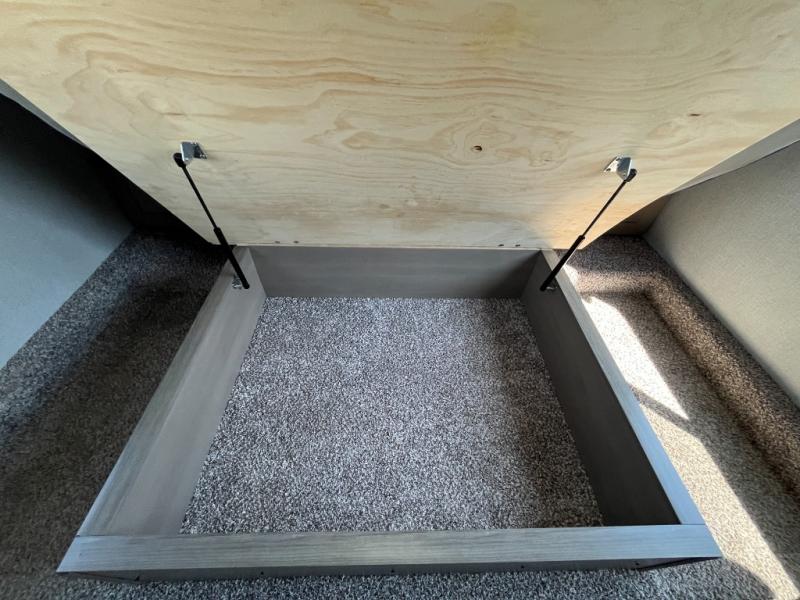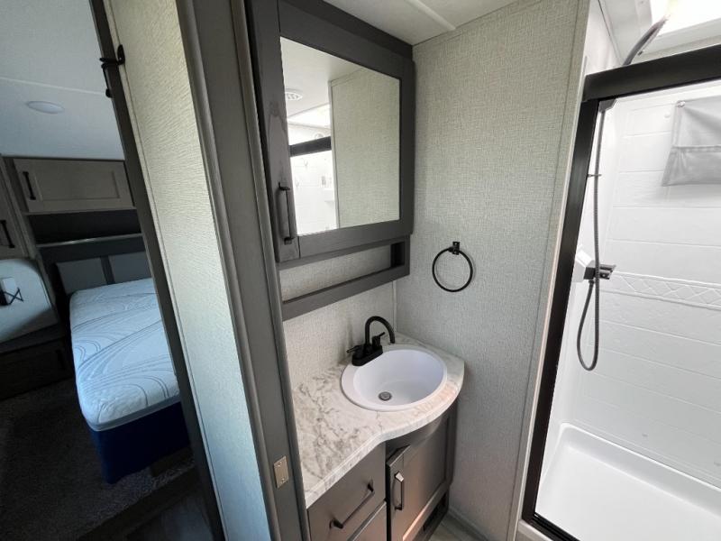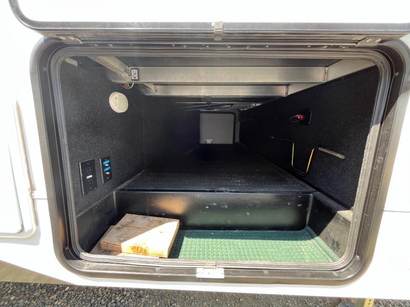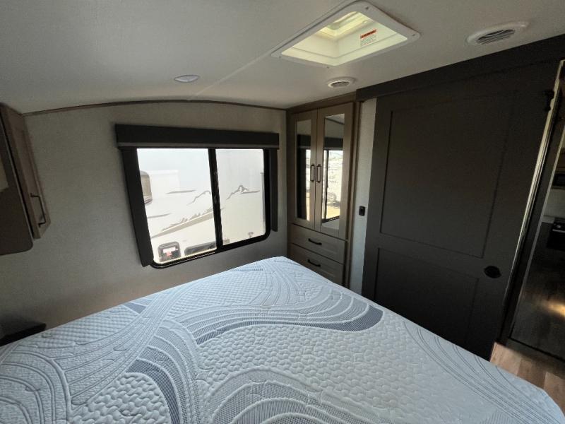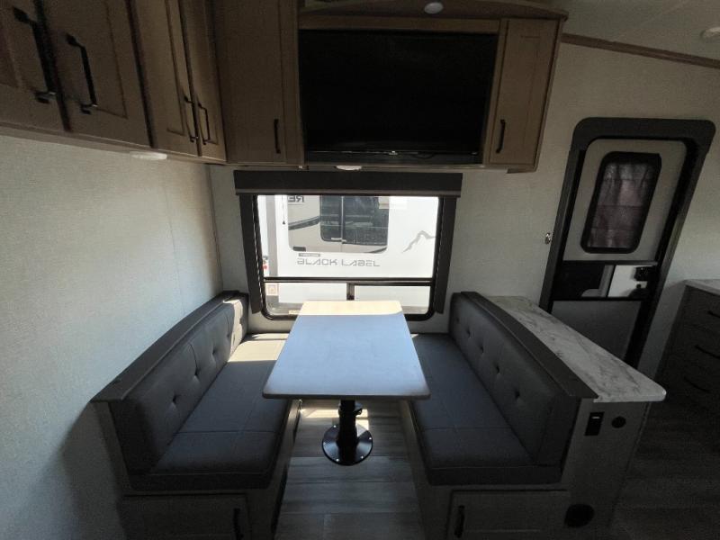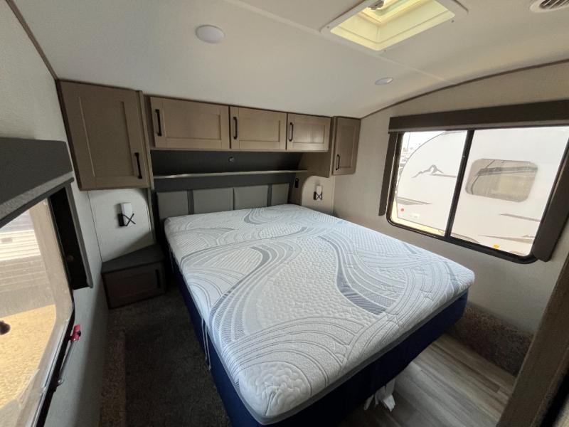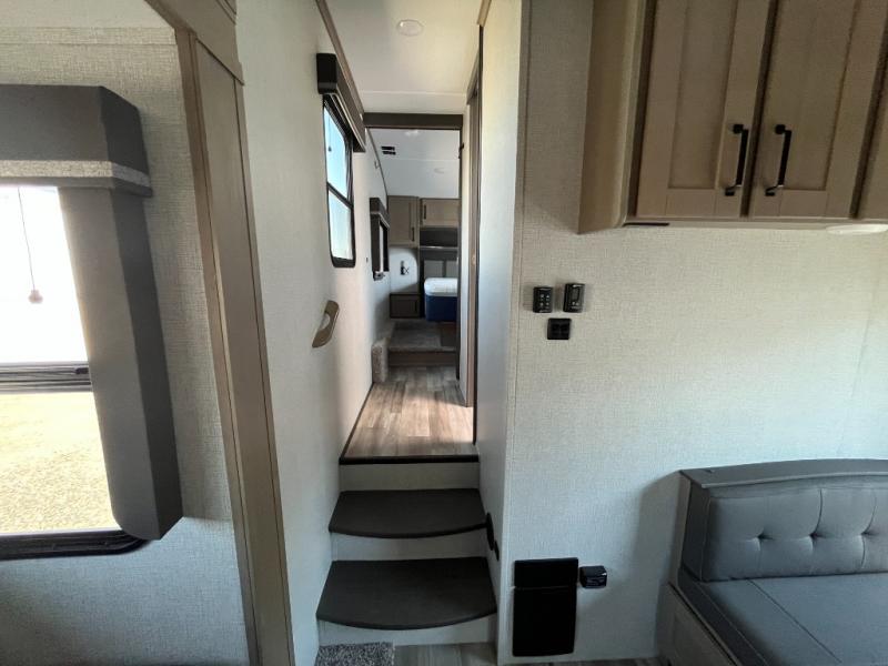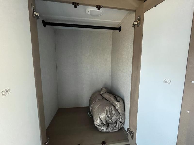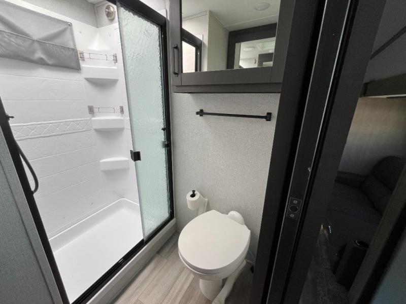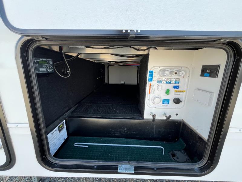 Enjoy a weekend getaway at a campground or off-grid in this fifth wheel! The front private bedroom has a queen bed for you to lay your head on at night and overhead cabinets to keep things out of the way. Inside the full bathroom there is a shower with a skylight for added natural lighting as you get ready each morning. Once you have prepared a delicious home cooked meal at the rear kitchen, head to the booth dinette for a comfortable place to enjoy it. What better way to wind down your nights than to relax on the 70" theatre seating and watch your favorite movie on the 40" LED HDTV. The theatre seats can also be switched out for an optional tri-fold seating if you would prefer that type of seating.