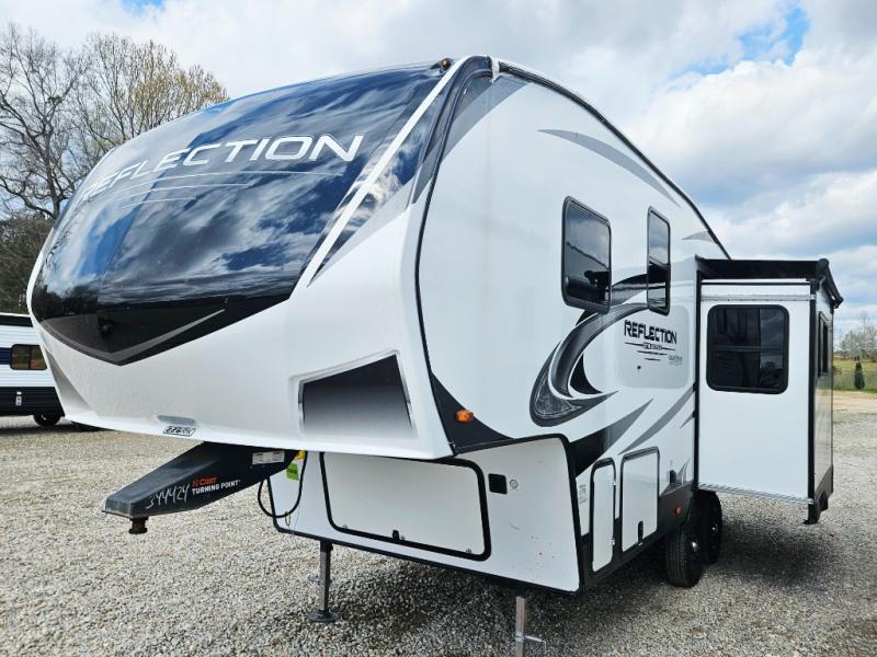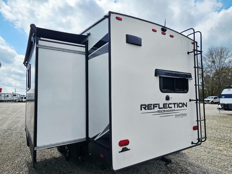 With any Reflection 150 Series fifth wheel by Grand Design, there is more available payload capacity and a broader range of half-ton trucks capable of towing this fifth wheel, and no slider hitch is needed thanks to the 90-degree turning radius which makes them short bed friendly and easier to tow. The mandatory Ultimate Power package provides a "One-Touch" automatic leveling system and a detachable power cord with LED light for easy setup, plus motion sensor pass-through lighting and entry lighting, and the Tire Linc TPMS will help you stay safe on the road. The interior offers residential luxury from the cabinetry and premium congoleum flooring, plus the booth dinette to the residential-style window treatment. Make your refined decision today!