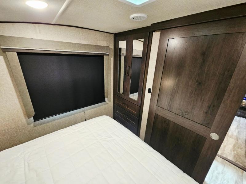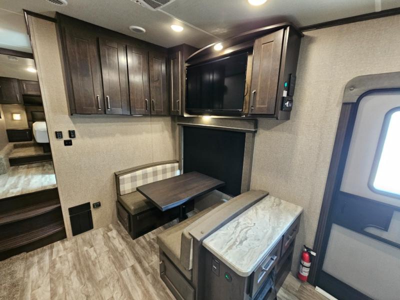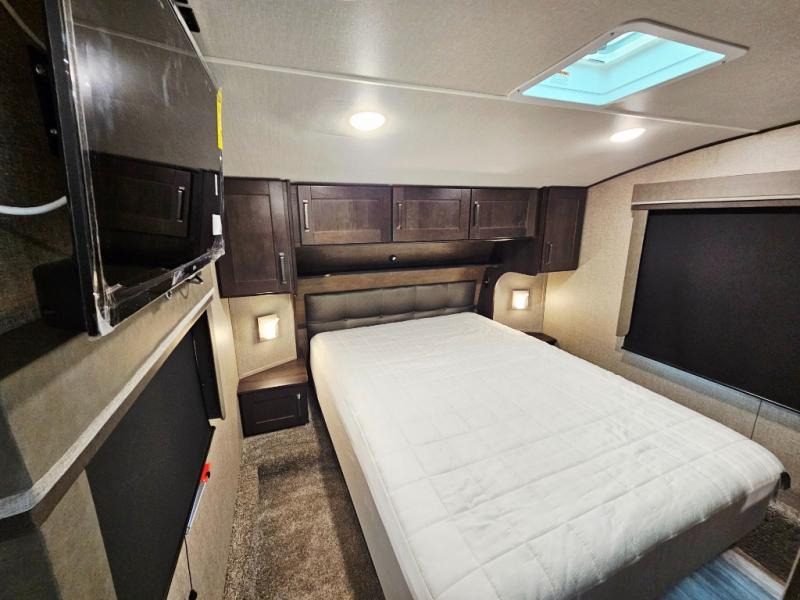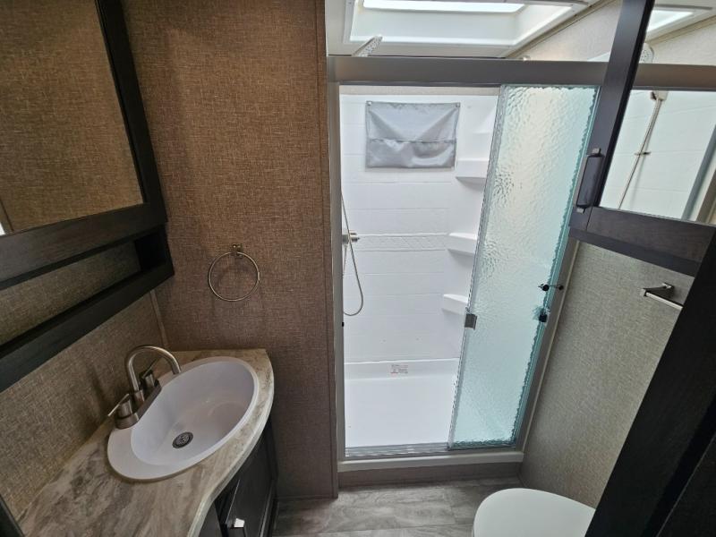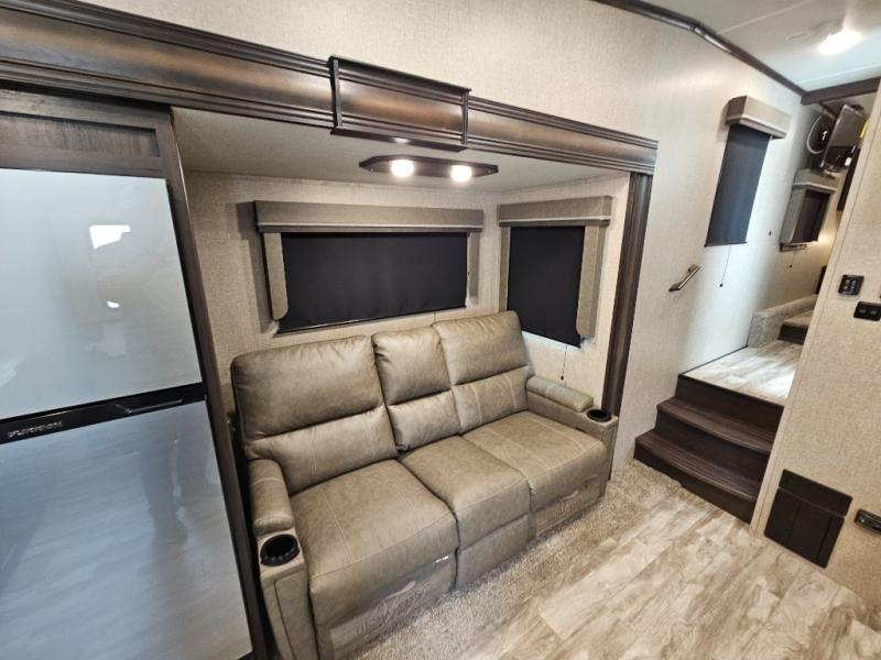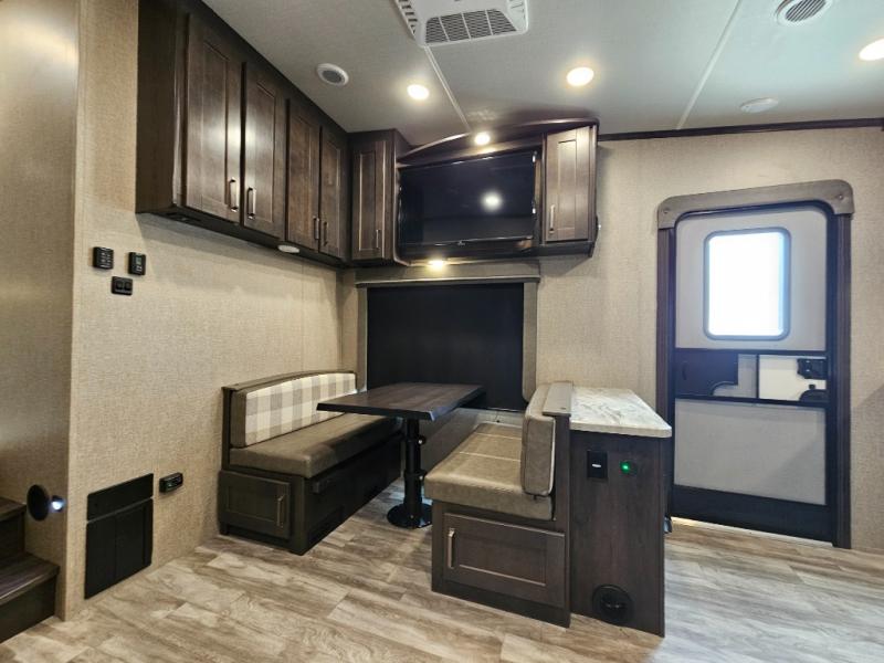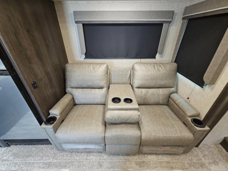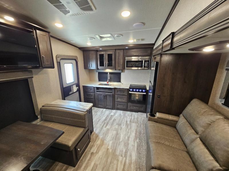 Enjoy a weekend getaway at a campground or off-grid in this fifth wheel! The front private bedroom has a queen bed for you to lay your head on at night and overhead cabinets to keep things out of the way. Inside the full bathroom there is a shower with a skylight for added natural lighting as you get ready each morning. Once you have prepared a delicious home cooked meal at the rear kitchen, head to the booth dinette for a comfortable place to enjoy it. What better way to wind down your nights than to relax on the 70" theatre seating and watch your favorite movie on the 40" LED HDTV. The theatre seats can also be switched out for an optional tri-fold seating if you would prefer that type of seating.