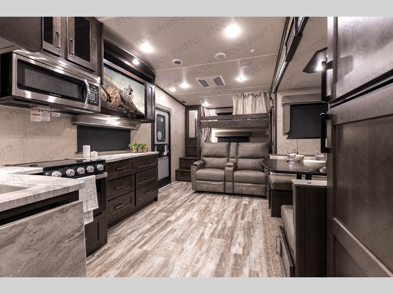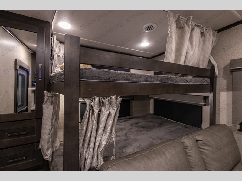 Get away from the hustle and bustle of the city every chance you get with this fifth wheel in tow! Once at your campsite, you can easily set up the single slide and the 20' electric awning and head out for a hike or relax on the U-shaped dinette and theatre seating while watching the 40" LED HDTV. The cook will love the L-shaped kitchen giving them their own space without interruptions and they will have full amenities to keep everyone fed. Everyone can take turns getting cleaned up in the walk-in shower in the full bathroom before calling it a night. The front bedroom offers a walk-around queen bed and plenty of storage, while the rear of this fifth wheel gives the kids or your friends 46" bunk beds to sleep on with their own storage near the step storage. And the U-shaped dinette offers extra sleeping space.
