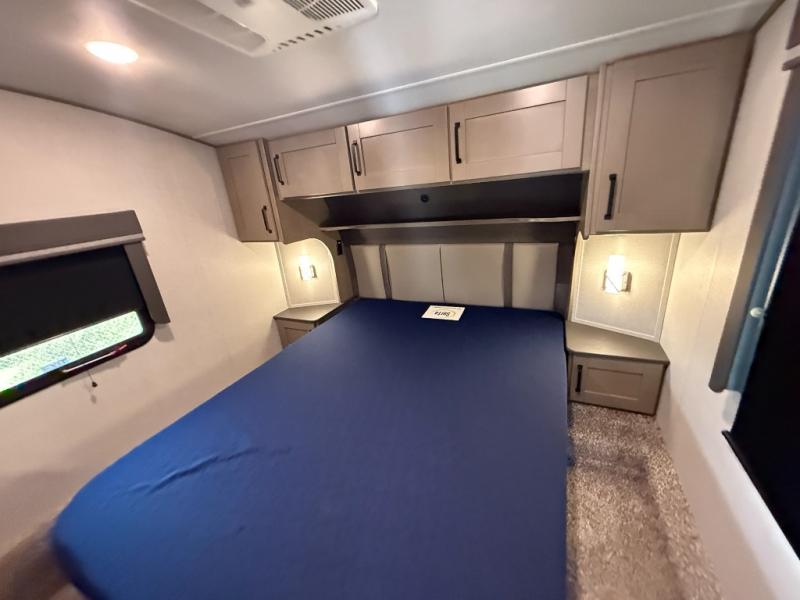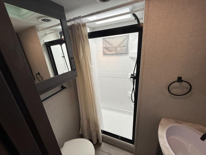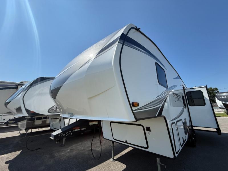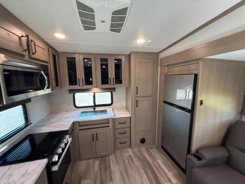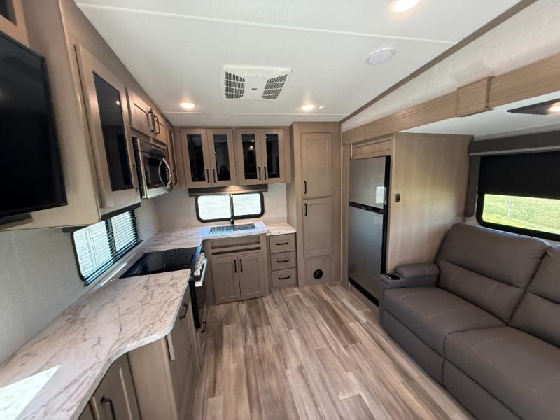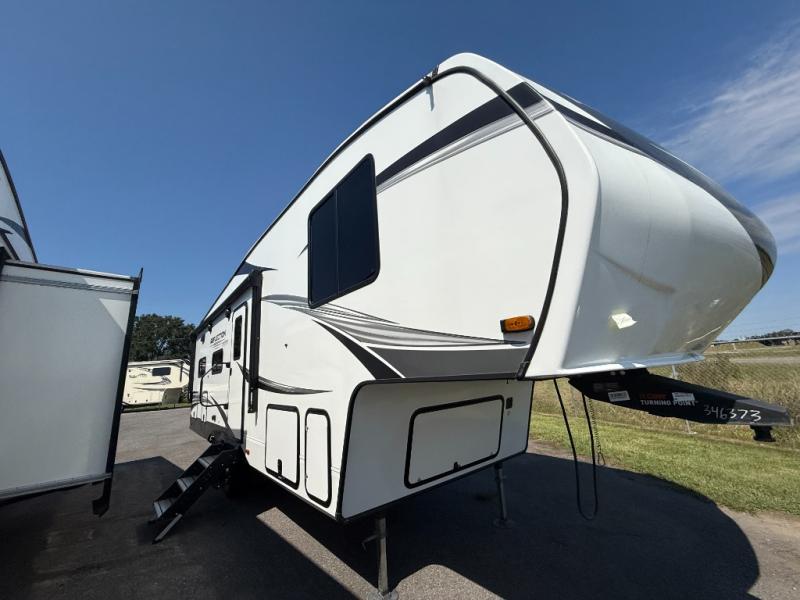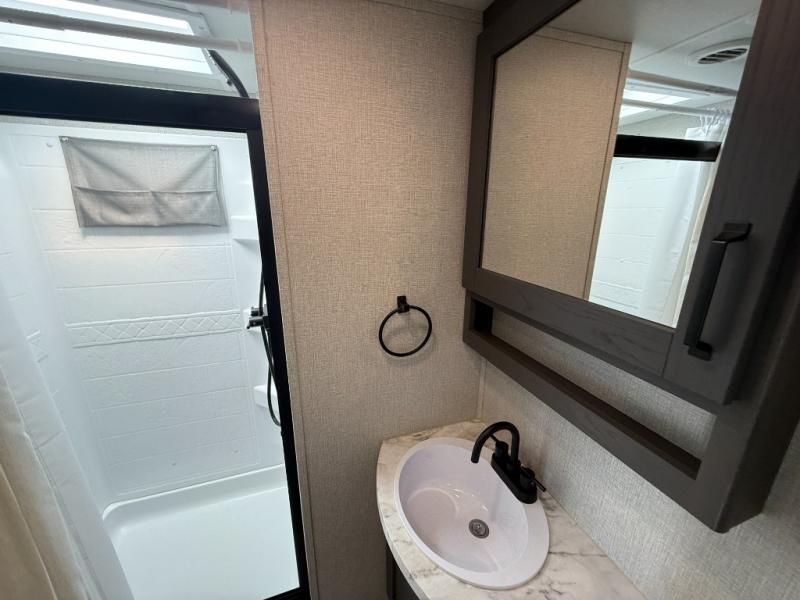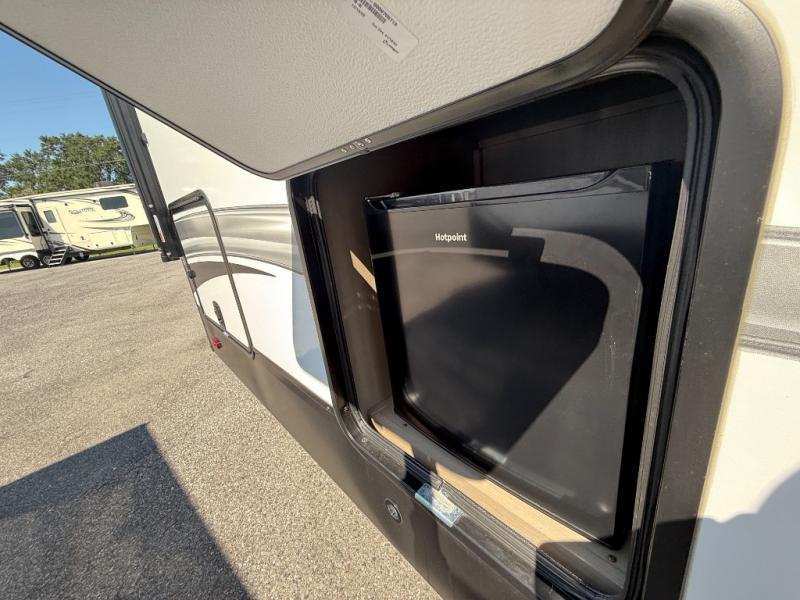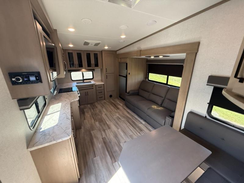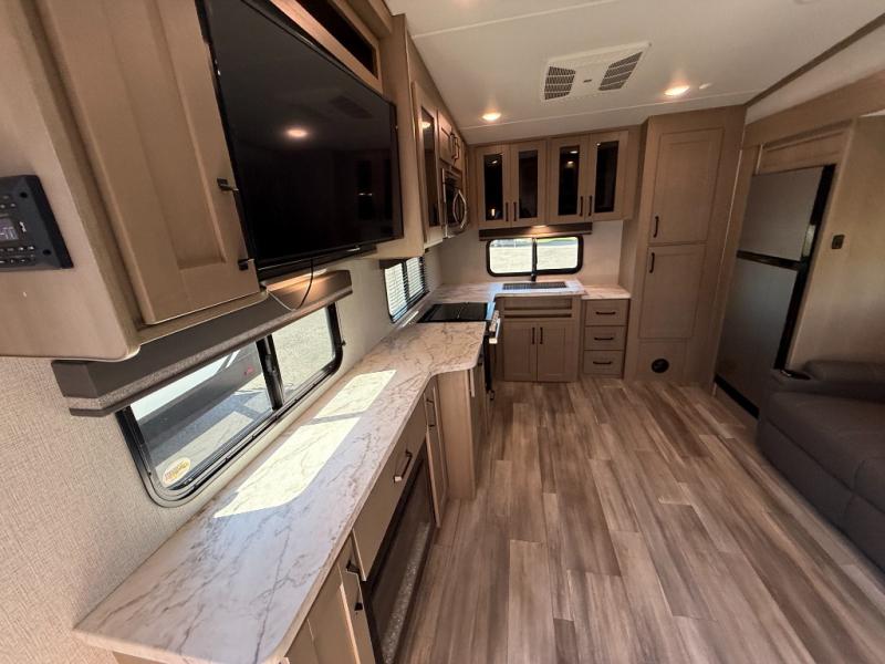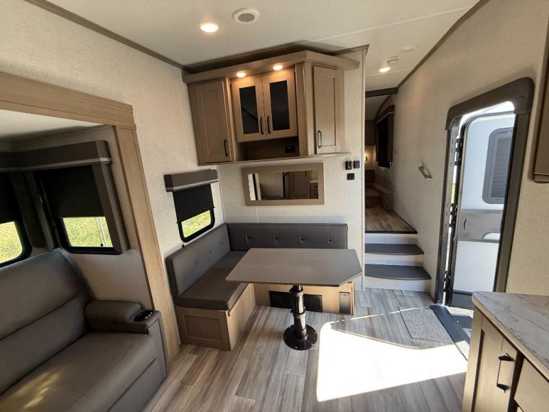 Your short bed truck will love this fifth wheel with swivel pin box and a 90 degree turning radius without a slider hitch. You will love this fifth wheel featuring a single slide for added interior living space and all the comforts and conveniences it provides you while you travel. The slide features a 78" theater seat plus there is a breakfast nook for more seating. Both can easily view the entertainment center with 40" TV. A rear kitchen indoors provides everything you need to create meals like home while on the road, and if you want to spend as much time outside as possible, then the outdoor griddle will certainly accommodate you for meals. Up front, a cozy private bedroom with queen bed, wardrobe, and overhead cabinets. Right next door, you will find a large walk-in shower with skylight for more natural lighting, as well as a toilet, and a vanity with sink and linen cabinet for your towels and toiletries. This unit offers ample storage both inside and out. You will love the full unobstructed pass-through compartment for all of your gear, plus so much more!