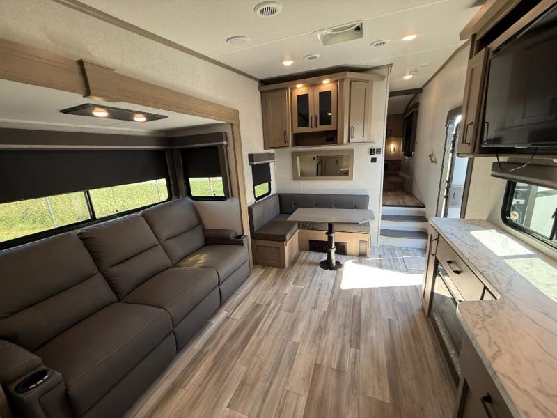 With any Reflection 150 Series fifth wheel by Grand Design, there is more available payload capacity and a broader range of half-ton trucks capable of towing this fifth wheel, and no slider hitch is needed thanks to the 90-degree turning radius which makes them short bed friendly and easier to tow. The mandatory Ultimate Power package provides a "One-Touch" automatic leveling system and a detachable power cord with LED light for easy setup, plus motion sensor pass-through lighting and entry lighting, and the Tire Linc TPMS will help you stay safe on the road. The interior offers residential luxury from the cabinetry and premium congoleum flooring, plus the booth dinette to the residential-style window treatment. Make your refined decision today!
