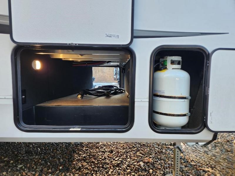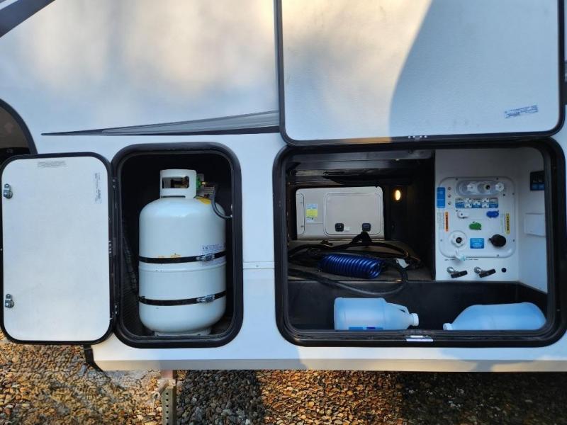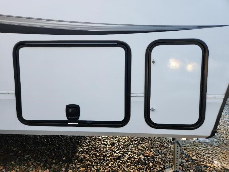 Take your adventures outside with the outdoor kitchen, power awning with LED lighting, and exterior speakers—ideal for cookouts and evening relaxation. The durable construction, all-season insulation, and lightweight design make towing and camping easy, wherever your travels take you.