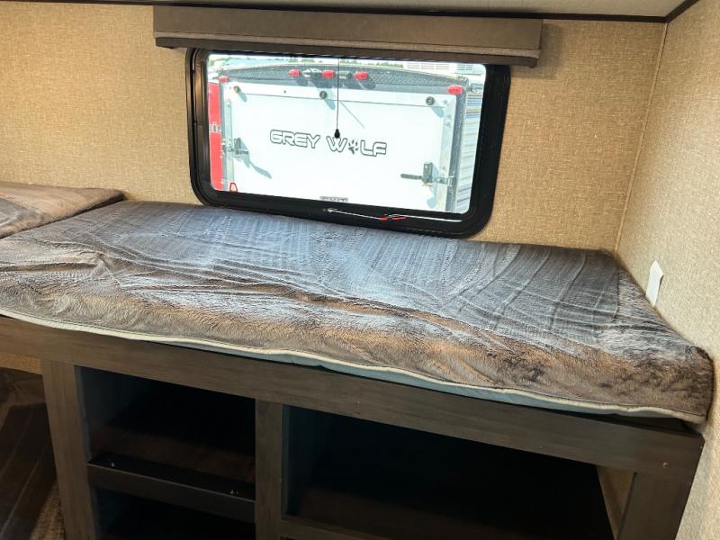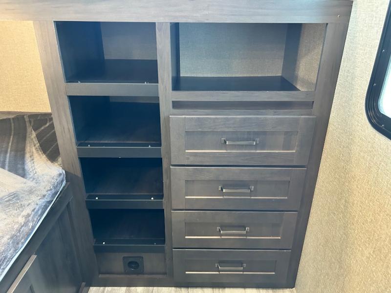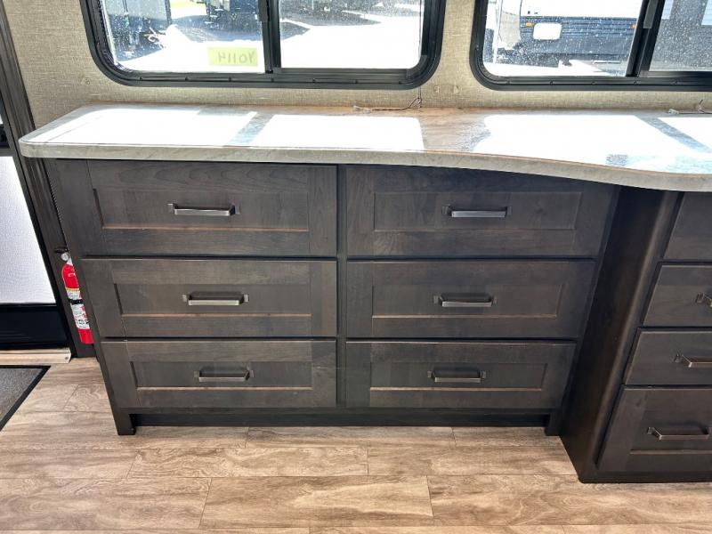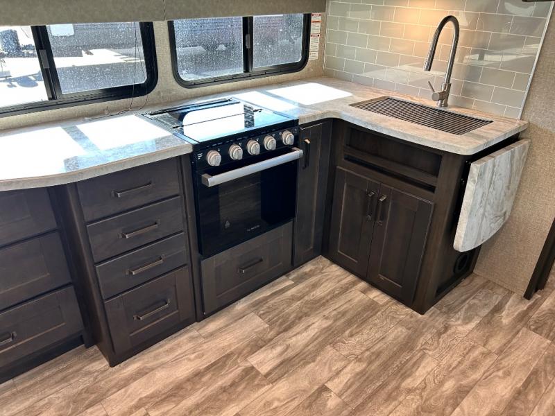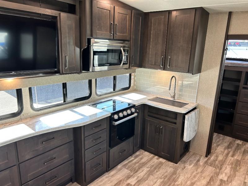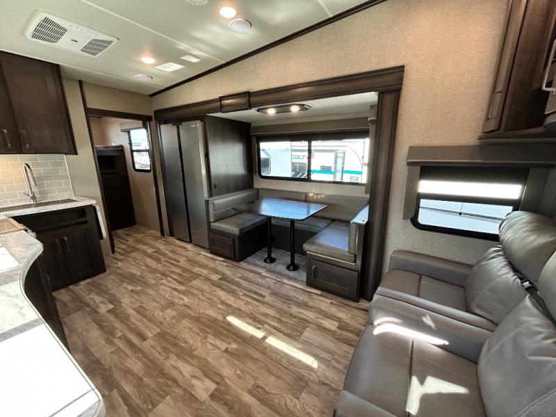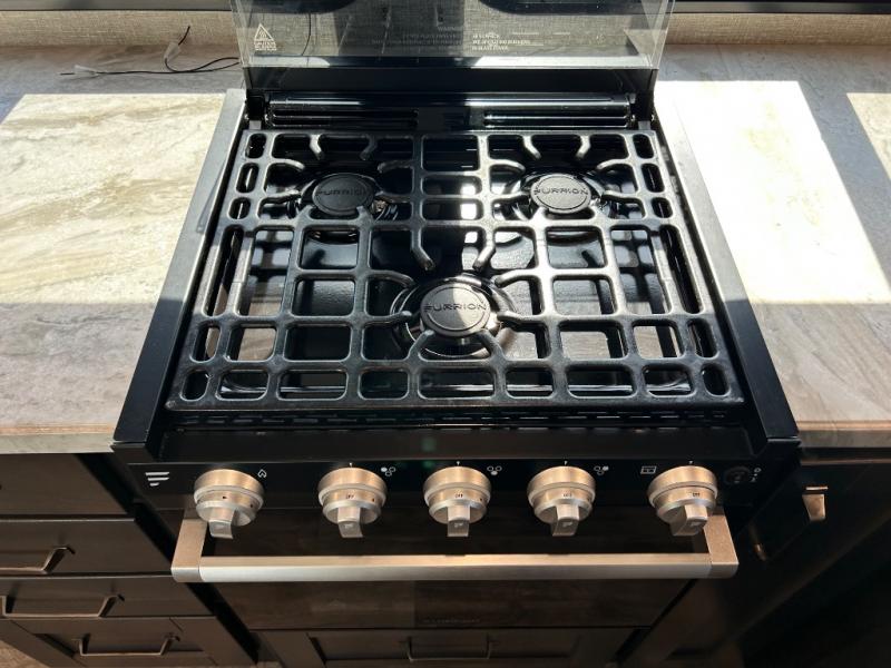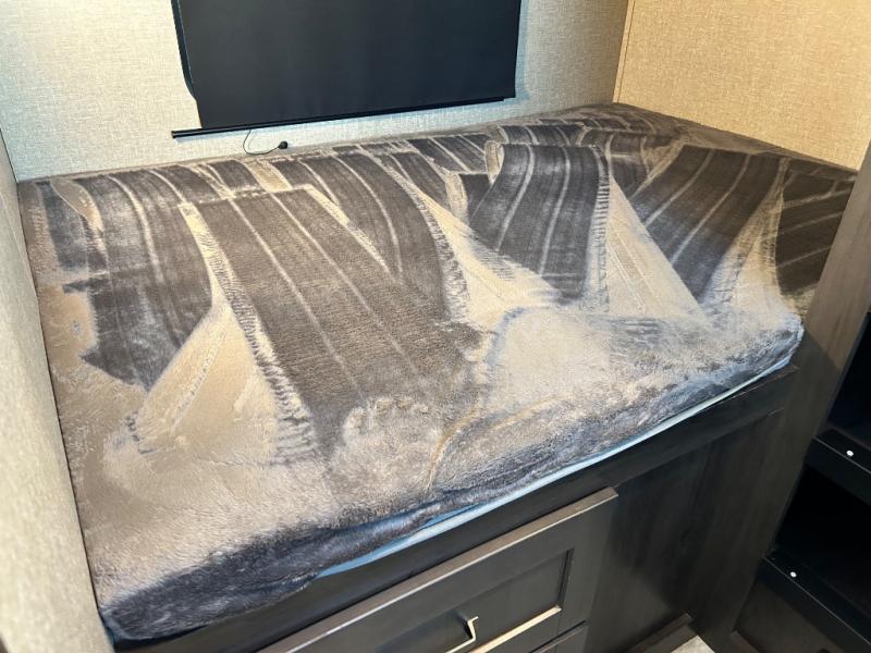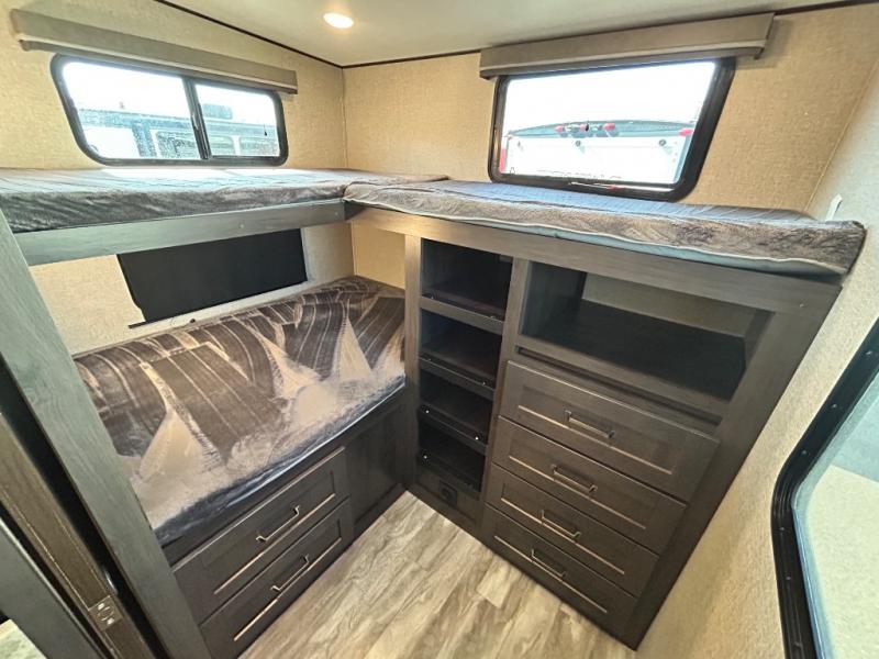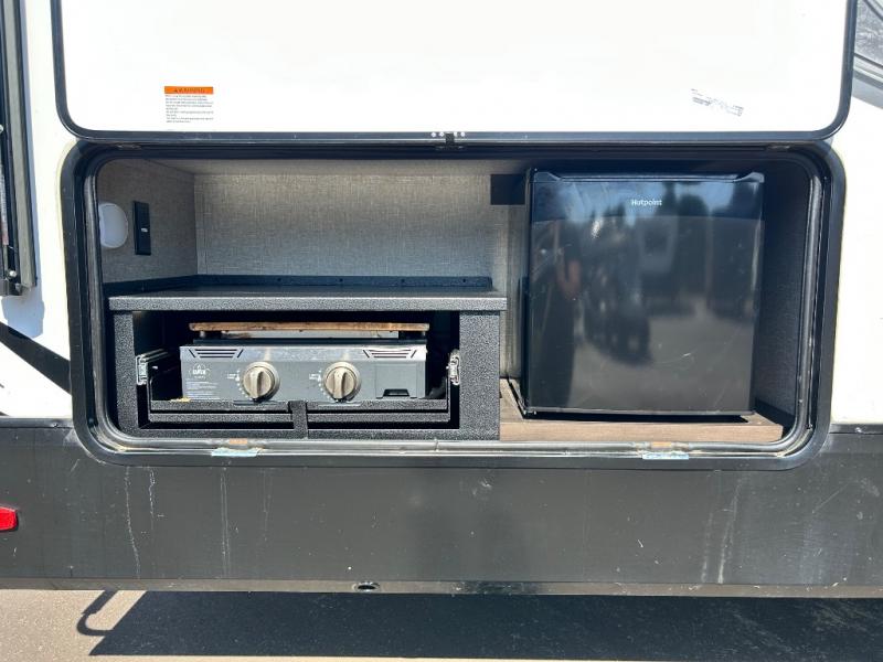 The whole family will enjoy camping in this fifth wheel! The kiddos will love having their own privacy with the rear private bunkhouse that has a 30" top bunk above a set of drawers, a 34" top bunk above a 48" lower bunk, and a TV prep area. You will enjoy having your own private retreat too with a front private bedroom that has a queen bed for a good night's rest and a wardrobe for your hang up clothes. You could even transform the 80" U-shaped dinette and tri-fold sofa into extra sleeping spaces, and the dinette could be switched out for the optional 78" theater seating. The chef will have an easy time preparing their best dishes with the three burner cooktop and flip-up countertop or they can breathe in some fresh air while they cook at the outside kitchen with a griddle and 1.6 cu. ft. refrigerator for a cold beverage!