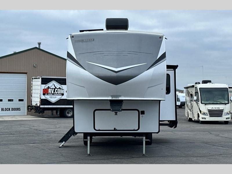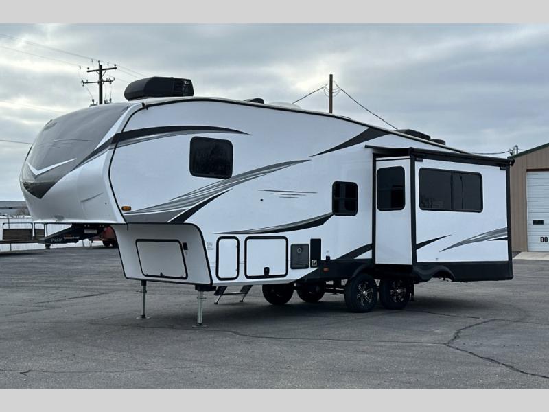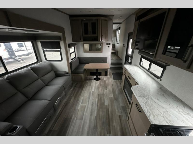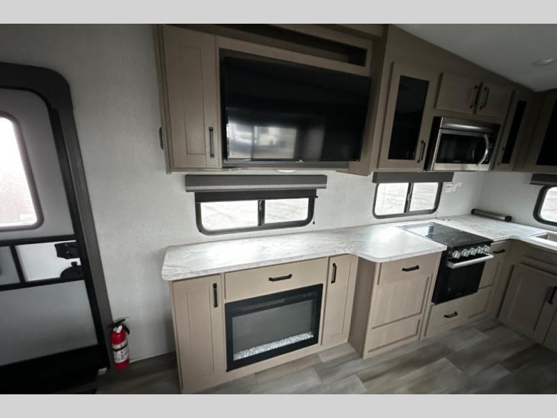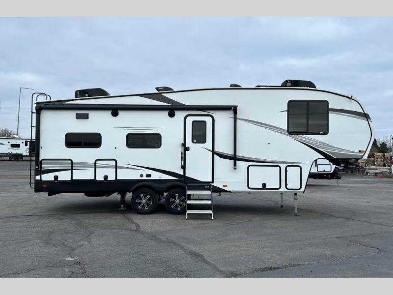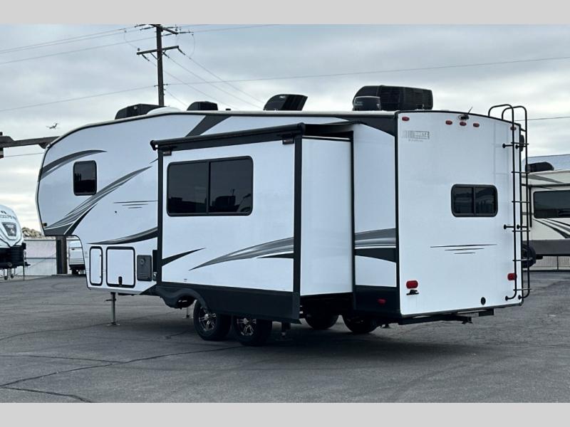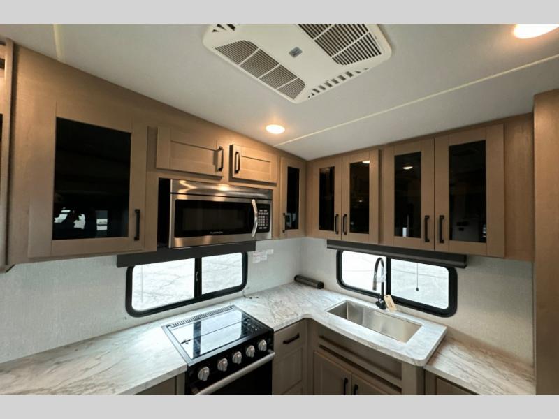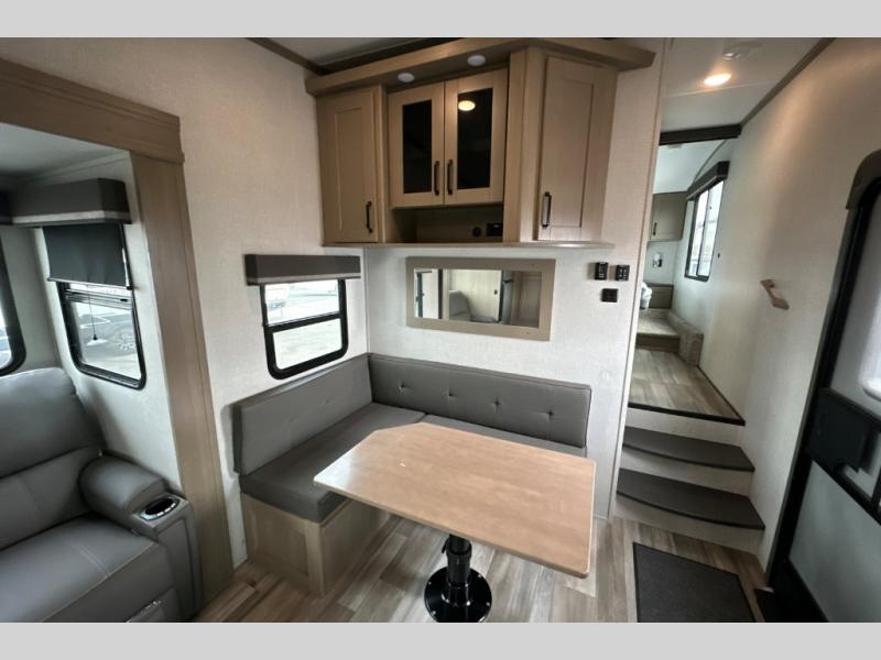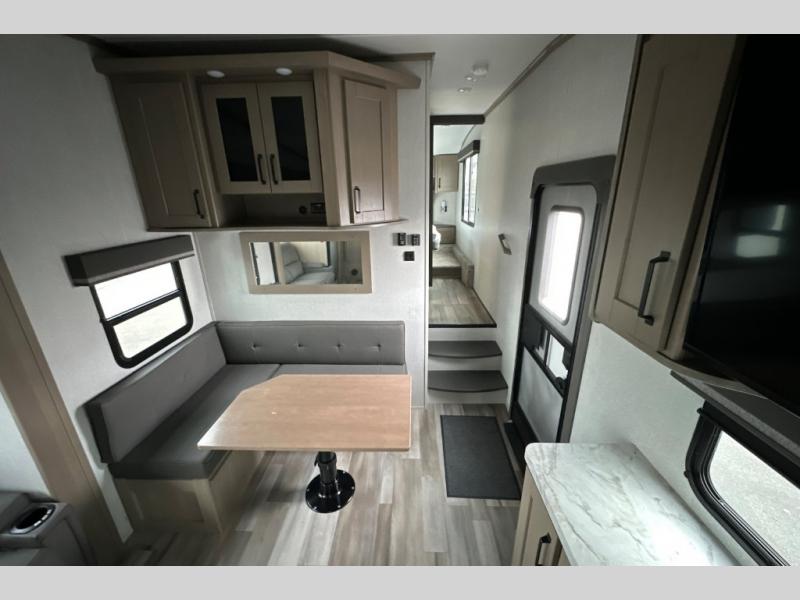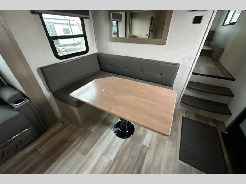 Your short bed truck will love this fifth wheel with swivel pin box and a 90 degree turning radius without a slider hitch. You will love this fifth wheel featuring a single slide for added interior living space and all the comforts and conveniences it provides you while you travel. The slide features a 78" theater seat plus there is a breakfast nook for more seating. Both can easily view the entertainment center with 40" TV. A rear kitchen indoors provides everything you need to create meals like home while on the road, and if you want to spend as much time outside as possible, then the outdoor griddle will certainly accommodate you for meals. Up front, a cozy private bedroom with queen bed, wardrobe, and overhead cabinets. Right next door, you will find a large walk-in shower with skylight for more natural lighting, as well as a toilet, and a vanity with sink and linen cabinet for your towels and toiletries. This unit offers ample storage both inside and out. You will love the full unobstructed pass-through compartment for all of your gear, plus so much more!