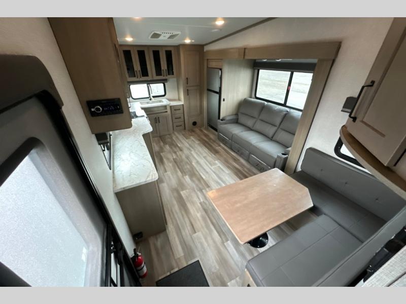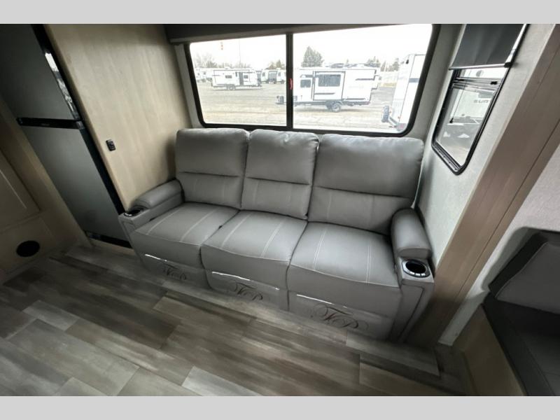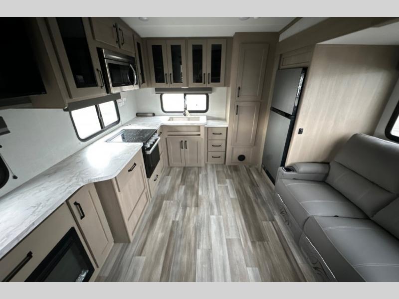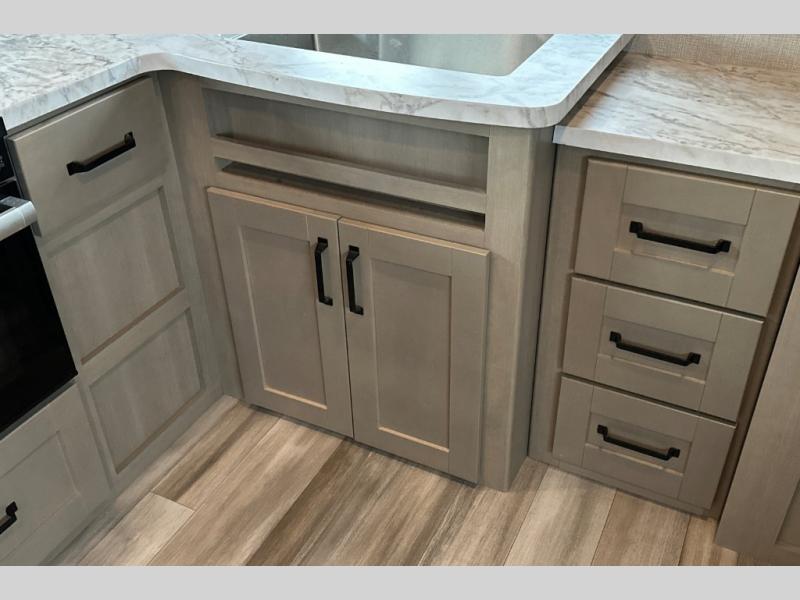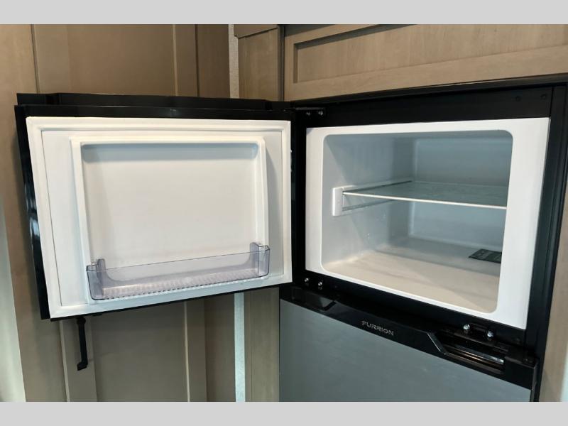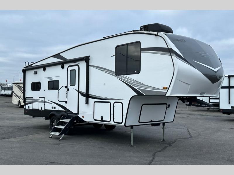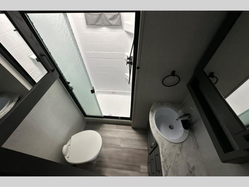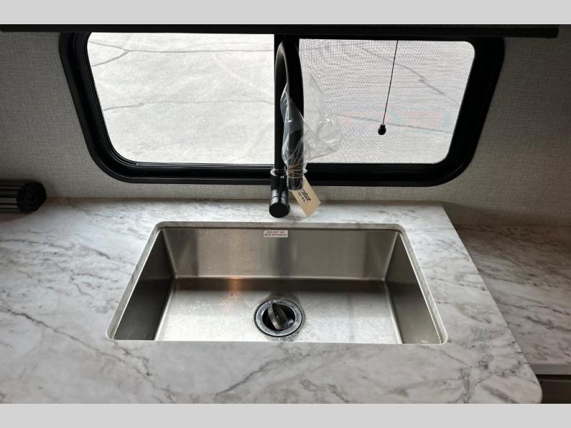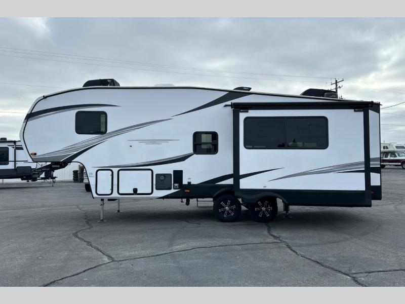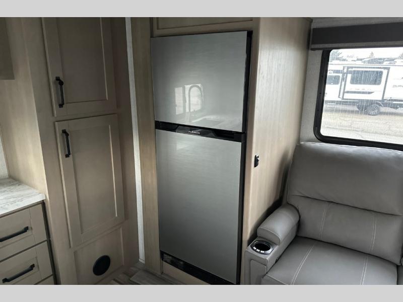 Your short bed truck will love this fifth wheel with swivel pin box and a 90 degree turning radius without a slider hitch. You will love this fifth wheel featuring a single slide for added interior living space and all the comforts and conveniences it provides you while you travel. The slide features a 78" theater seat plus there is a breakfast nook for more seating. Both can easily view the entertainment center with 40" TV. A rear kitchen indoors provides everything you need to create meals like home while on the road, and if you want to spend as much time outside as possible, then the outdoor griddle will certainly accommodate you for meals. Up front, a cozy private bedroom with queen bed, wardrobe, and overhead cabinets. Right next door, you will find a large walk-in shower with skylight for more natural lighting, as well as a toilet, and a vanity with sink and linen cabinet for your towels and toiletries. This unit offers ample storage both inside and out. You will love the full unobstructed pass-through compartment for all of your gear, plus so much more!