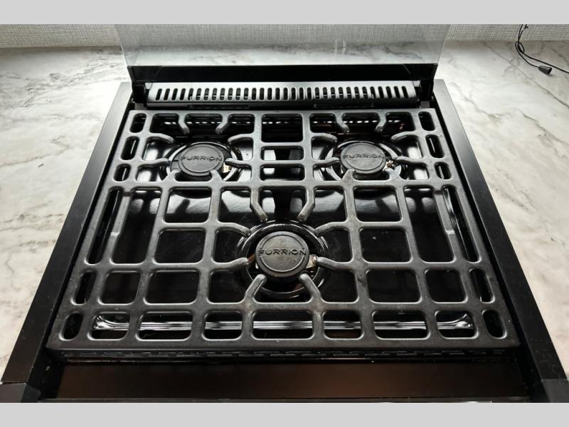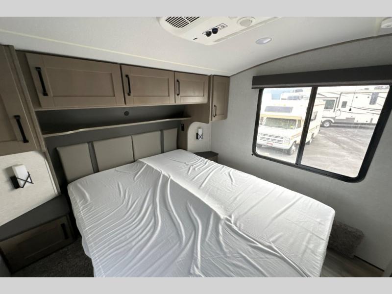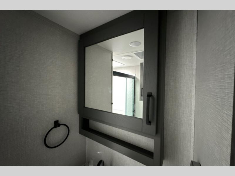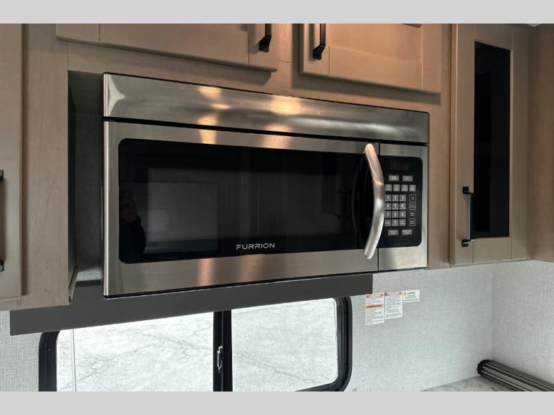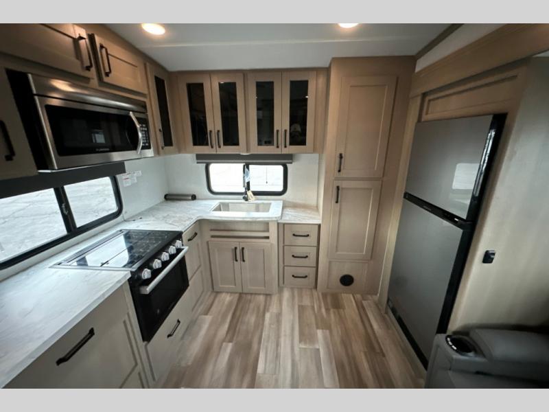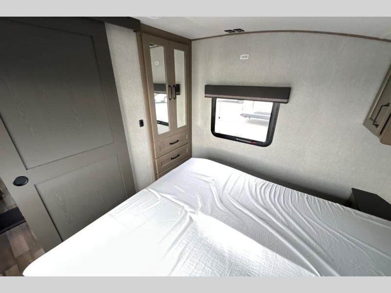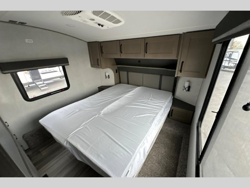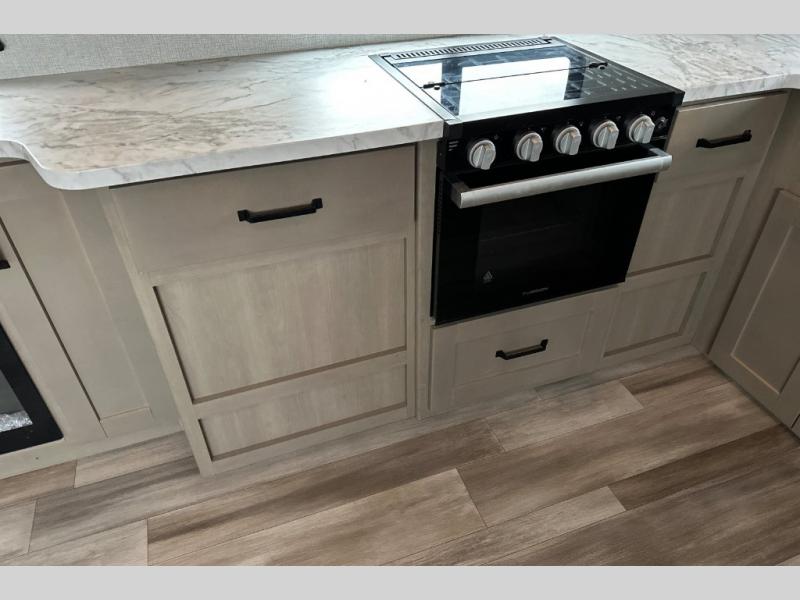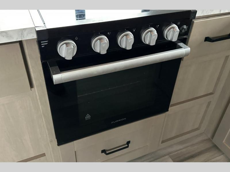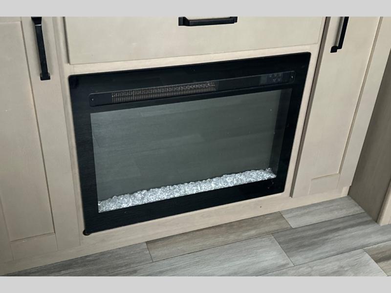Your short bed truck will love this fifth wheel with swivel pin box and a 90 degree turning radius without a slider hitch. You will love this fifth wheel featuring a single slide for added interior living space and all the comforts and conveniences it provides you while you travel. The slide features a 78" theater seat plus there is a breakfast nook for more seating. Both can easily view the entertainment center with 40" TV. A rear kitchen indoors provides everything you need to create meals like home while on the road, and if you want to spend as much time outside as possible, then the outdoor griddle will certainly accommodate you for meals. Up front, a cozy private bedroom with queen bed, wardrobe, and overhead cabinets. Right next door, you will find a large walk-in shower with skylight for more natural lighting, as well as a toilet, and a vanity with sink and linen cabinet for your towels and toiletries. This unit offers ample storage both inside and out. You will love the full unobstructed pass-through compartment for all of your gear, plus so much more!
