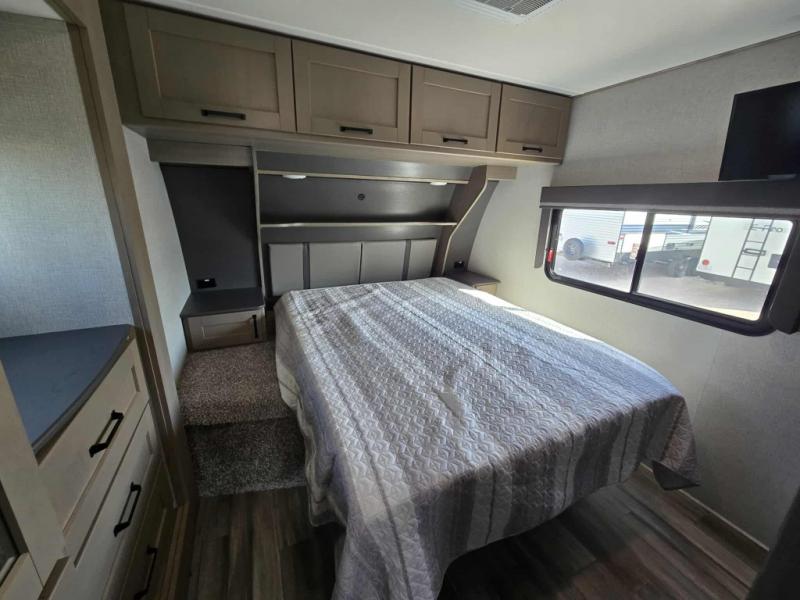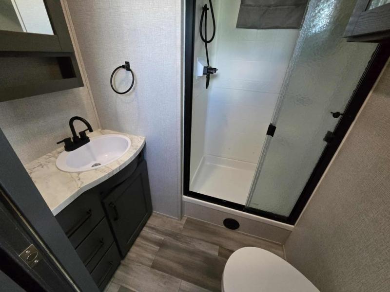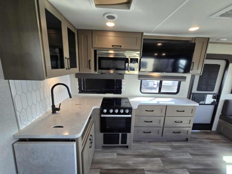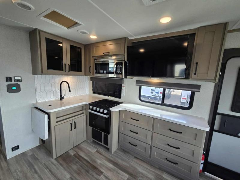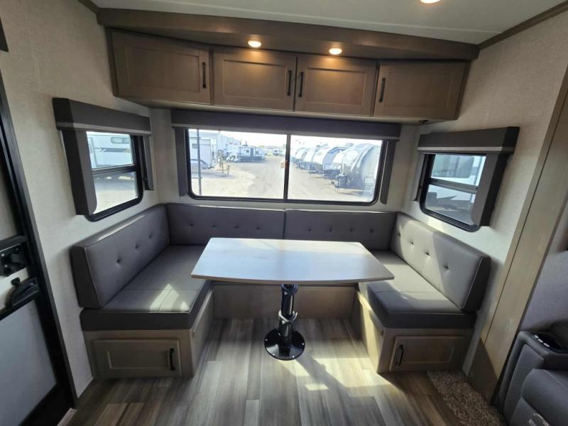 Pack your bags and head out on a comfortable camping trip in this travel trailer! It features a front private bedroom with a queen bed, a set of drawers with an area prepped to add an optional washer and dryer, and a slide that houses a linen closet, a bench, and a wardrobe all with drawers below them. The full bathroom has a shower with a skylight and a linen closet to keep your towels close. The chef can prepare their best home cooked meals with the three burner cooktop, 16 cu. ft. refrigerator, and flip-up countertop extension. Relax on the sofa or the rear U-shaped lounge while you watch a movie with the 40" LED TV at the entertainment center!