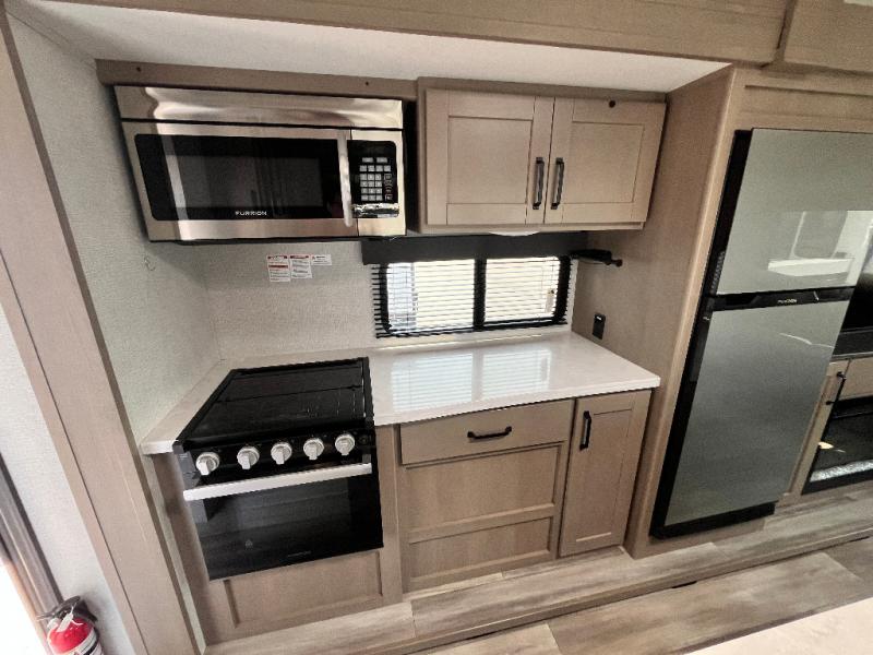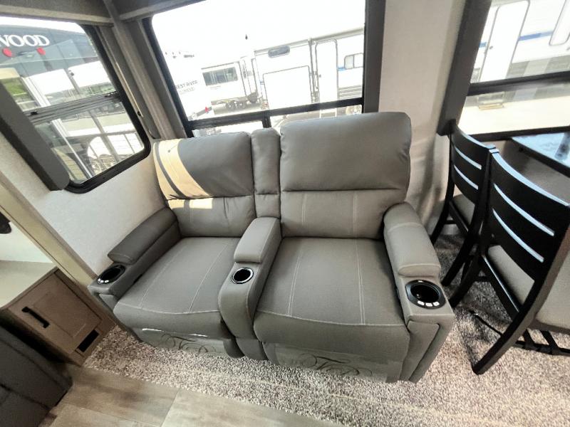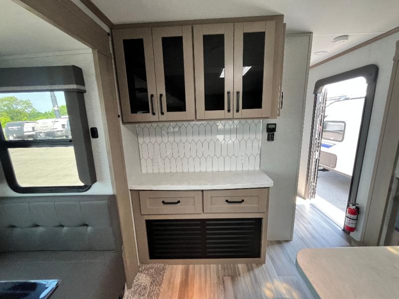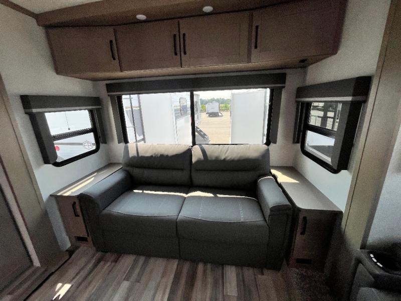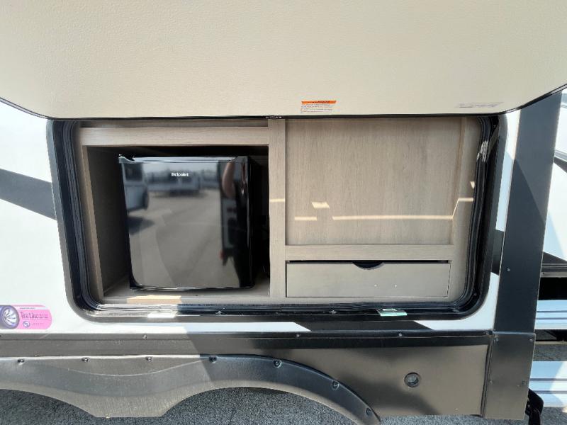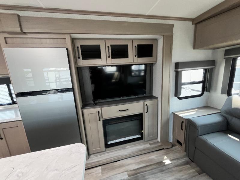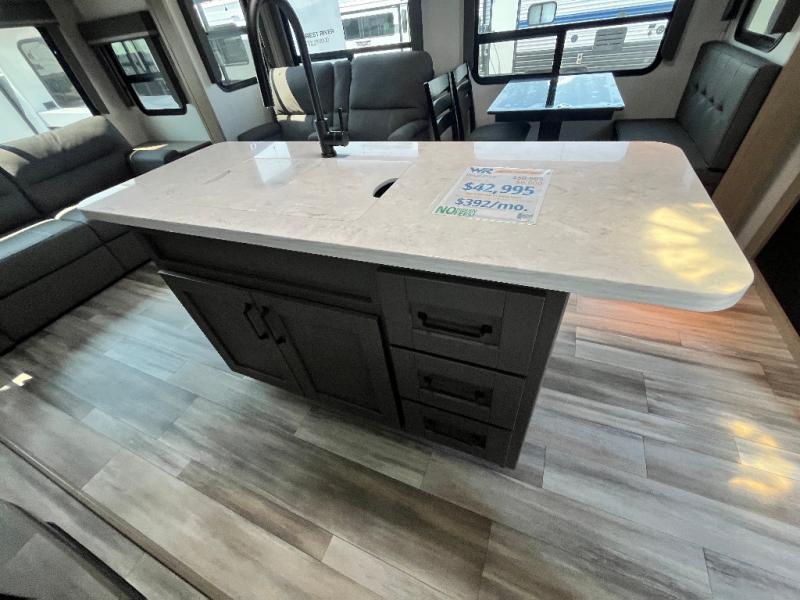 Whether you travel to explore or relax, this trailer will give you the choice depending where you park it! The outside kitchen provides another place to make meals when you want to be in the outdoors, and the inside kitchen amenities offer a gourmet kitchen including a 10 cu. ft. refrigerator, an island, and a hutch. You and your guests will find theatre seating with cupholders, a booth dinette or choose a free standing dinette option, and a tri-fold sofa to sit on and visit while you watch the 40" LED HDTV with fireplace below. The full bathroom includes a space saving sliding door and linen storage, and the bedroom gives you a front walk-around queen bed with storage for your clothes on each side, plus there is an additional wardrobe with drawers and the option to add a washer/dryer to the prepped space.