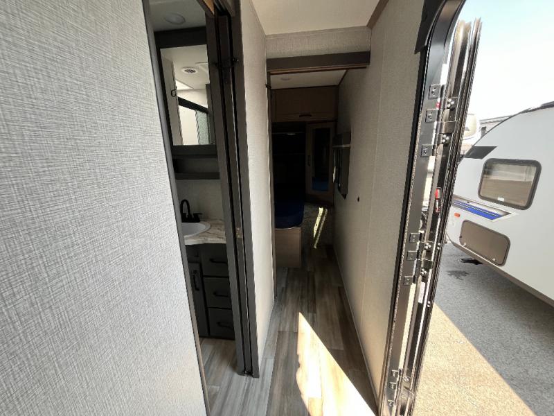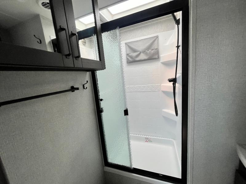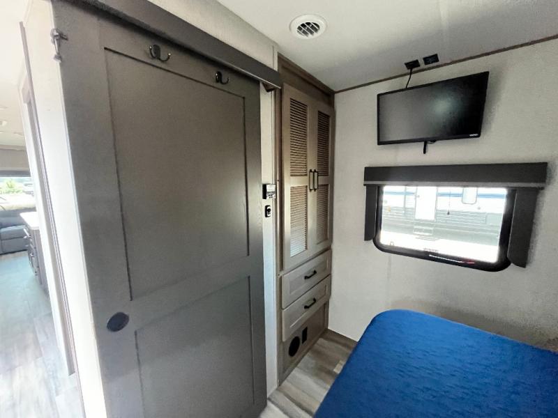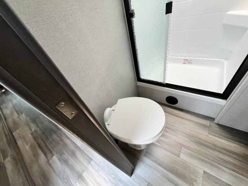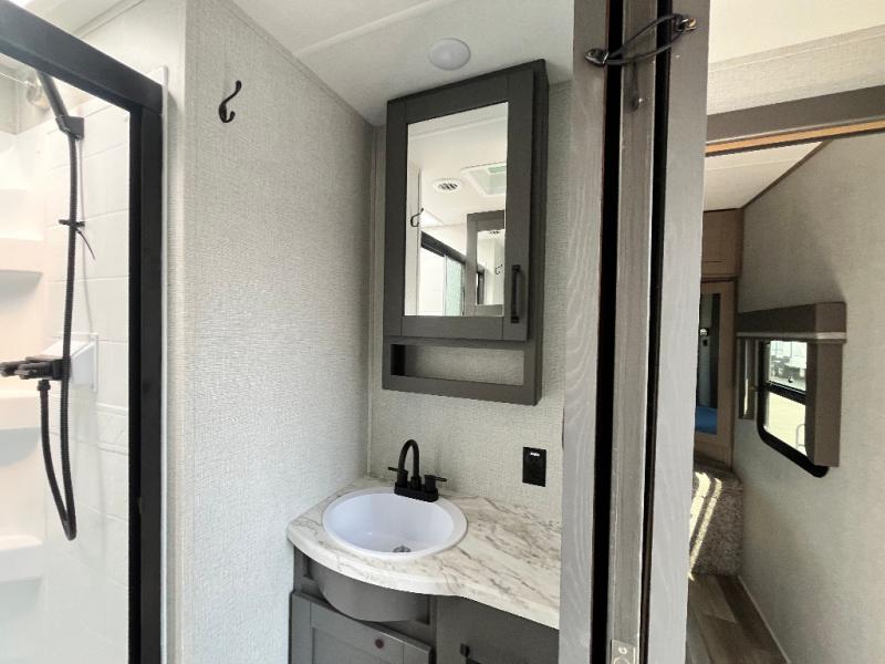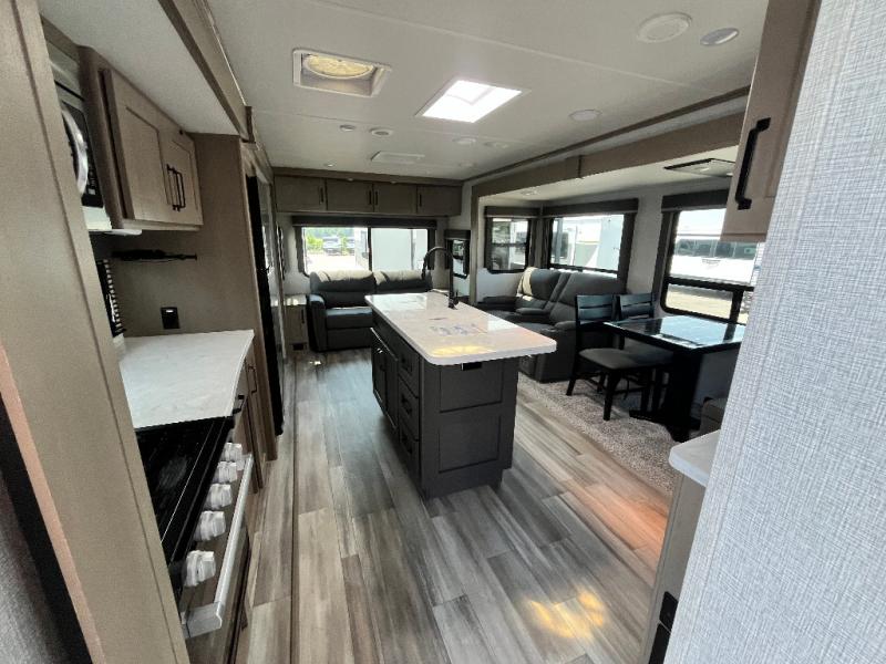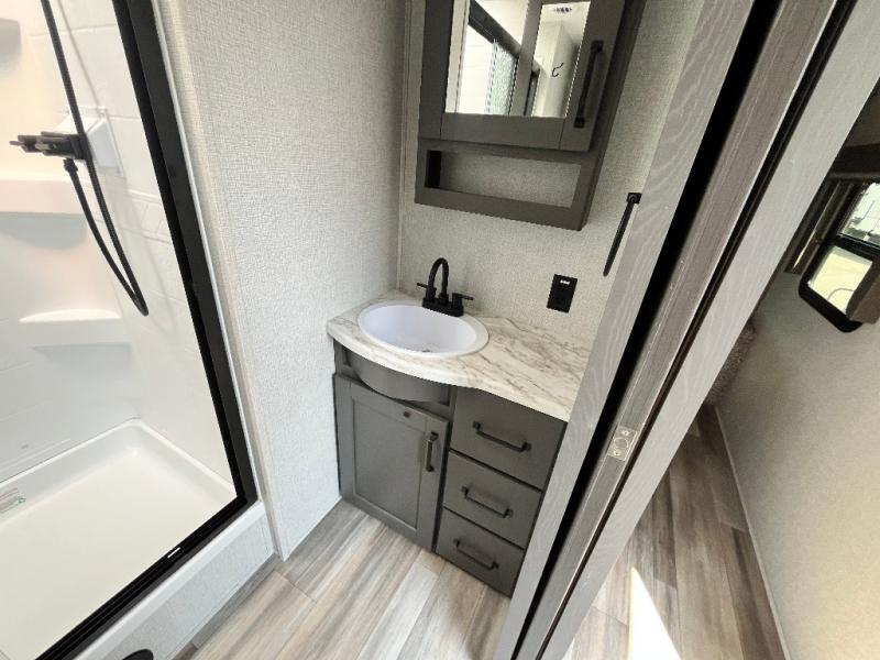 Whether you travel to explore or relax, this trailer will give you the choice depending where you park it! The outside kitchen provides another place to make meals when you want to be in the outdoors, and the inside kitchen amenities offer a gourmet kitchen including a 10 cu. ft. refrigerator, an island, and a hutch. You and your guests will find theatre seating with cupholders, a booth dinette or choose a free standing dinette option, and a tri-fold sofa to sit on and visit while you watch the 40" LED HDTV with fireplace below. The full bathroom includes a space saving sliding door and linen storage, and the bedroom gives you a front walk-around queen bed with storage for your clothes on each side, plus there is an additional wardrobe with drawers and the option to add a washer/dryer to the prepped space.