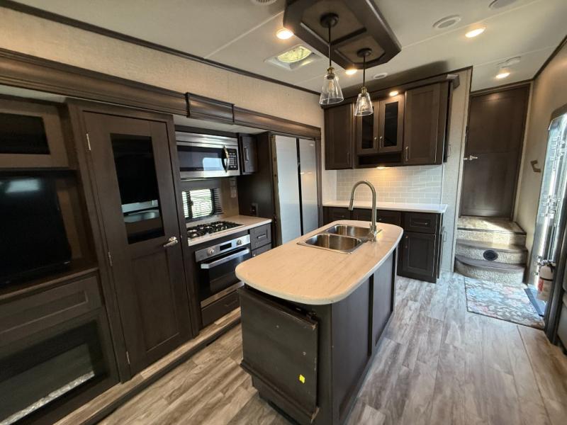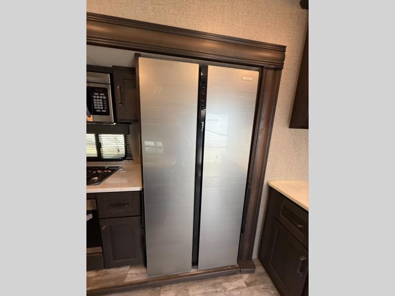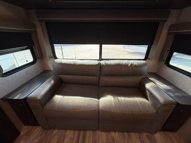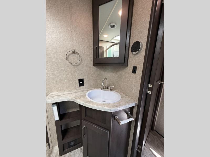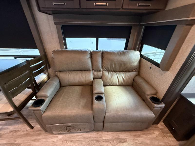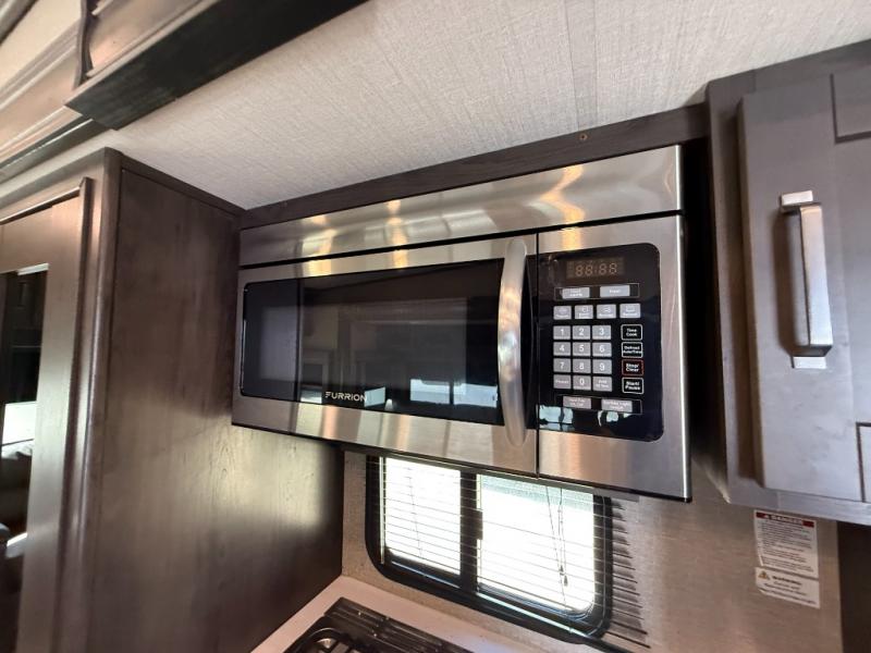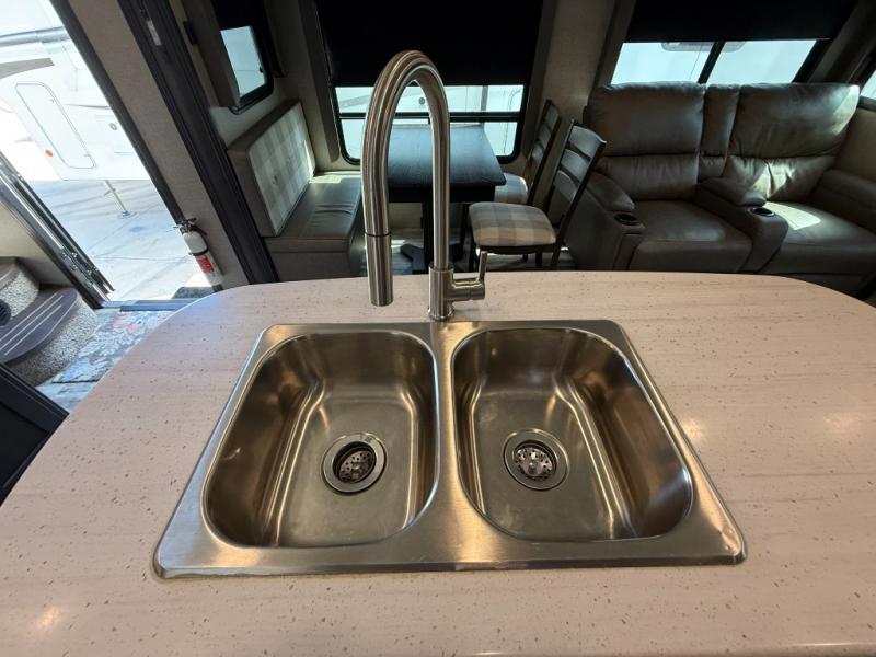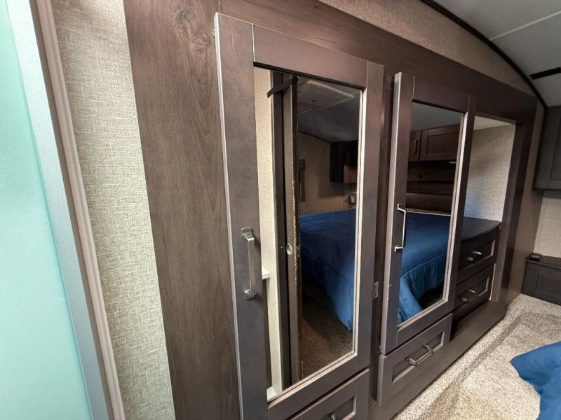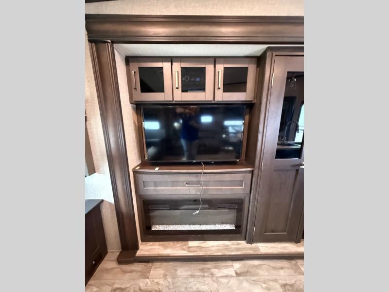 Whether you travel for pleasure or work, you will love the spacious main living and kitchen area with a rear tri-fold sofa that doubles as extra sleeping space, and the theatre seating directly across from the entertainment center with a 40" LED HDTV and a fireplace below. The kitchen island will make meal prepping and drying the dishes easier and the hutch is the perfect place to place your picture frames, nice dishes, and extra cooking items. There is even a pantry that is big enough to store all of your favorite snacks, dry ingredients and such. Outside you can enjoy two electric awnings that provide protection from the elements as you relax and visit with other RVers, and your camping chairs can easily be stored in the pass-through compartment. The double entry bathroom is convenient especially at night when you can slide the door to enter from the front master bedroom. You will find plenty of storage for your clothing and gear, plus the bedroom slide out gives you drawers and linen storage that stretches into the full bathroom.