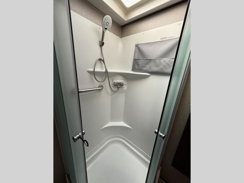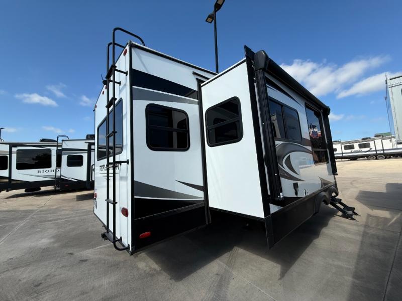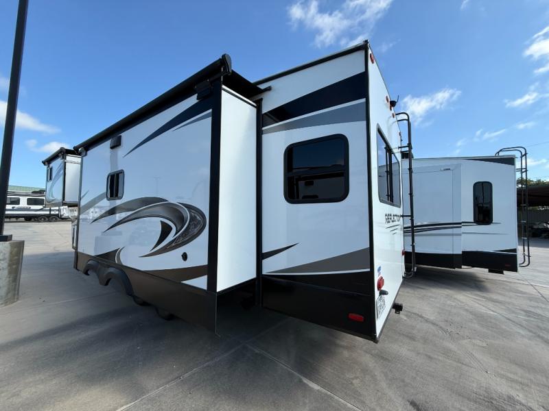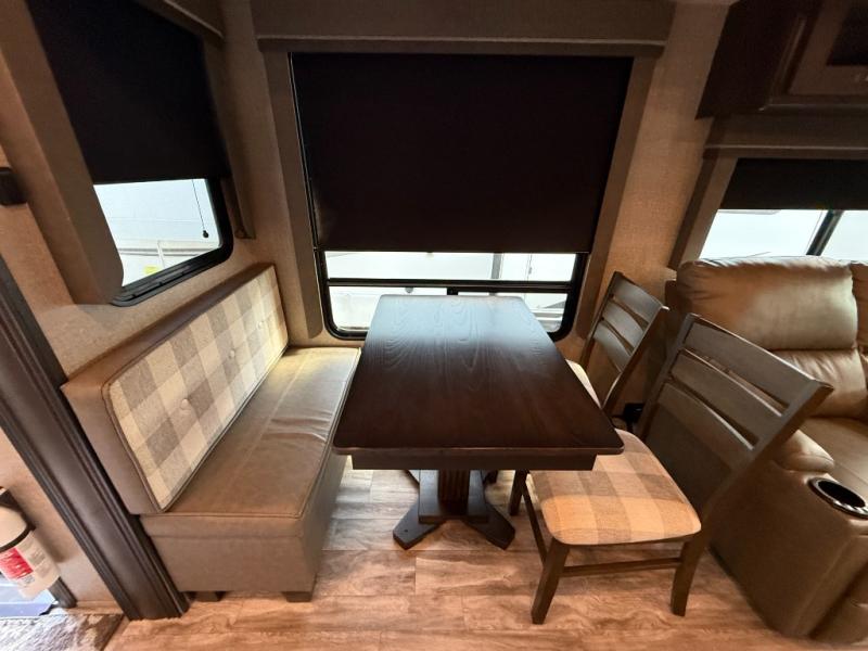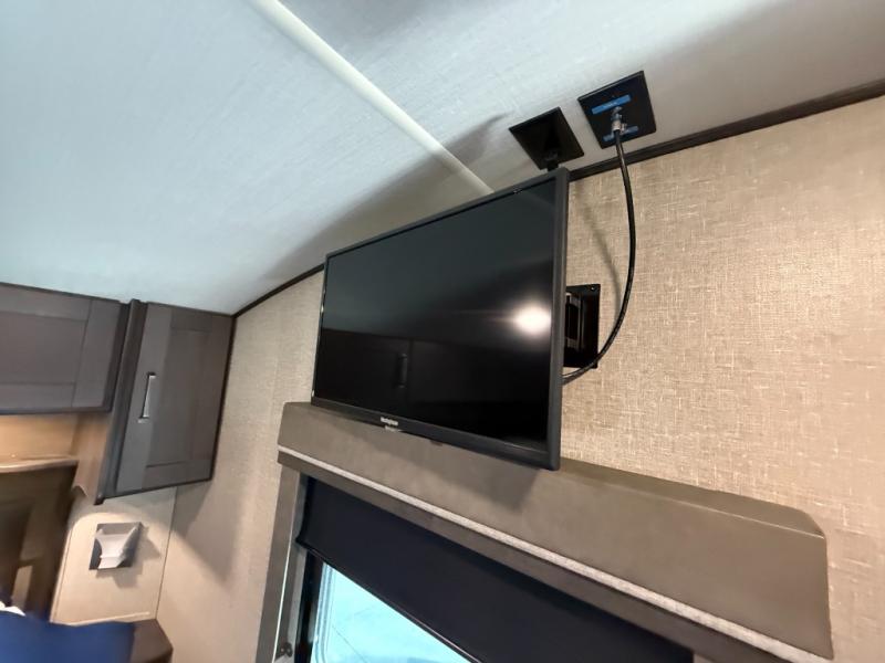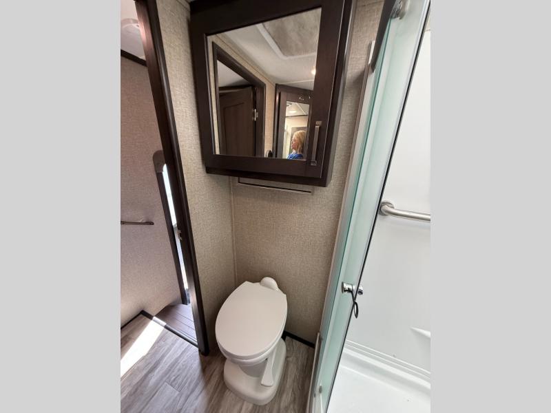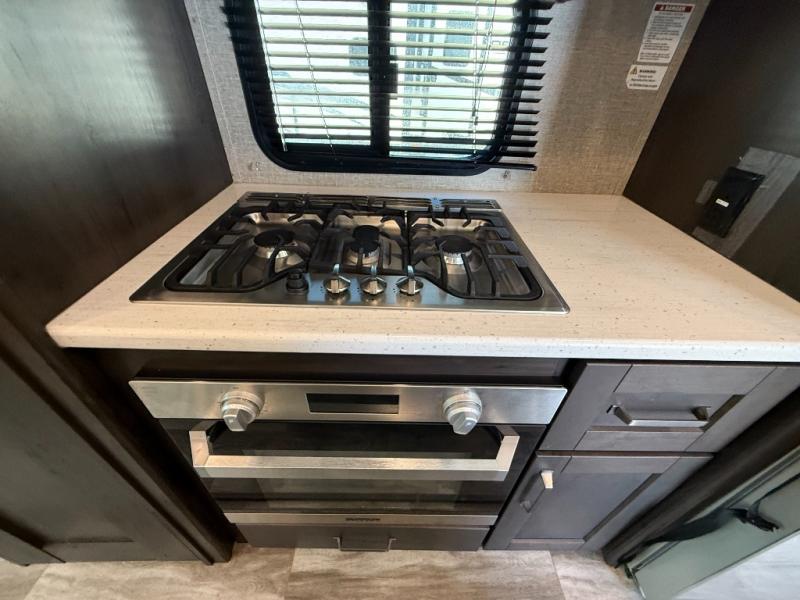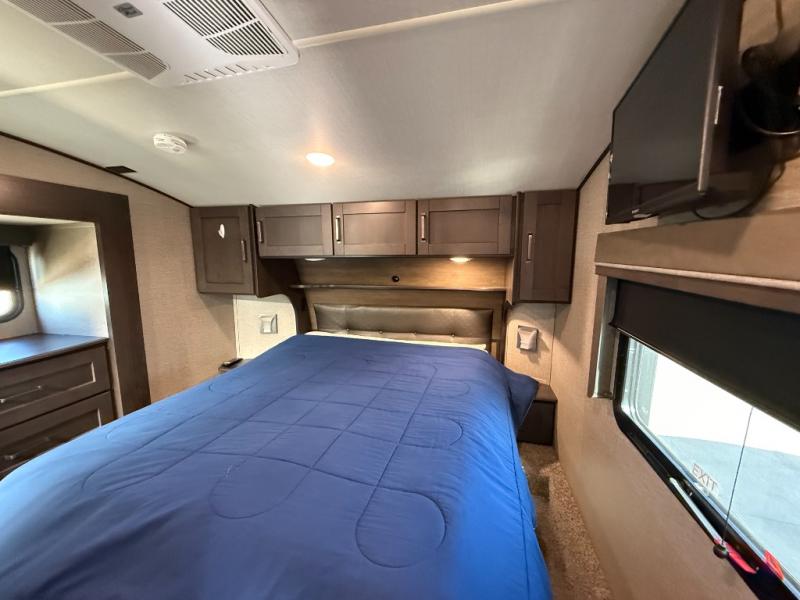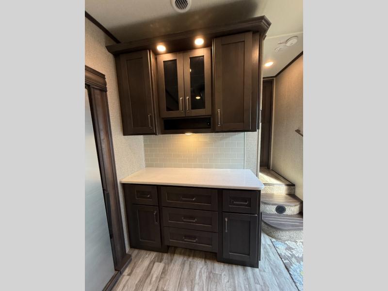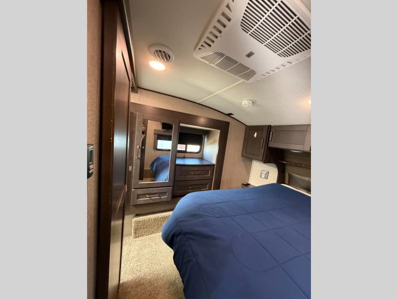 Whether you travel for pleasure or work, you will love the spacious main living and kitchen area with a rear tri-fold sofa that doubles as extra sleeping space, and the theatre seating directly across from the entertainment center with a 40" LED HDTV and a fireplace below. The kitchen island will make meal prepping and drying the dishes easier and the hutch is the perfect place to place your picture frames, nice dishes, and extra cooking items. There is even a pantry that is big enough to store all of your favorite snacks, dry ingredients and such. Outside you can enjoy two electric awnings that provide protection from the elements as you relax and visit with other RVers, and your camping chairs can easily be stored in the pass-through compartment. The double entry bathroom is convenient especially at night when you can slide the door to enter from the front master bedroom. You will find plenty of storage for your clothing and gear, plus the bedroom slide out gives you drawers and linen storage that stretches into the full bathroom.