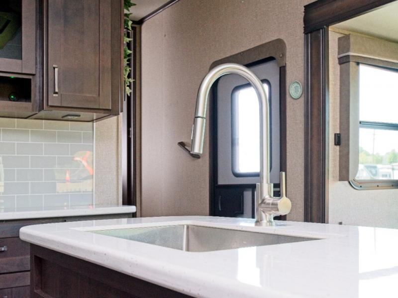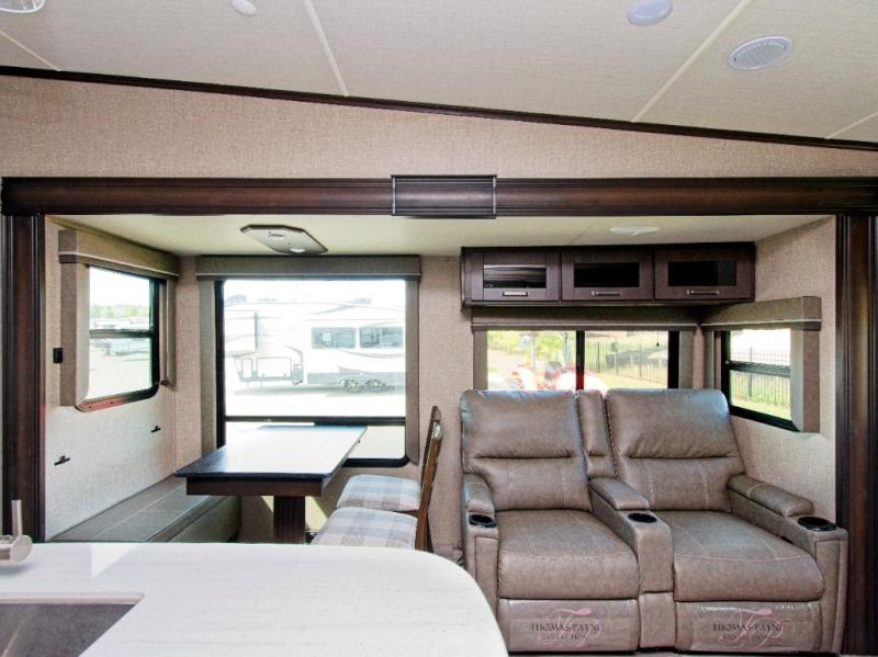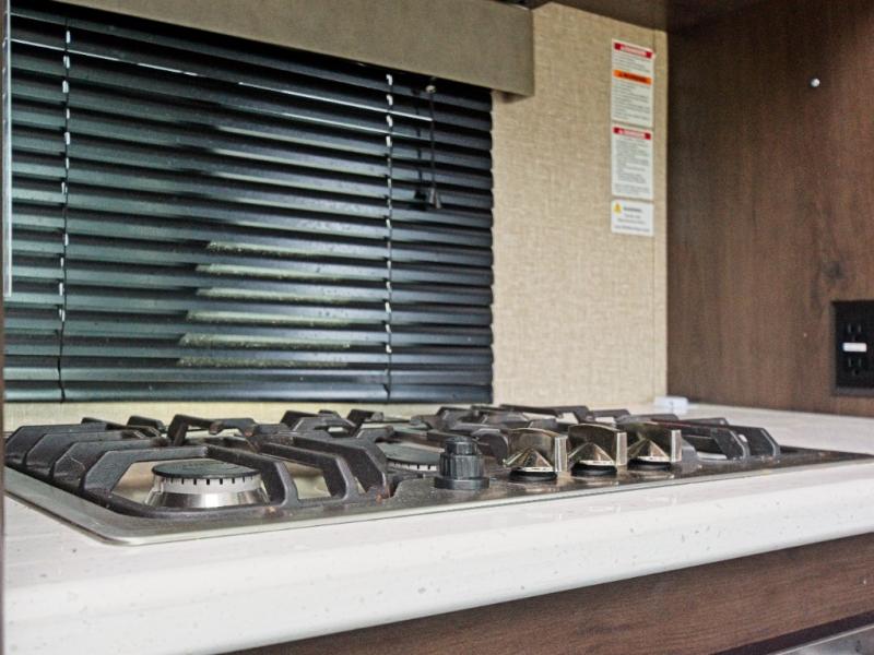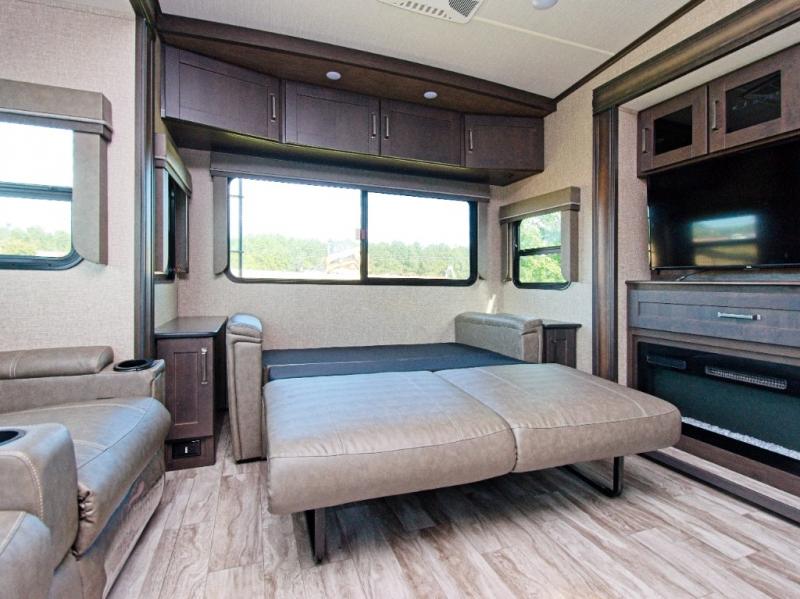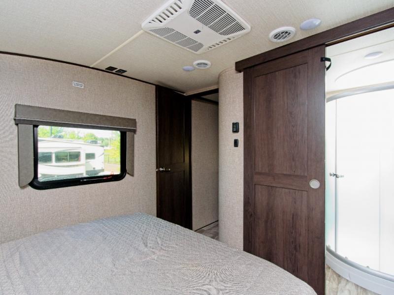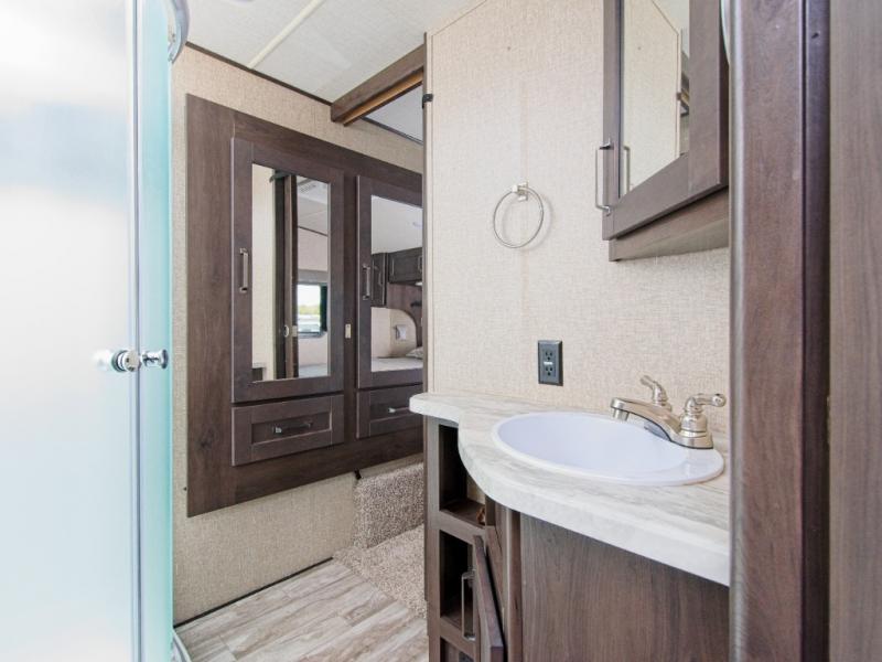 Inside, enjoy residential cabinetry, solid surface countertops, blackout roller shades, and a spacious shower with glass door—all designed to make your RV feel like home.