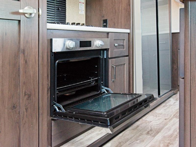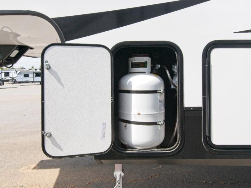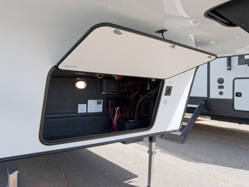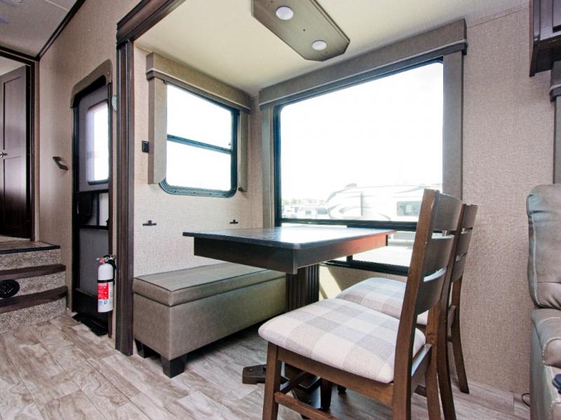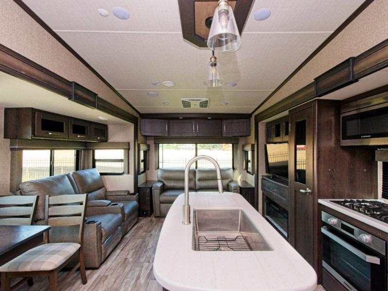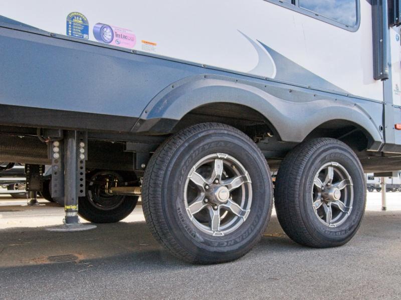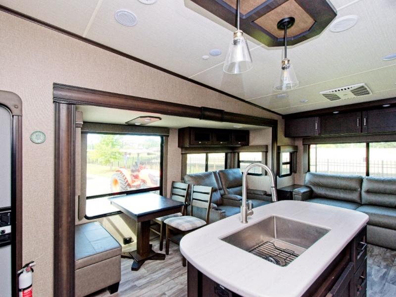 Inside, enjoy residential cabinetry, solid surface countertops, blackout roller shades, and a spacious shower with glass door—all designed to make your RV feel like home.
