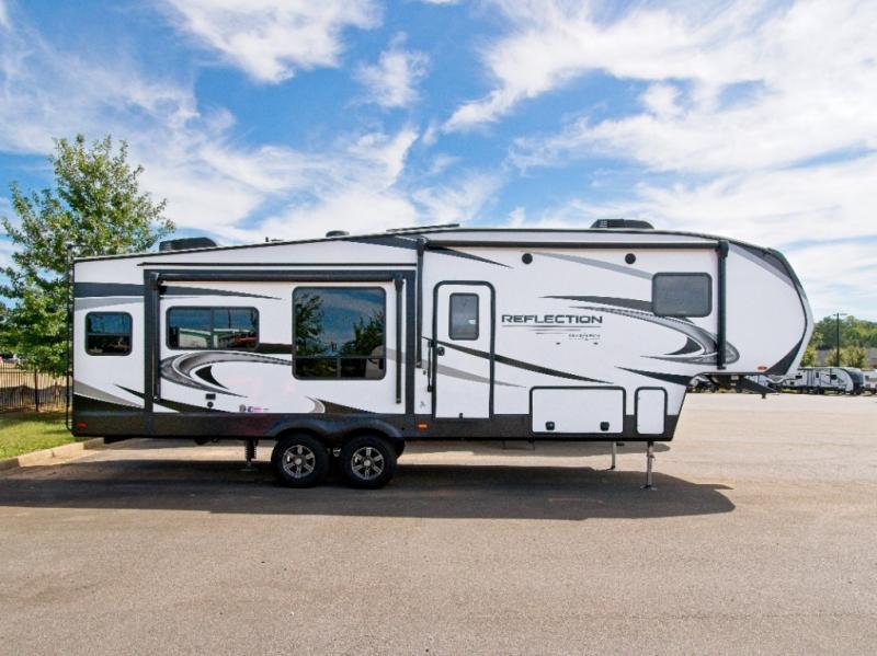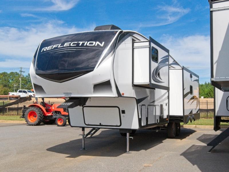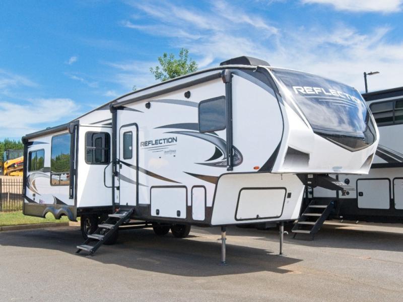 Reflection fifth wheels are engineered for durability and comfort with MORryde 3000CRE suspension, Arctic 4-Seasons Protection Package, and Compass Connect smart control system. The Solar Package supports off-grid camping, while the AXIStep entry system ensures safe and easy access.
