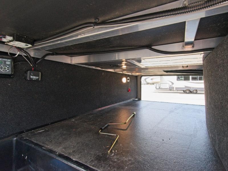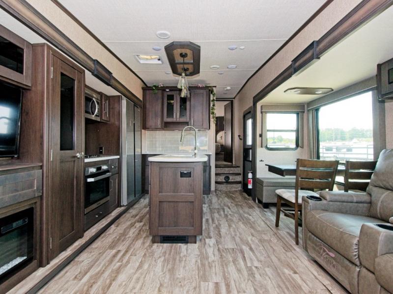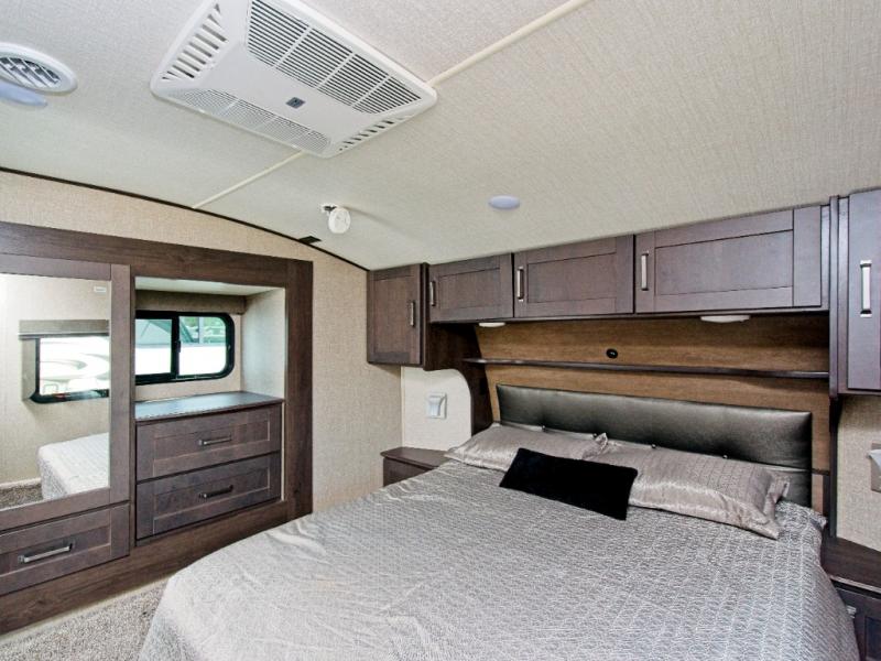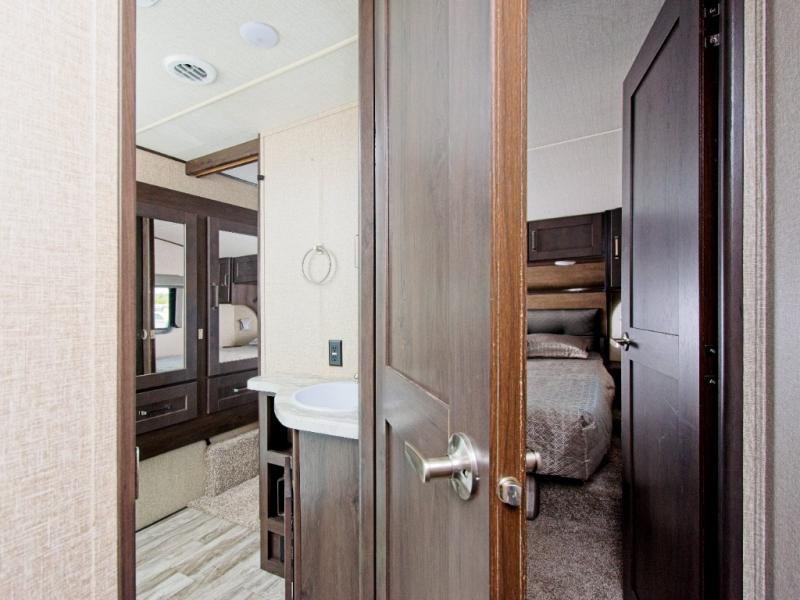 The kitchen island adds prep space and convenience, while the 16 cu. ft. 12V refrigerator, full pantry, and hutch provide ample storage for food and cookware. The double-entry bathroom connects to the master bedroom, which features a queen-size bed, wardrobe slide, and additional linen storage that extends into the bath.
