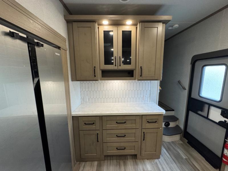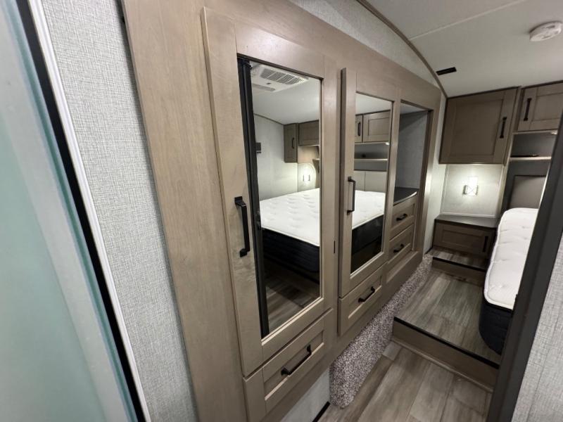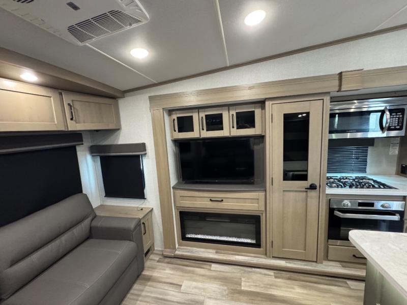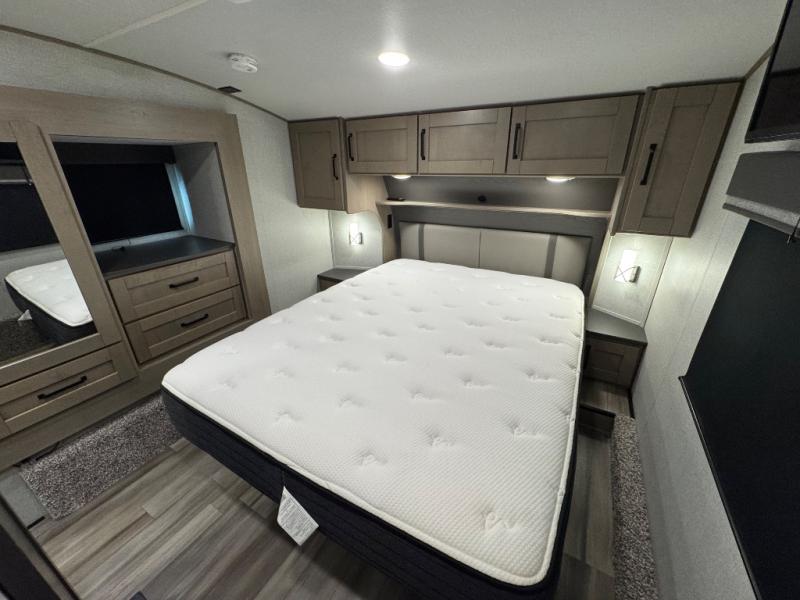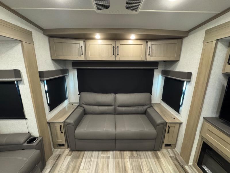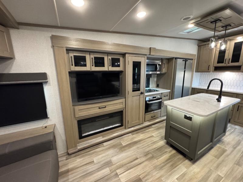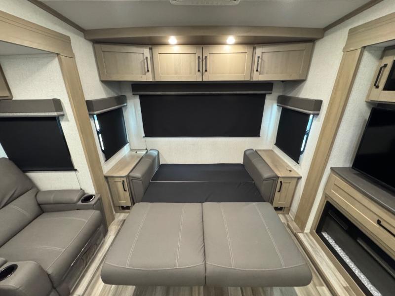 Whether you travel for pleasure or work, you will love the spacious main living and kitchen area with a rear tri-fold sofa that doubles as extra sleeping space, and the theatre seating directly across from the entertainment center with a 40" LED HDTV and a fireplace below. The kitchen island will make meal prepping and drying the dishes easier and the hutch is the perfect place to place your picture frames, nice dishes, and extra cooking items. There is even a pantry that is big enough to store all of your favorite snacks, dry ingredients and such. Outside you can enjoy two electric awnings that provide protection from the elements as you relax and visit with other RVers, and your camping chairs can easily be stored in the pass-through compartment. The double entry bathroom is convenient especially at night when you can slide the door to enter from the front master bedroom. You will find plenty of storage for your clothing and gear, plus the bedroom slide out gives you drawers and linen storage that stretches into the full bathroom.